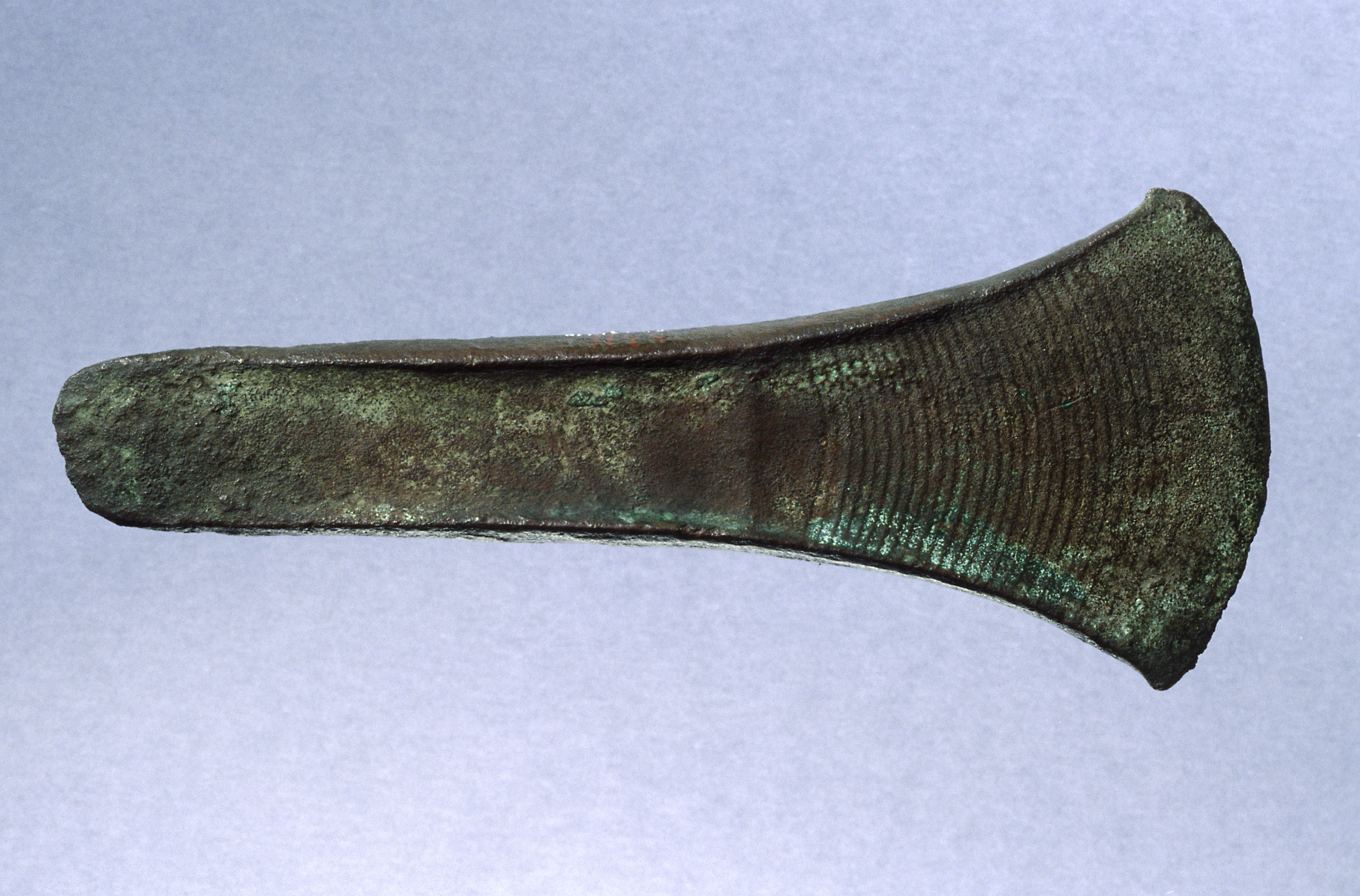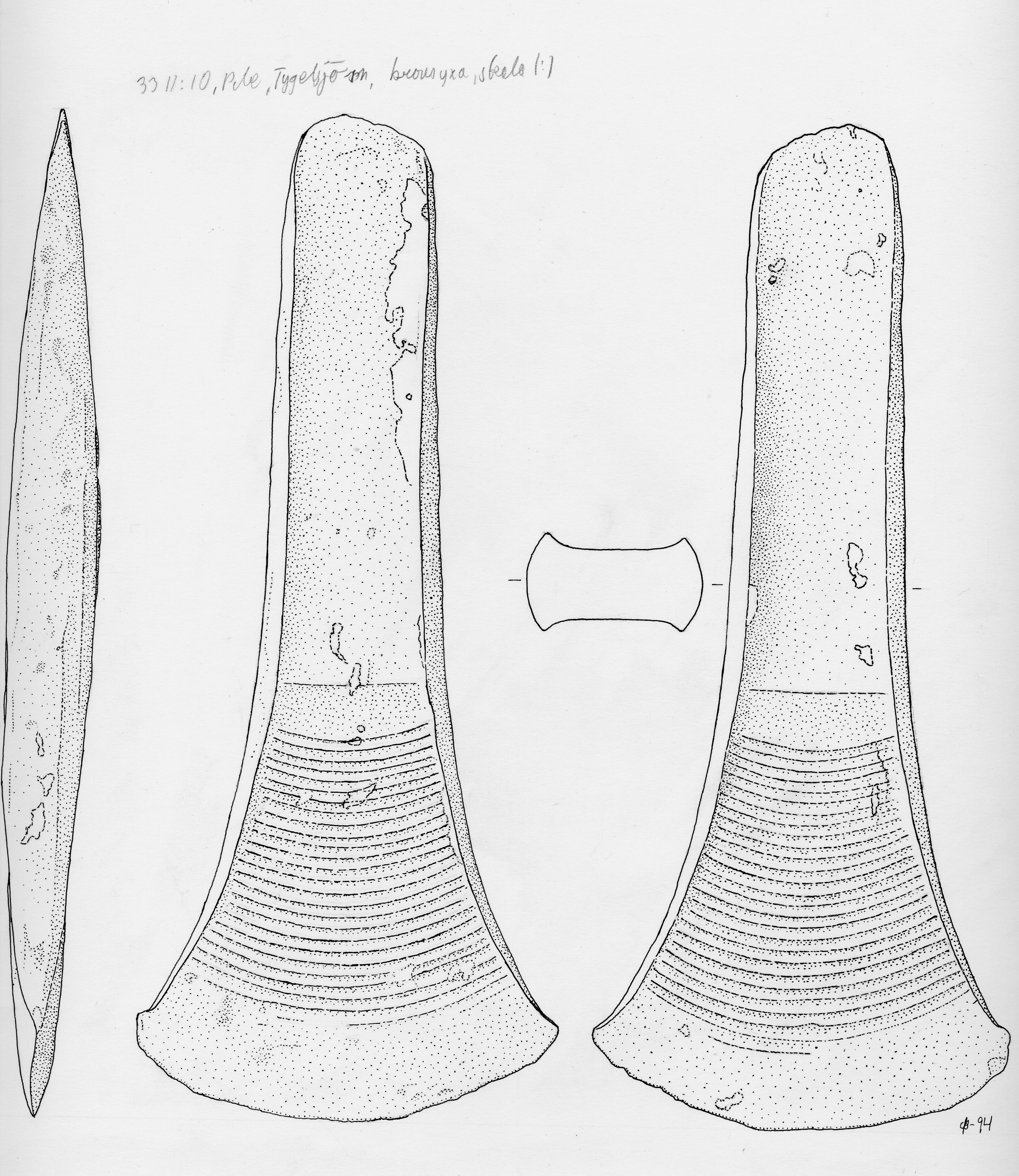 Kantyxa av brons med relativt svagt utvecklade kanter. Eggpartiet är på båda sidorna försett med inpunsade parallella linjer.