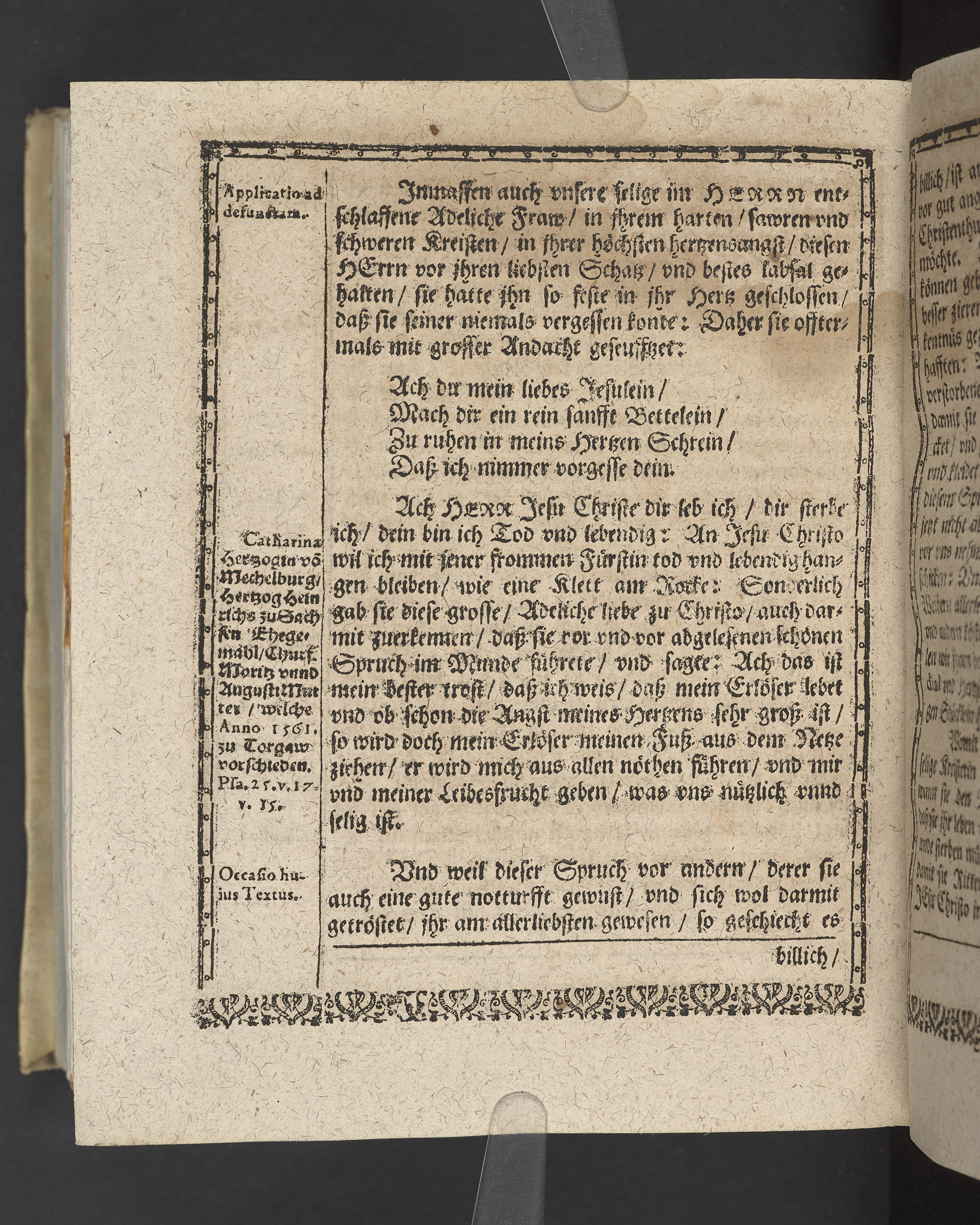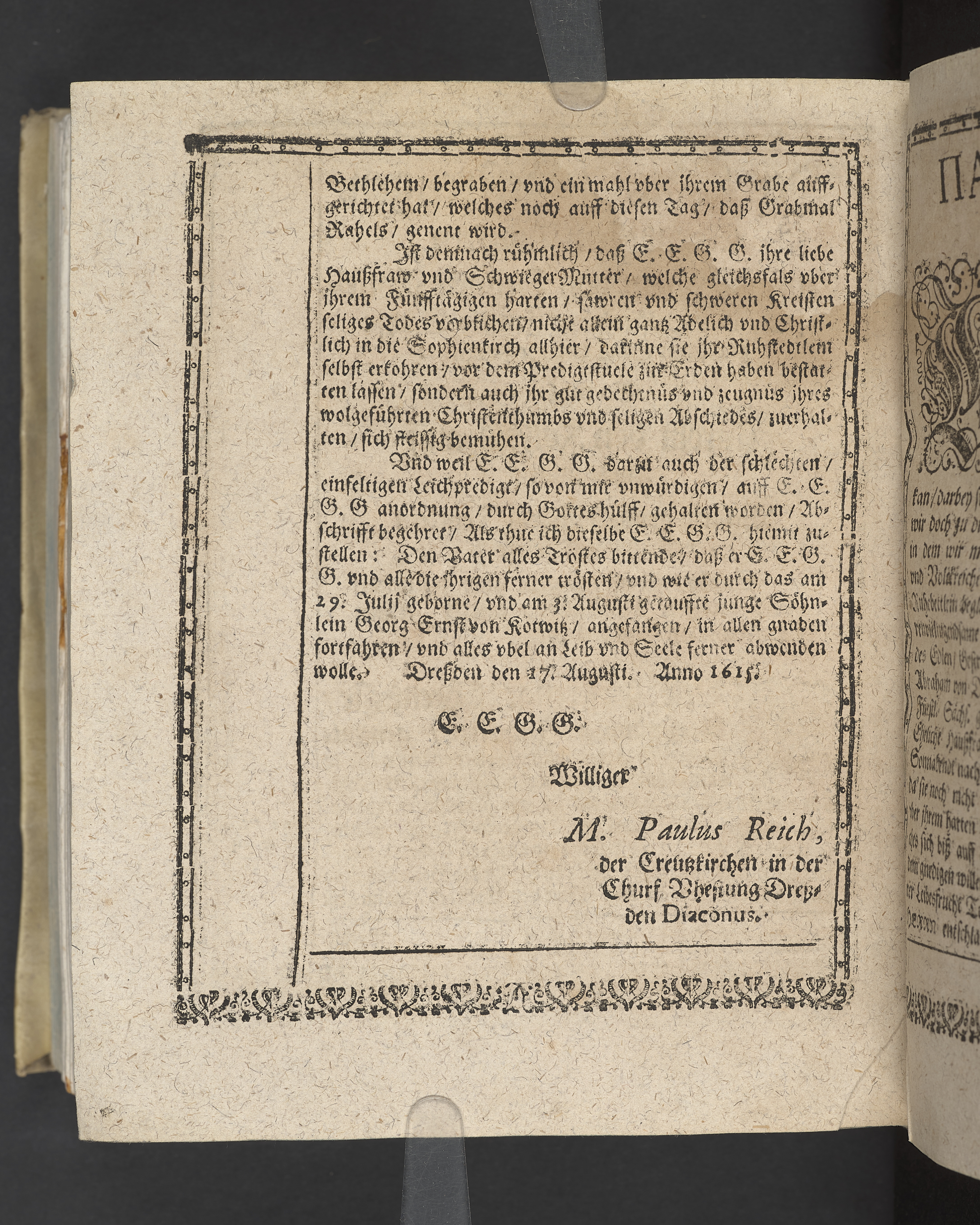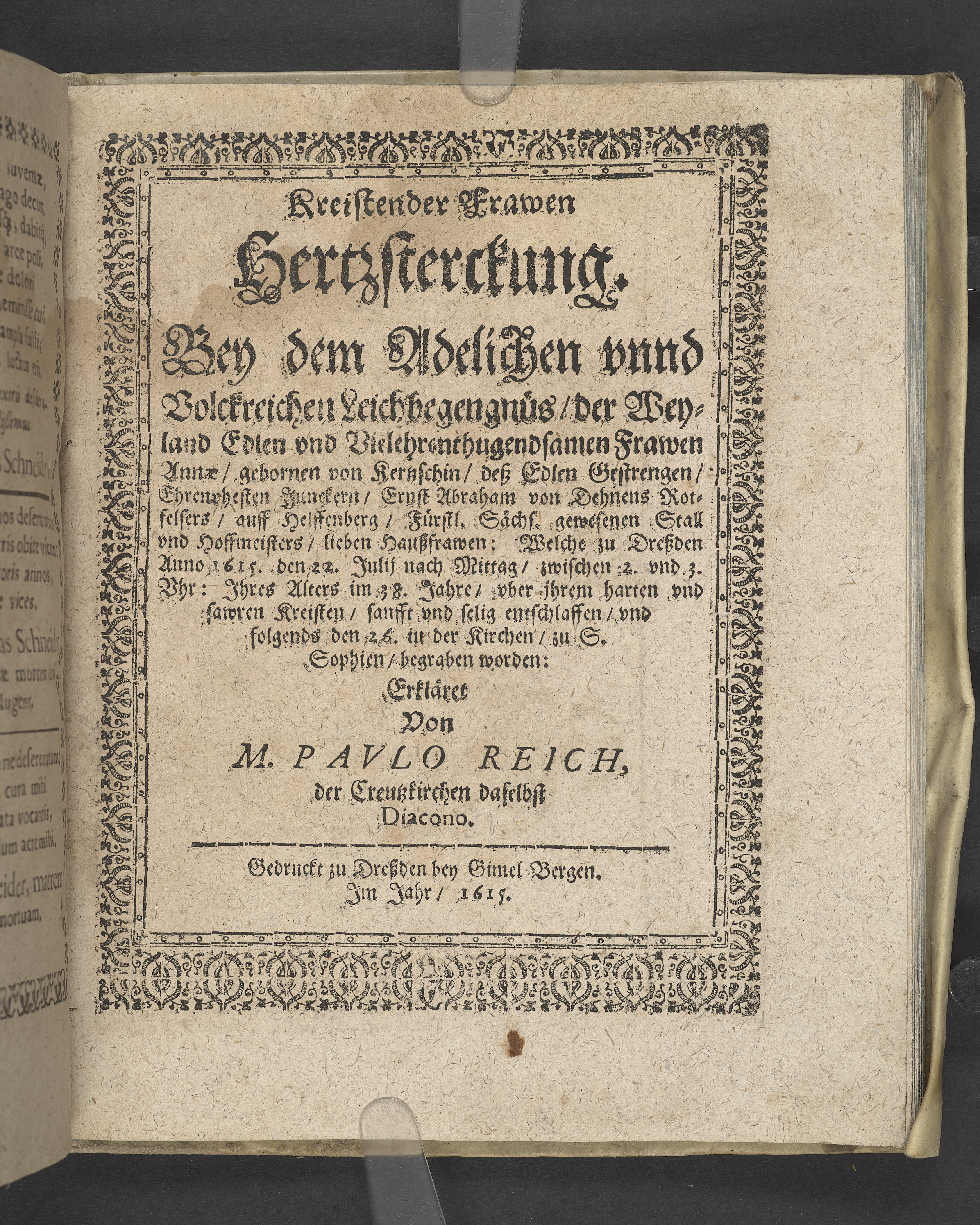 Kreistender Frawen Hertzsterckung. Bey dem Leichbegengnus, der... Frawen Annæ, geboren von Kertzschin, dess... Junckern, Ernst Abraham von Dehnens... Haussfrawen: welche zu Dressden anno 1615 den 22 Julii... entschlaffen, und... den 26. in der Kirchen, zu S. Sophien, begraben worden... Gedruckt zu Dressden bey Gimel Bergen... 1615.
