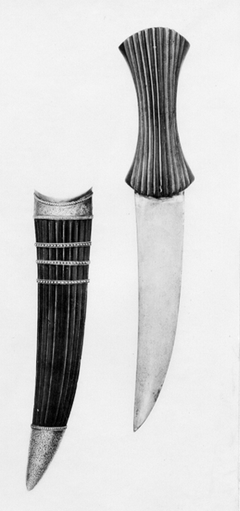 Balja av märkt brunt trä, på utsidan räfflat på längden och inlagt med smala tvinnade mässingstrådar mellan räfflorna. På baksidan två räfflor längs mitten. Beslag av förgylld vit metall graverade med förenklad ranka och kantade med rad av filigrankulor. Munbleck 20 mm där nedanför tre smala bandbeslag på baksidan förenade med munblecket med längsgående vriden ten med stämpel och liten ögla för bärrem. Doppsko 51 mm.