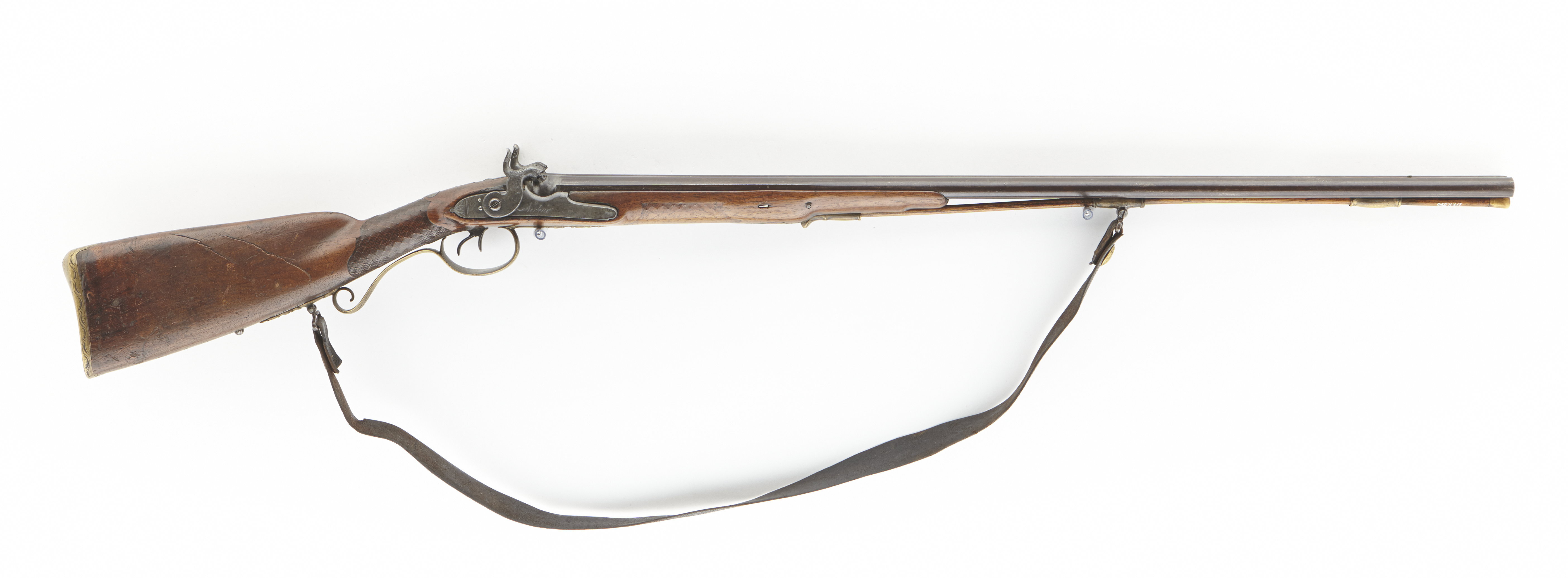 På ovansidan brunerad, slätborrad dubbelpipa av stål, förenade med skålad överspång. Piporna baktill förlängda 24 mm med brunerat parti med urtag för tändhattsnipplar. H. pipa stämplad på undersidan L D. Två rörkor av mässing, på den bakre rörkan en rembygel av stål. Riktmedel: Knoppkorn av mässing. Fästning: Ett häfte på vardera pipan. Pipan fäst med baskylhakar samt ett engelskt pipstift av stål. Baskyl med brett skålat sikte, baskylblad avsmalnande i en avsats, graverad dekor, krysskruv med graverat huvud, Flintlås ändrade till slaglås, smala låsbleck med försänkt bakspets med liten rund ändplatta, graverad bladdekor på bakspetsen. Platta hanar, slaghuvuden graverade som odjur, nätskurna tumgrepp. Graverad signatur, på v. bleck: "Guillaume" på h. bleck "Berteur". Länk mellan nöt och slagfjäder. Fästning: En låsskruv från v. bleck. Böjda blånerade avtryckare. Halvstock av ljusbrunt trä, kolv med kindstöd med rak nederkant. Kolvhals med nätskuren dekor, konturerad kant, inslagna silverstift. På framstocken fält med nätskuren dekor som på kolvhalsen. På kolvhalsens ovansida oval silverplåt, däri ristat SZP. Beslag av mässing. Bakplåt med kort, rundad flik på kolvryggen, graverad dekor på fliken en fågel som sitter på en gren, runt kolvänden bågrankor. Spetsrörka med konturerad spets graverad dekor. Konturerat avtryckarbleck. Varbygel med kort, graverad dekor. Kluven bakre stolpe, s-formigt svängd bakre arm med spiralformig stolpe, profilerad spets. På spetsen den bakre rembygeln. Bakom varbygeln en spik med välvt kannelerat stålhuvud. Tillbehör: Laddstock av trä, L: 764 mm (avbruten) framtill hornskoning, L: 17 mm
