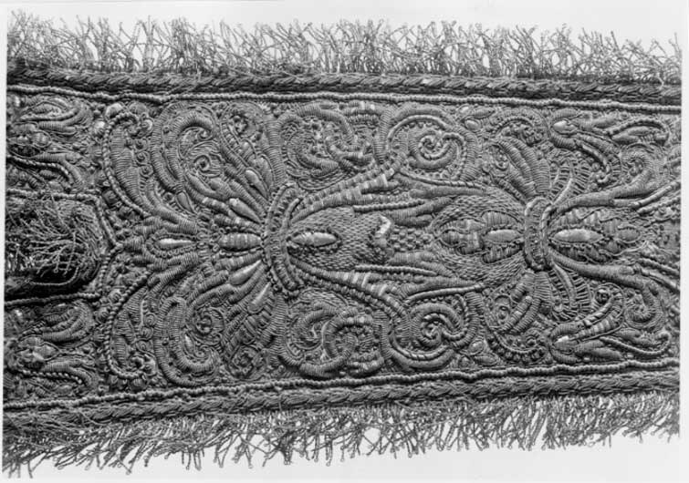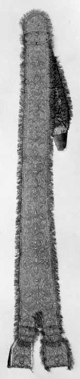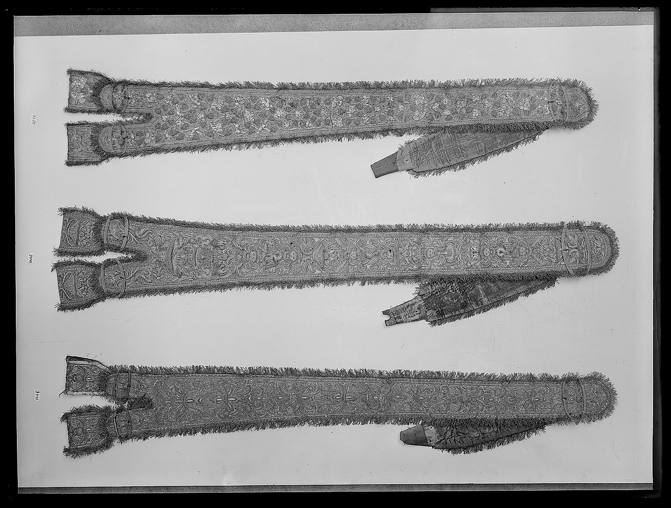 Gehänget består av 3 delar, den största i form av en utdragen triangel (likbent) 132 cm lång. Största bredden 15,5 cm nertill där den är kluven i 2 tampar vardera 13 cm långa och 6,5 cm breda. Nedanför denna är själva värjhylsan bestående av 2 öglor, vardera 9,5 cm breda (ytterst) och som täcks av broderade partier som är 13,5-14 cm långa (d.v.s. i kant med vikningen). Hylsorna är "upphängda" genom ett fastnitat 3,5 cm långt upptill kluvet järnbleck som böjts runt det ovala spännets (el. söljans) mitt-ten och här är också järntornen fästade som bakifrån och ut på framsidan trätts genom mittpartiet av de smala ändtamparna på gehängets långa stycke och vilar mot söljans övre kant. Tornen sticker rakt genom broderiet utan något speciellt "knapphål" eller träns, dess plats är 6,5 cm från tamparnas nederkant. Söljorna är 8 cm breda och 4,5 cm höga, de är av järn, klädda med guldtrådsarbetet. Söljan med klädsel är 0,4 cm i diameter. Hela gehänget är broderat i reliefsöm med guldtråd. Detta så gott som helt yttäckande broderi är utfört på mycket blekt blå sidenatlas. Vissa partier har en täckande bottensöm, som förefaller att domineras av gult silke - men även här är silkestråden omspunnen av en smal ten av guld. Broderiet är f.ö. sammansatt av guldkantilj (spiraler av platt lan), kontur bildas av en tvinnad guldtråd (med silkeskärna). I fyllningen ligger knippen av samlade smala guldtenar och dessa bildar stundom bottensömmar (rutformade), stundom i sicksack. Dessutom förekommer kraftigare strängar av spirallindade, 2 mm breda platta strängar h-omspunna med smala (trinda) guldtenar. Samma typ fast bredare, 3 mm breda av avklippta små bitar (varierande längd 5 mm ej ovanligt). På dessa ligger - mot insidan - en kantiljkrans av guldten) omgivande en topp av lanspiral. Dessutom finns krusiga strängar bestående av en tjock kärna av gult silke som omspunnits av tenar av gedigen metall ömsöm åt höger och ömsöm åt vänster, möjligen både silver och guld.En liknande typ av sträng fastän smalare ligger 2 och 2 parallellt tillsammans över bottensömmar av trinda guldtenar. Vissa partier, bladformationer och ovaler i centrum av motiven är utförda med 1,5 mm breda guldlan lagda i sicksack. Vissa kedjebottnar bildas av bågögda guldkantiljer i vars böjning ytterligare en kantiljsträng sytts ned. I ytterkantenav gehänget går en totalt 385 cm lång frans, 2,5 cm bred bestående av drejade guldtrådar, d.v.s. v-tvinnad, 2 kärnor av gult otvinnat silke, 2 nyanser dels klart gult, dels beigefärgat med h-spunnet guldlan. Vid överkanten av denna frans sitter en 8 mm bred kant arbetad med smala krusiga strängar som omger den mellersta som är något tjockare och består av silkeskärna som är glest spunnen åt vänster över den förra och själv glest "klädd" med en smal åt v-spunnen guldten. Bården är fastsydd med h-tvinnad beige silke i den övre kanten som avslutas med snodder av beige silkeskärna med h-tvinnad lan som har blekare guldglans. I den smala ändan av gehängets långa mittenstycke är en större sölja fästad, 11 cm bred -ty härigenom är gehängets hela bredd trädd, 6,5 cm hög och på samma sätt som tidigare nämnts har här gehängets tredje stycke (bakstycket) som är 47 cm långt upphängts. Broderiet täcker dock endast de mittersta 21 cm (synligt parti) och 9,5 cm på bredaste stället.Tornen i söljan går upp 12 cm i de långa styckets ände. Det tredje styckets övre parti som ligger under söljan är fodrad med vitt läder 9x8 cm. 21 cm är den broderad med guld och 12,5 cm täckt av den röda sammeten. Den yttersta spetsen är 5 cm lång och av vitt skinn på framsidan och brunt på baksidan. 1 cm från spetsens h. kant finns ett hål efter en spik. I den röda sammetens v.kant 7 cm från spetsen, sitter en trubbig spik den är 2,5 mm i diameter, 6 mm lång och dess huvud är 8 mm i diameter. På insidan av värjhylsan v.del 3,5cm från v.kanten finns ett likadant märke efter en spik. Gehänget består av fyra skikt. Det är klätt på insidan med ljusröd skuren sammet (ca 24x56 tr/cm2) som är mycket avskavd. Nästa skikt är av brunt skinn och härpå finns det grovt linnelärft (ca 12x8 tr. p/cm2) varefter guldbroderiet har lagts på. I guldbroderiet urskiljer man fyra rapporter, föreställande två stiliserade liljor i varje. De är utförda i samma mönster, i så småningom förminskad skala eftersom mittdelen upptill är 15 cm bred och nertill endast 9 cm.
