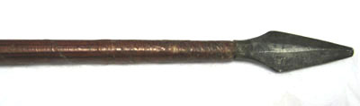 Skaft av obehandlad furu, framåt avsmalnande med cirkulärt tvärsnitt. Framtill spets av mörkt stål, l 38 mm, rombisk, dubbeleggad och med tånge. Inslagen i skaftet med lindning av ljusbrun näver? 85 mm upp på skaftet. Pilens bakre 275 mm målade i sex fält, silver, röd och blå med röda och silverfärgade romber i rader. Två styrfjädrar återstår, vita med brunt nertill. Silverfärgad bredare ände med rödmålad urtagning för strängen.