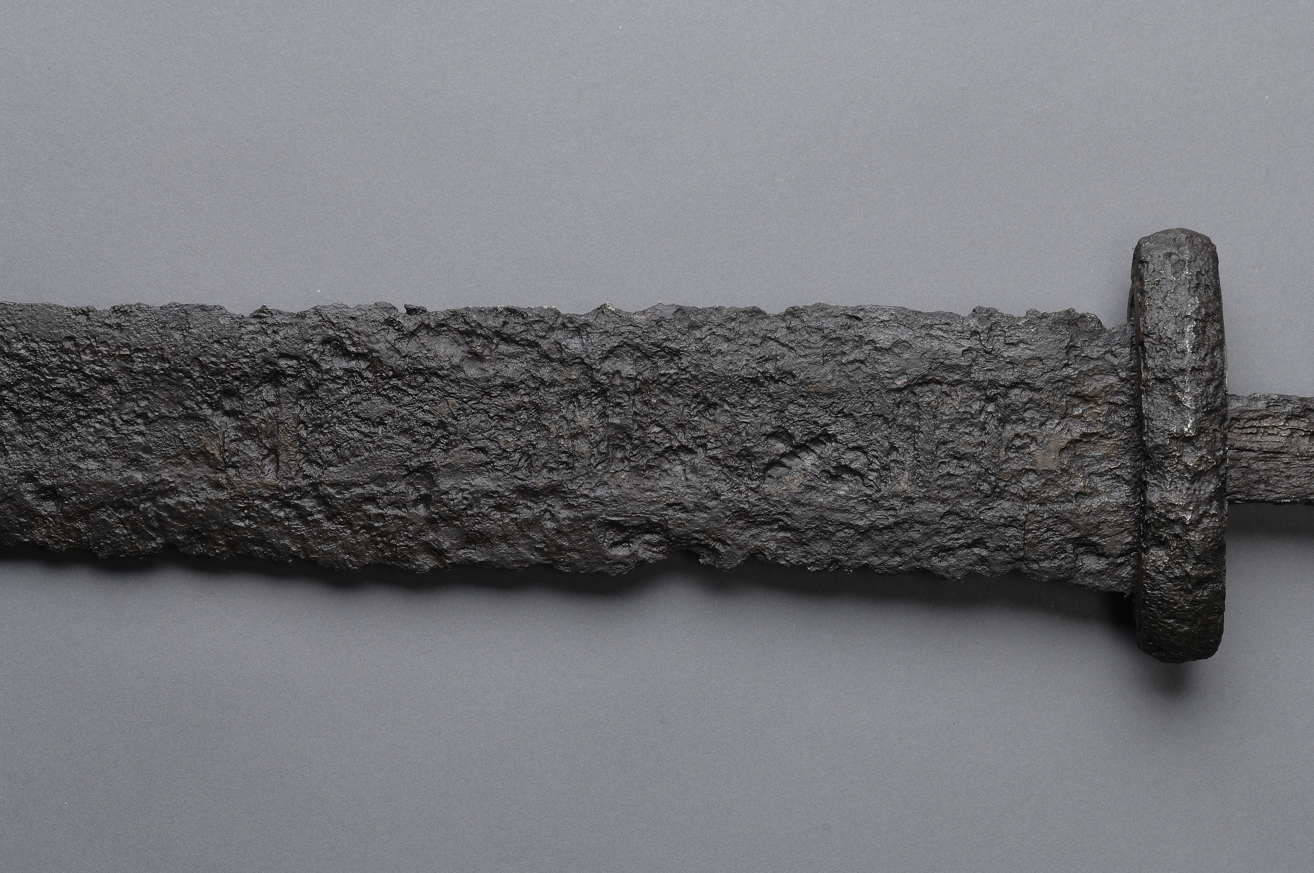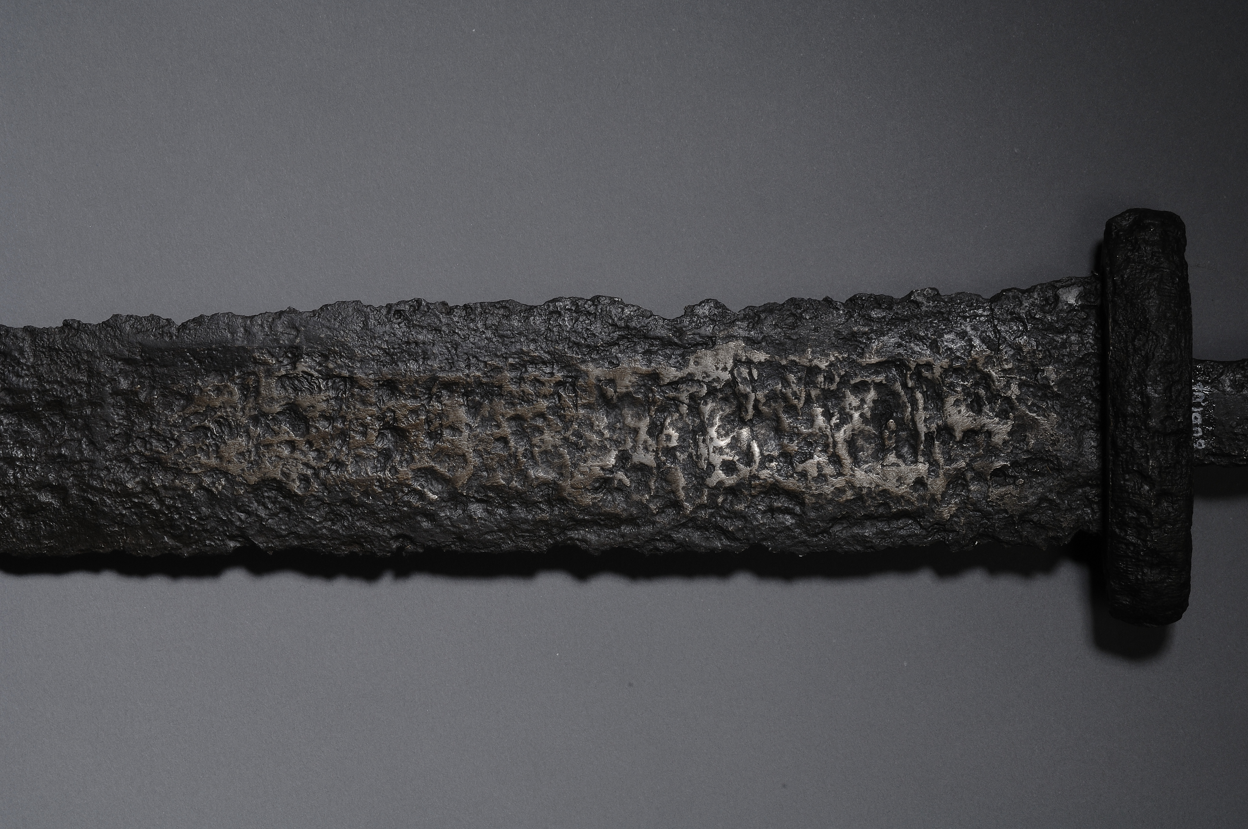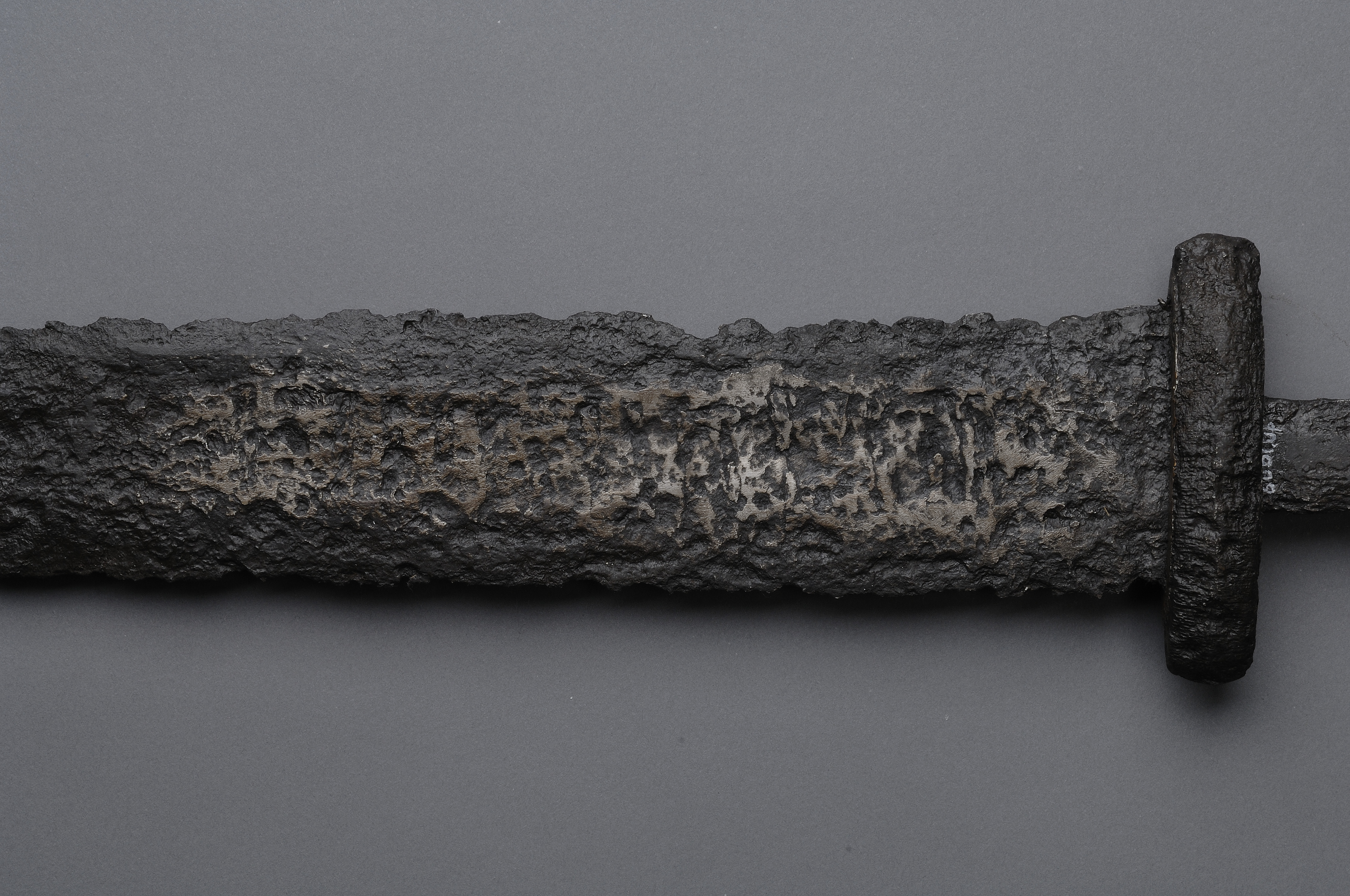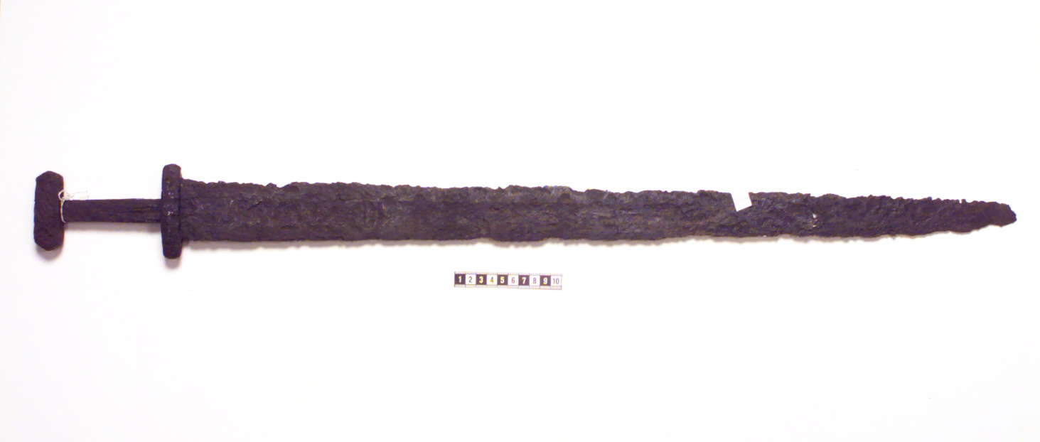 Tveeggat svärd med parerstång, knappens övre del saknas. Fästet har spår av inlagda guldränder och det finns rester av inskription på bladet.