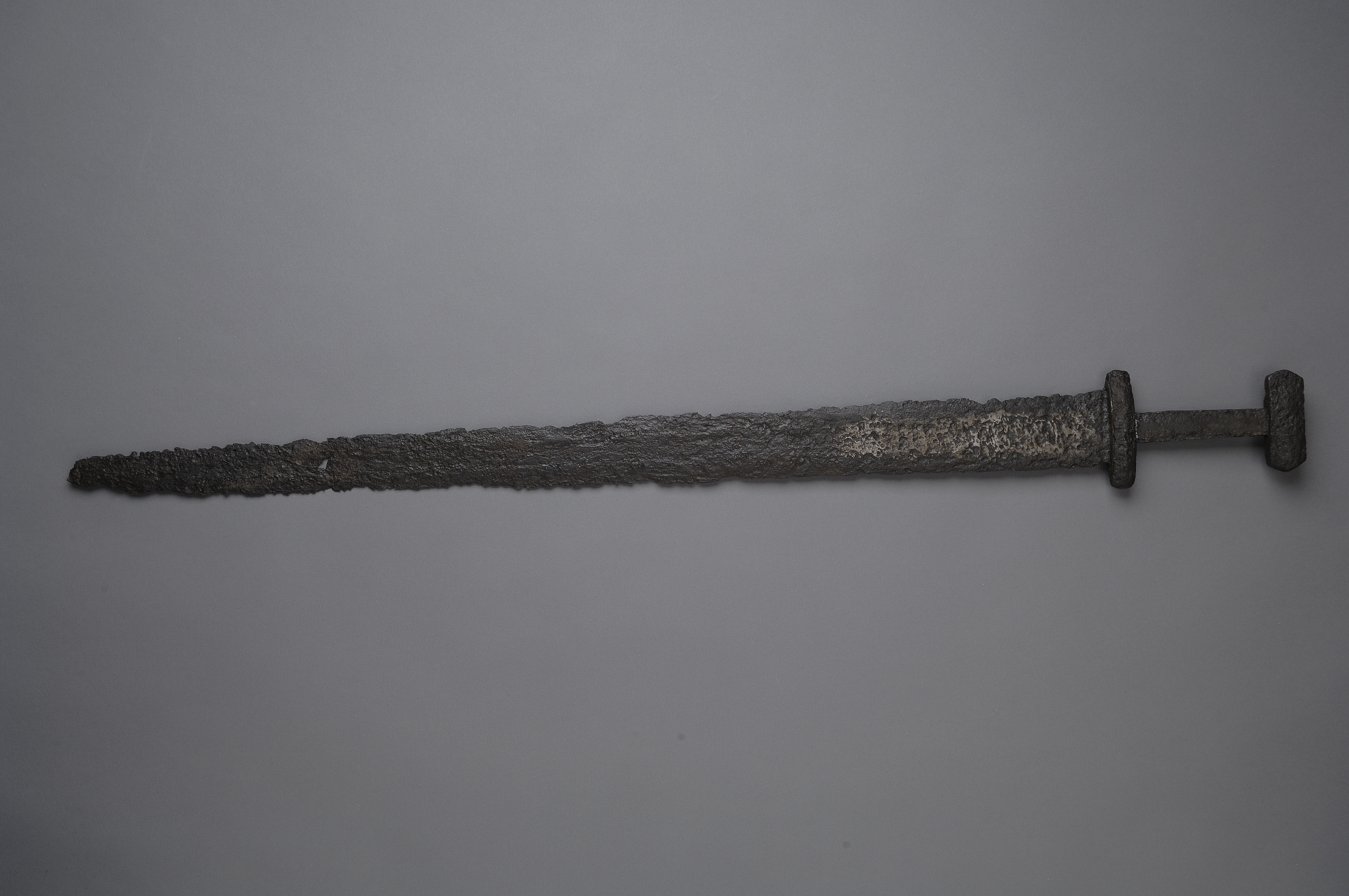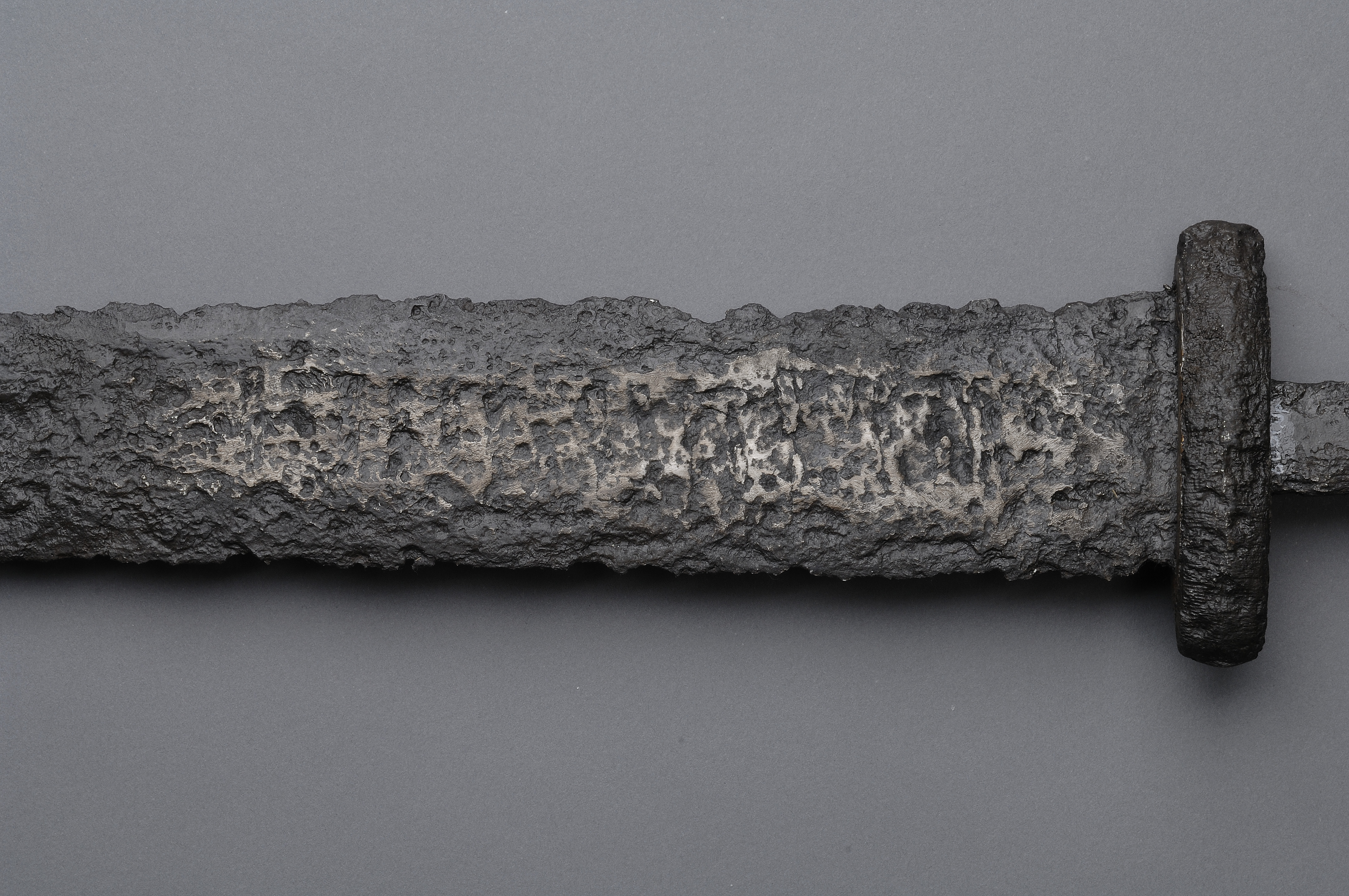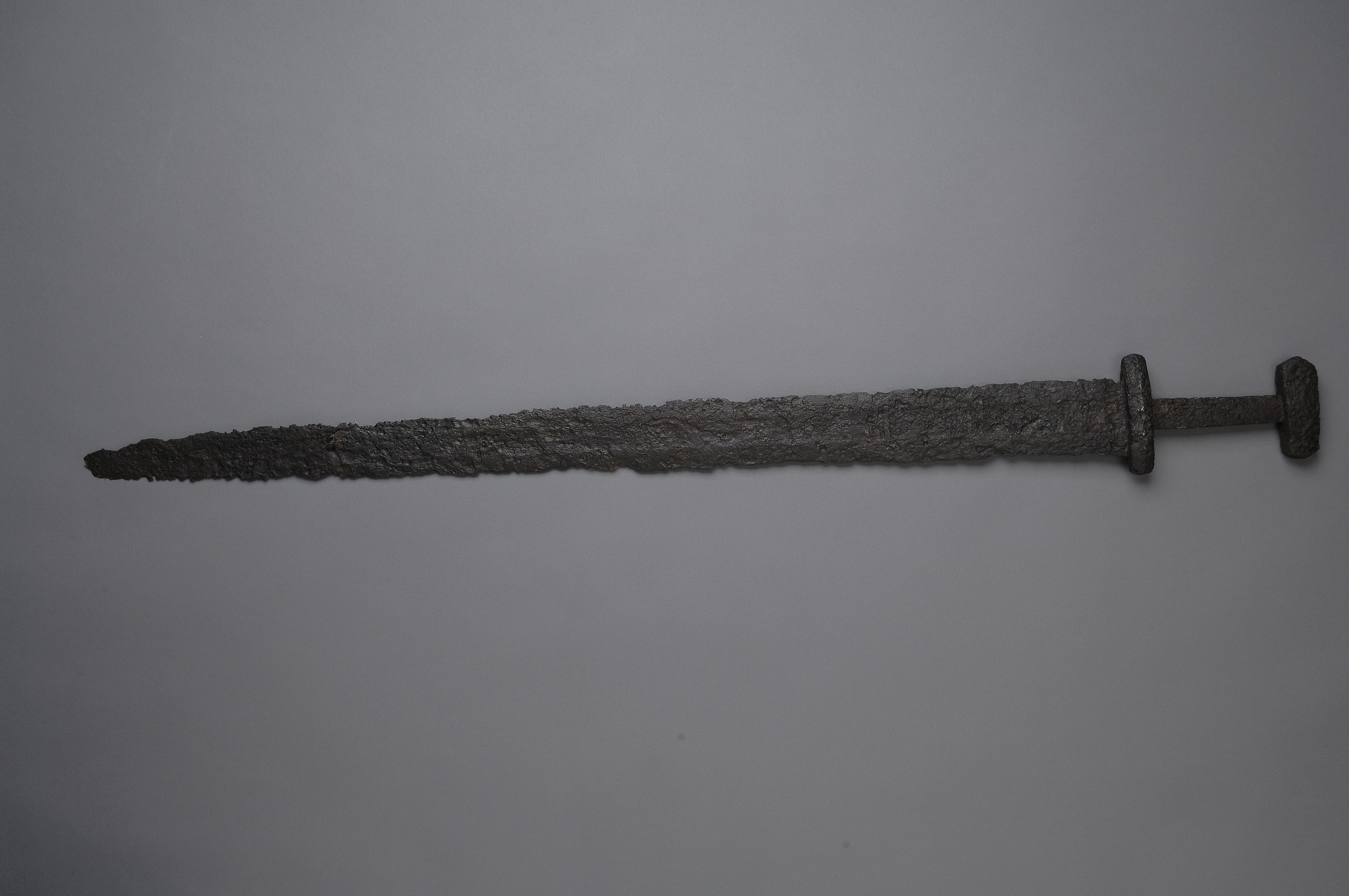 Tveeggat svärd med parerstång, knappens övre del saknas. Fästet har spår av inlagda guldränder och det finns rester av inskription på bladet.