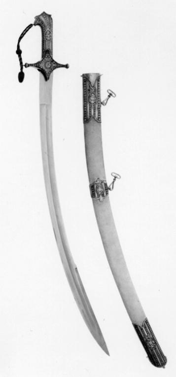 Balja av trä, klädd med vitt hajskinn. Munbleck 133 mm långt, mellanbeslag 61 mm och doppsko med symmetrisk skäpsko 148 mm av stål med dekor på utsidan i form av bårder av påslagna bladrankor mot blånerad botten och mitt på varje beslag på båda sidor en oval medaljong med blomstergrupp omgiven av lagerkrans och krönt av rosett. Beslagens kanter är uddformigt konturerade. På munblecket urtag för styrskenan. På munblecket och mellanbeslaget hållare med koppelhållare av stål.