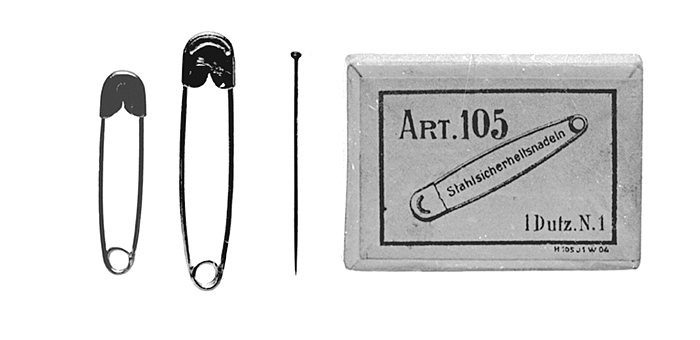 SÄKERHETSNÅLAR, 4 st, jämte 2 st KNAPPNÅLAR, i ask S ä k e r h e t s n å l a r: Av rundstavig ståltråd, omböjd på mitten i en spiral- formig fjäderögla. På ena delens ytterände en platt plåthylsa i vars ena sida en öppning för nålsudden. Längd: 2,7 och 3,4 cm K n a p p n å l a r: Av stål, med linsformigt huvud. Längd: 3 cm A s k: Av papp, klädd med glättat vitt papper. Rektangulär med utanpåliggande trycklock. På lockets översida en etikett med text i guld. Höjd: 1,1 cm; längd: 3,9 cm; bredd: 2,7 cm Inköpta av Wilhelmina von Hallwyl hos en handlande i Berlin. Dylika säkerhets- och knappnålar framlades i Stora kapprummet vid större fester till användning för gästerna.