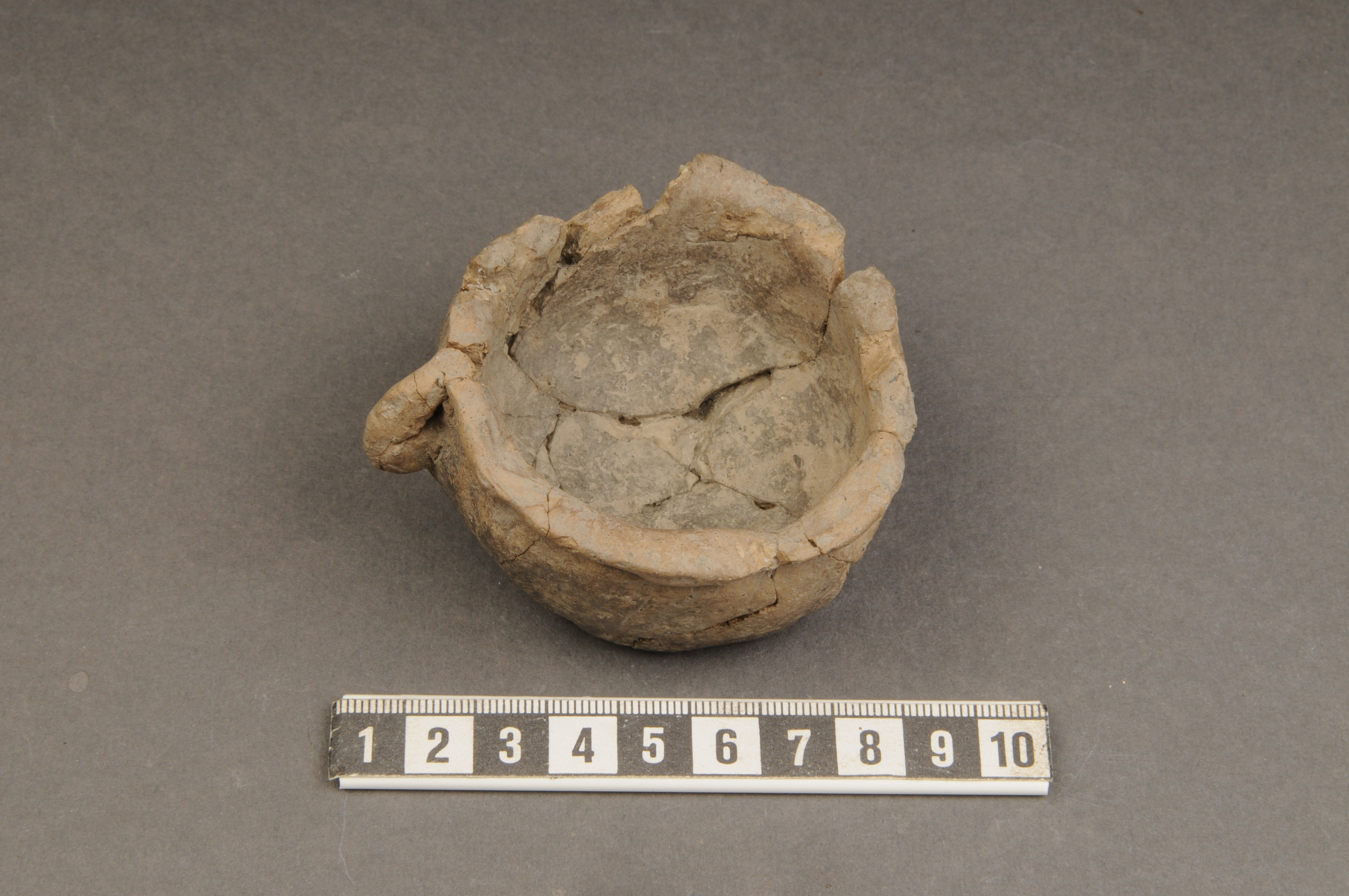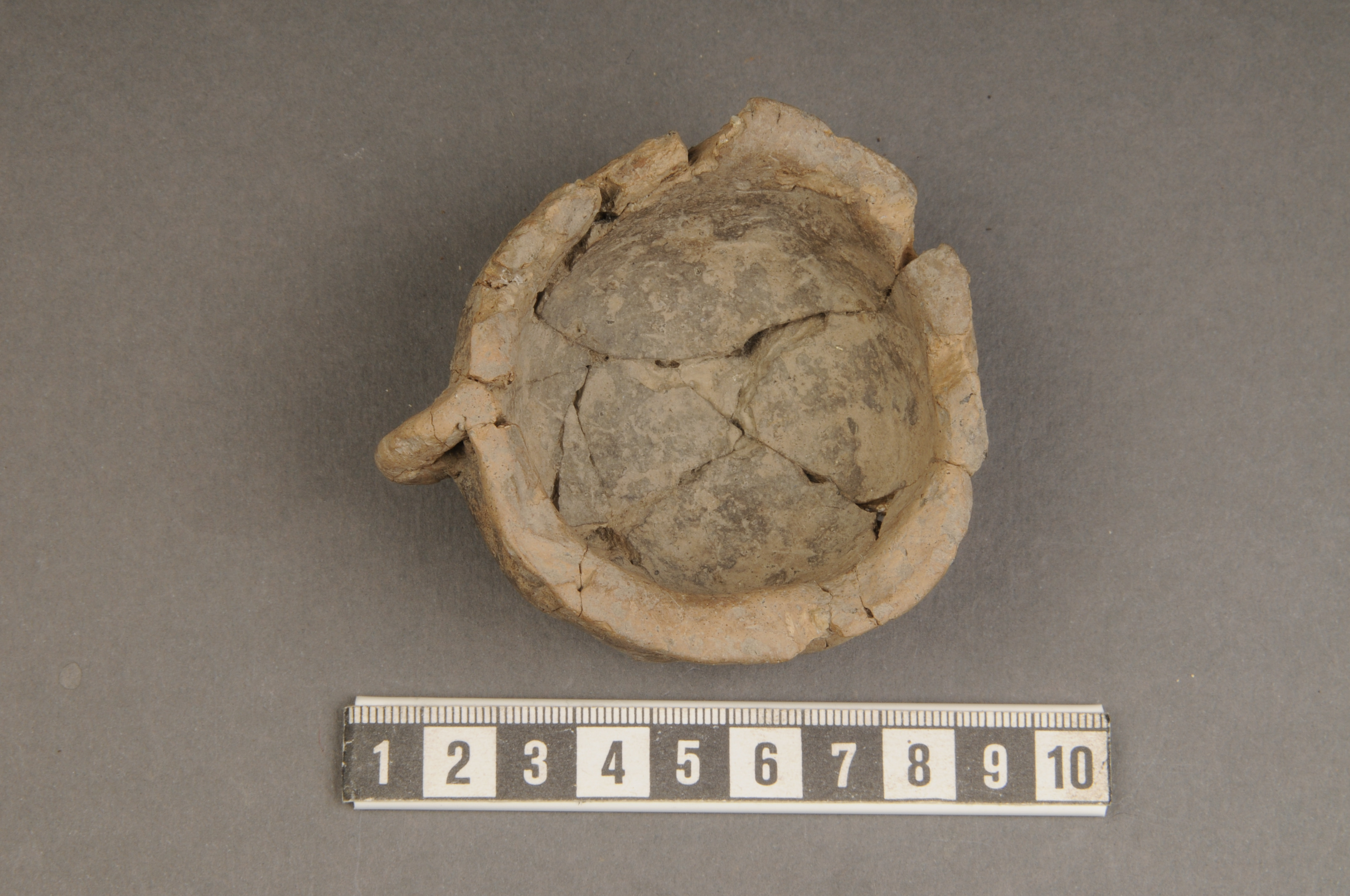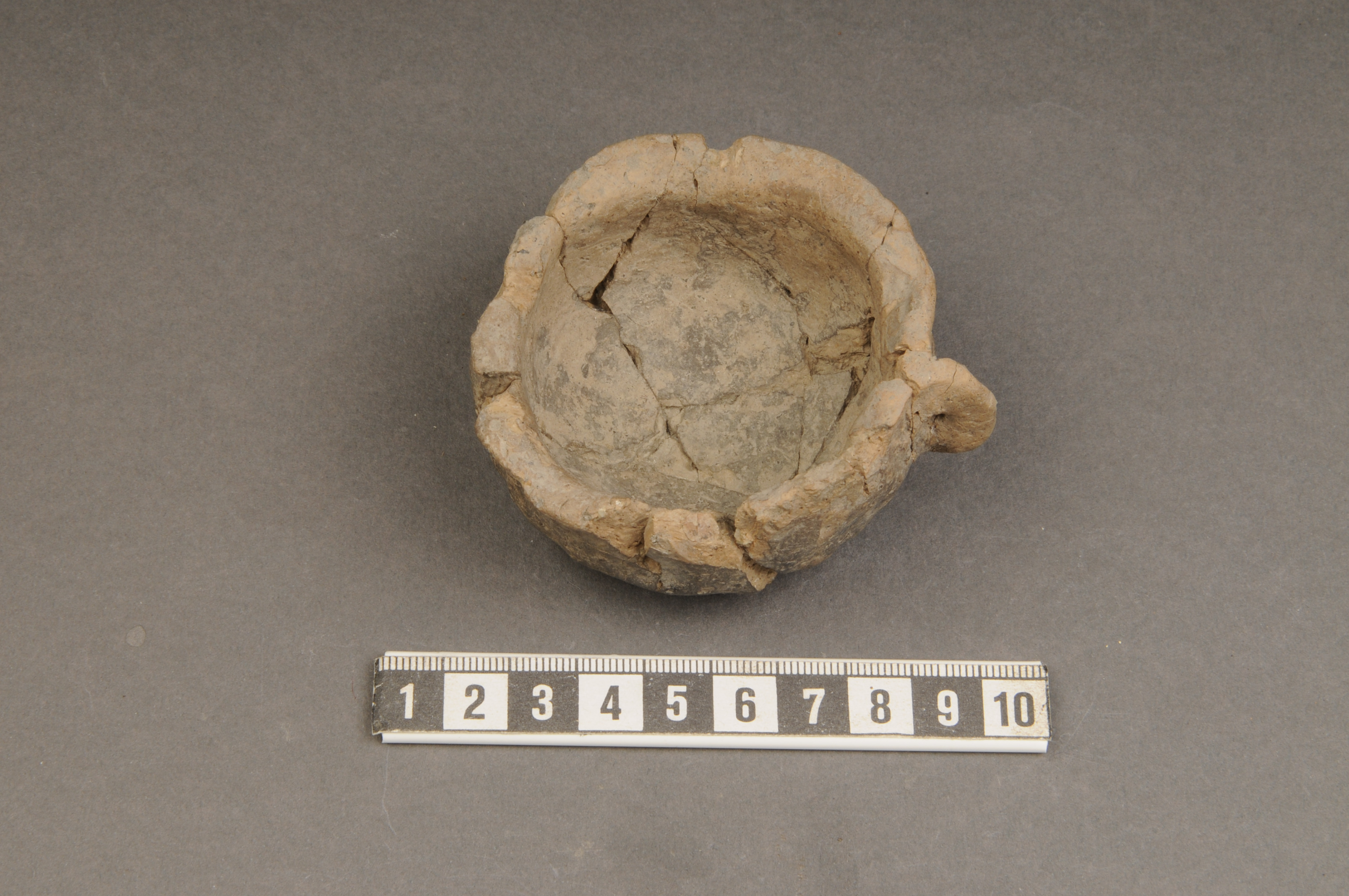 en lerkopp, rekonstruerad; med en hänkel/öra (genombruten)