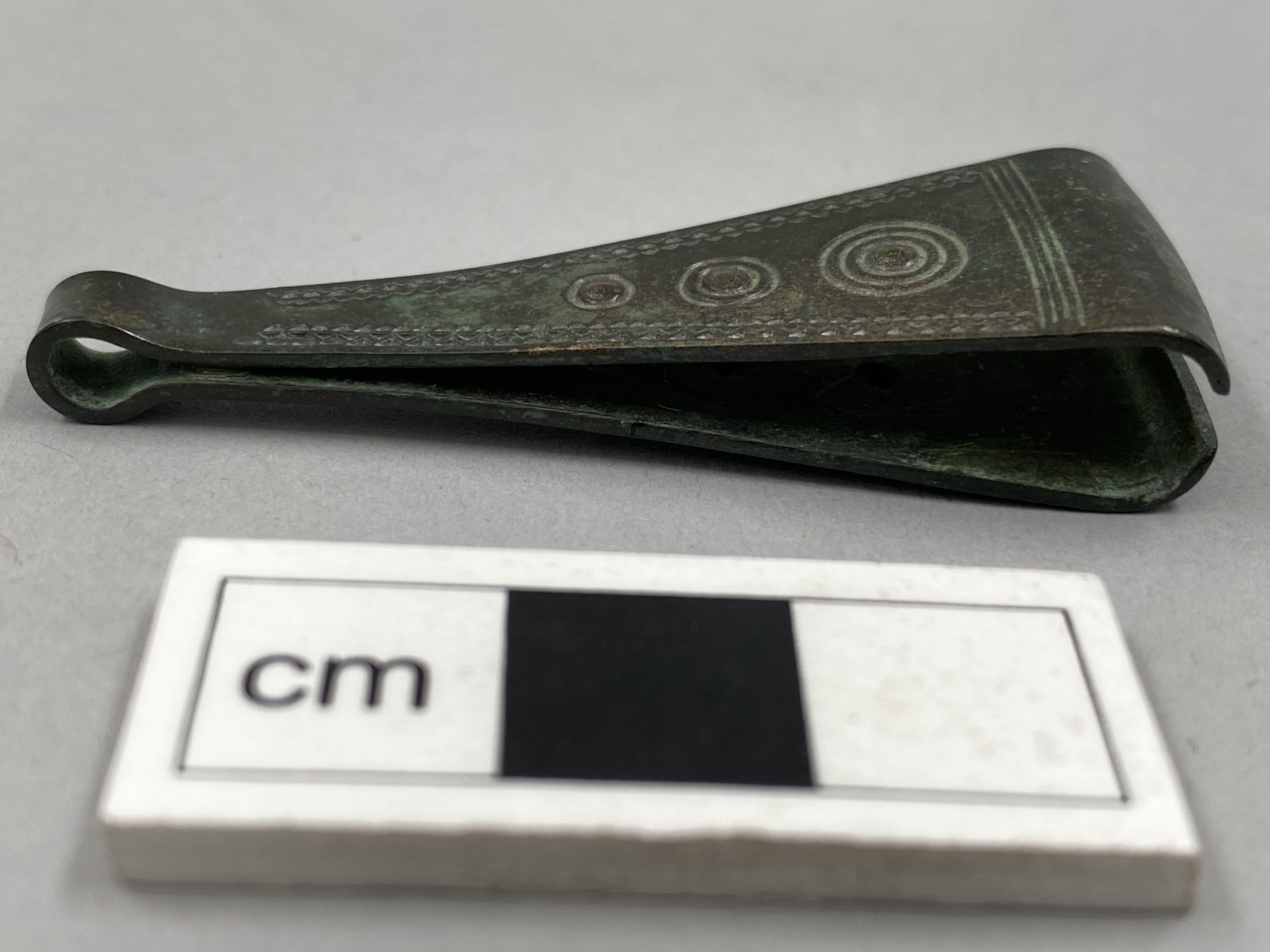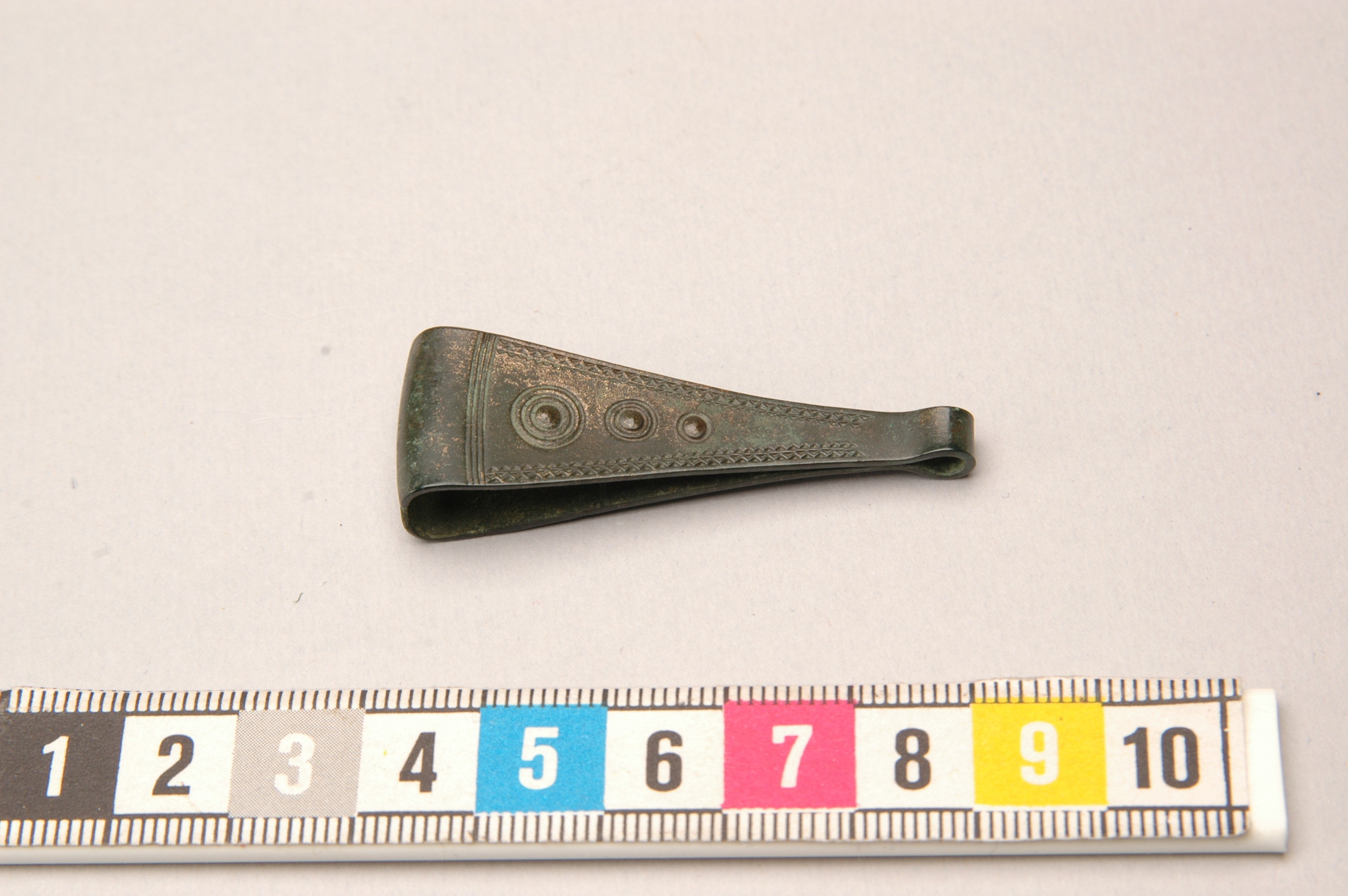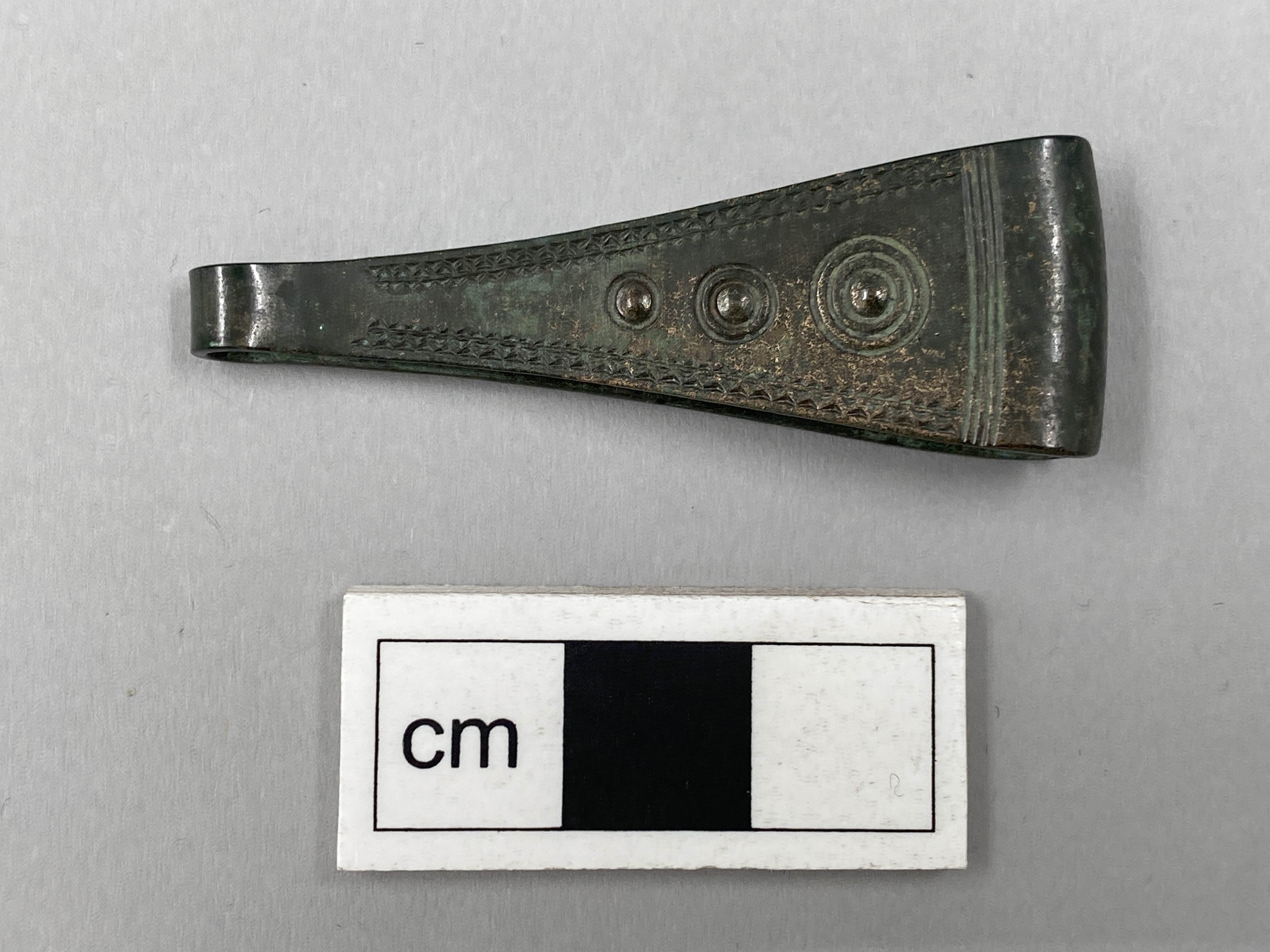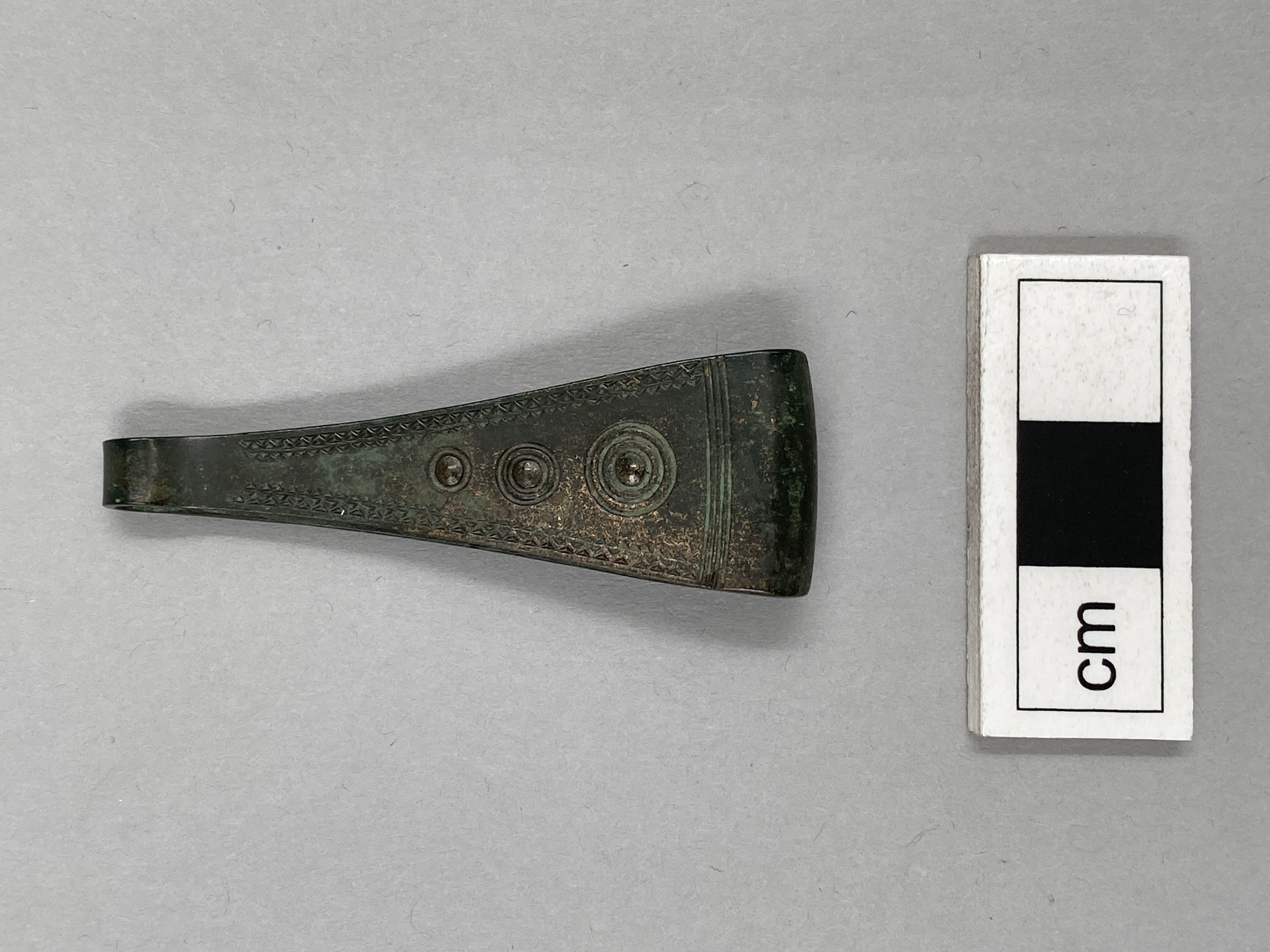 Pincett av brons. Den är ornerad på bägge sidor med i lodrät linje placerade cirklar, en enkel och två koncentriska. Utmed sidorna finns vinkelband, nedtill fyra parallella och tvärs över gående linjer.