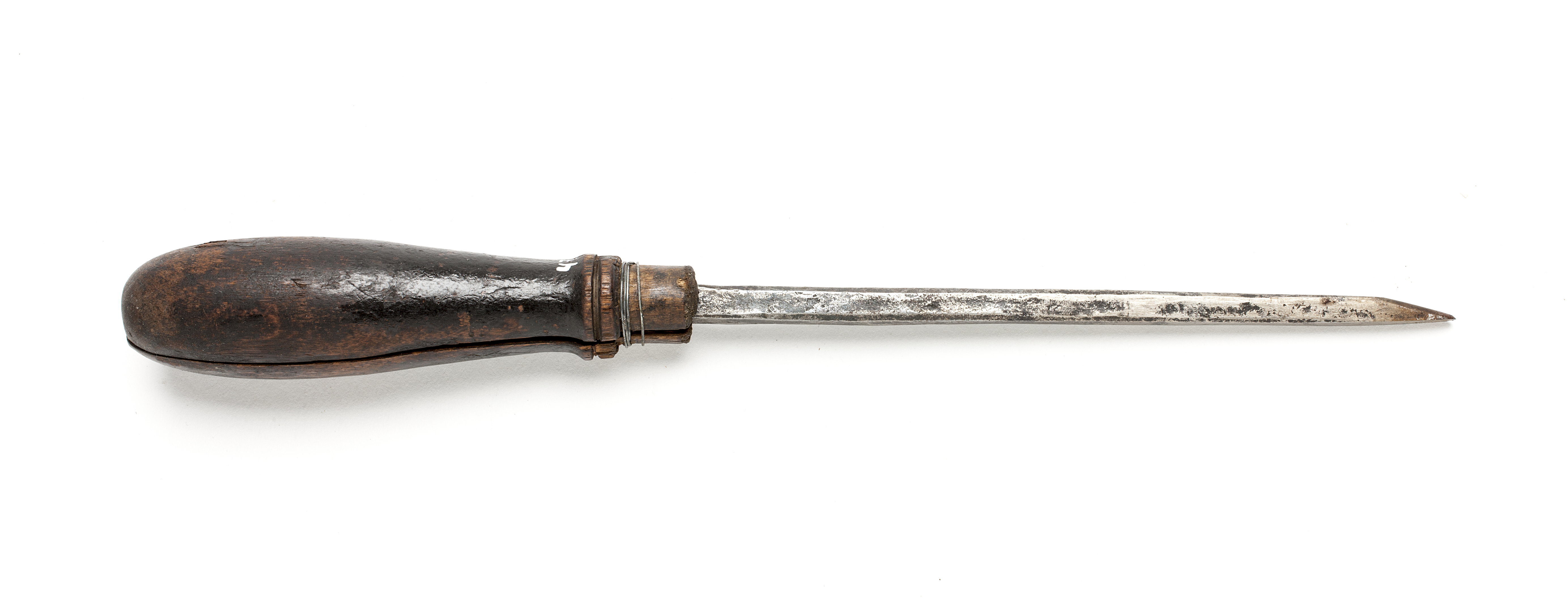 Klinga med rektangulär genomskärning, avfasade kanter. Svarvat skaft av lövträ med en vulst nedtill. Ringen bortfallen.