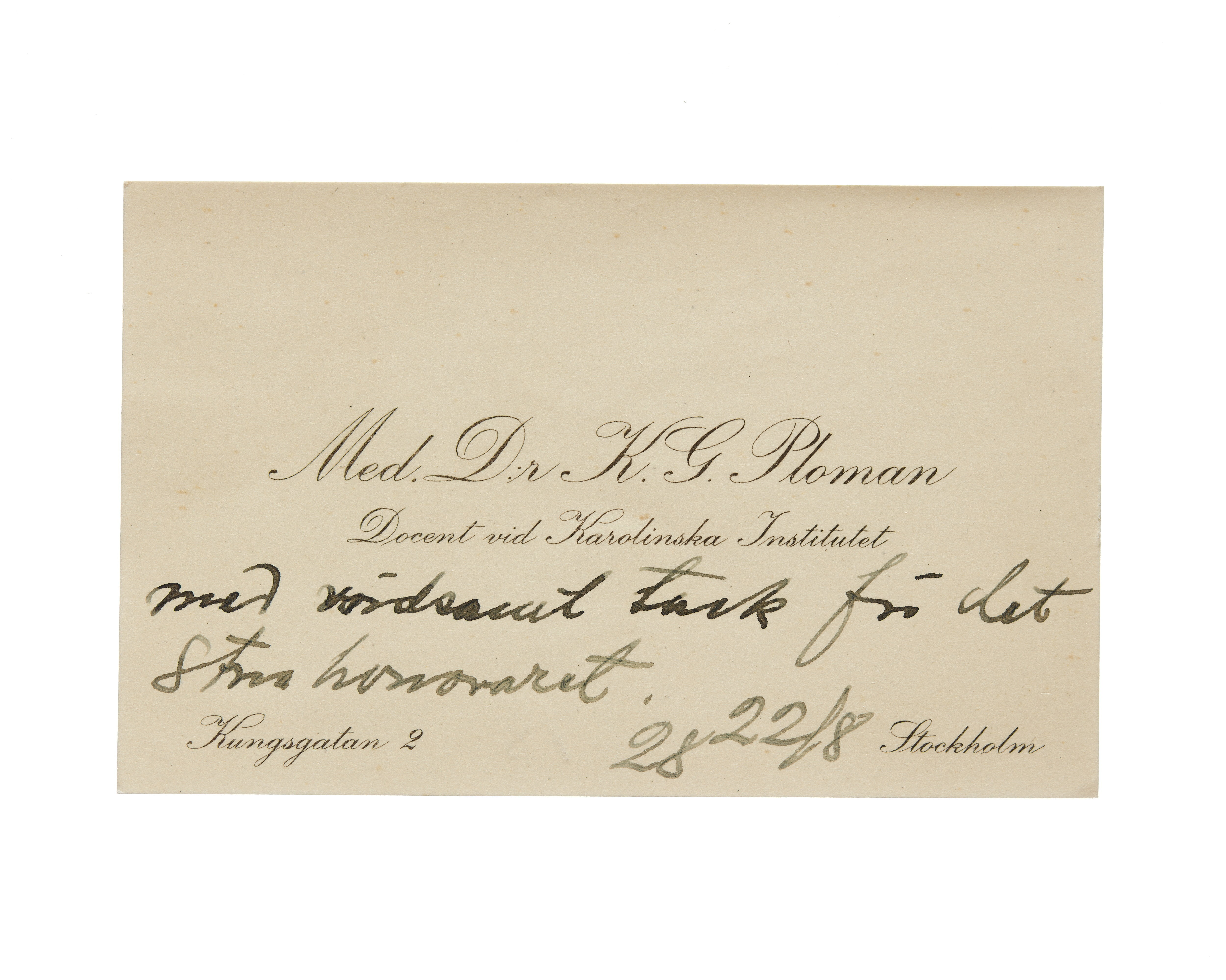 Två visitkort från Med. D:r K. G. Ploman, docent vid Karolinska institutet. Första kortet daterat 1928. Adress (nedre högra hörnet) Stockholm, (nedre vänstra hörnet) Kungsgatan 2. Handskrift "...". Andra kortet daterat 1930.