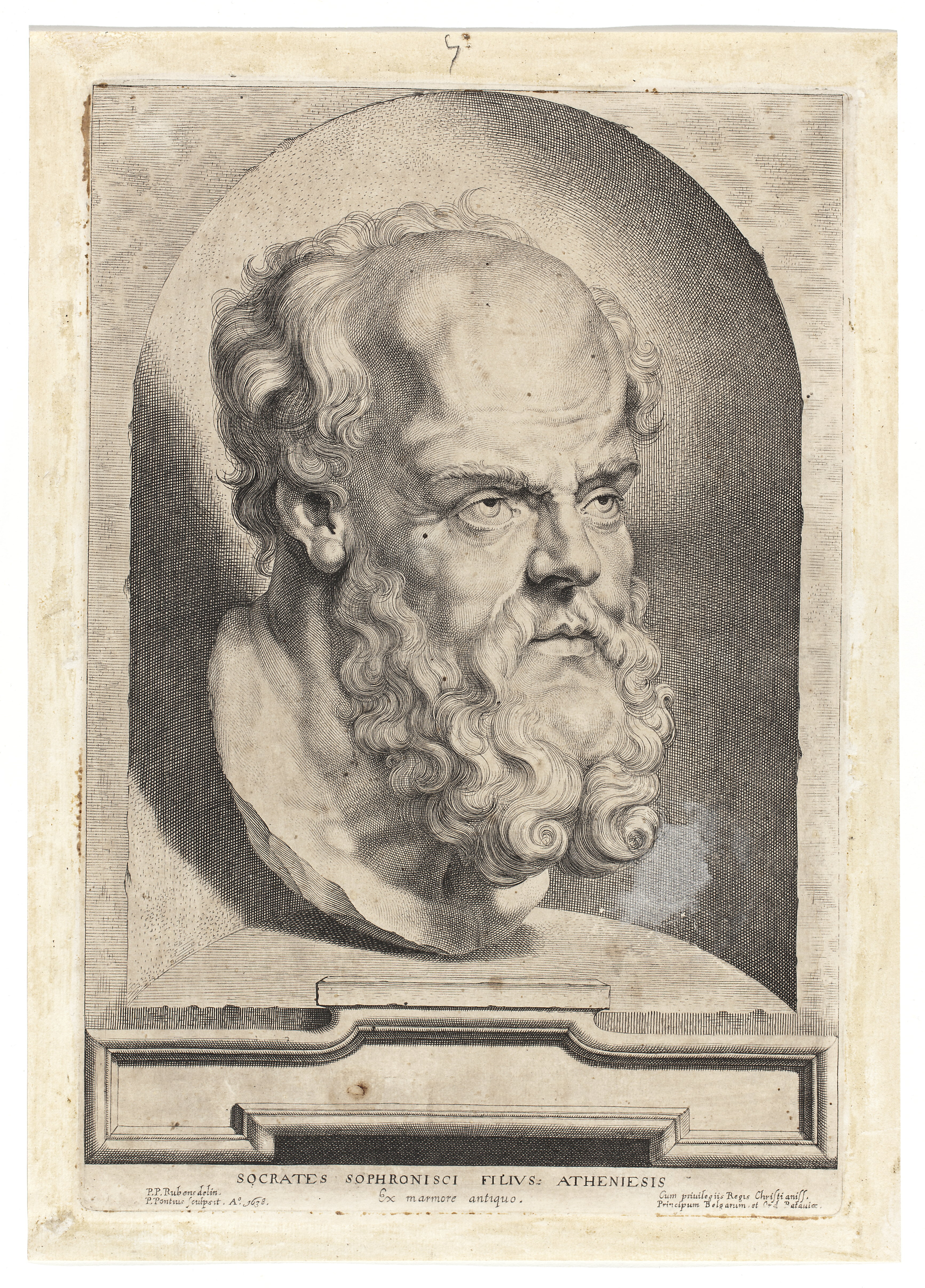 Kopparstick på papper. Sokrates framställd som marmorhuvud placerat åt höger i halvrund, välvd nisch. Under bilden text: "SOCRATES SOPHRONISCI FILIVS: ATHENIESIS EX marmore antiquo. Com priuilegiis Regis Christianiss. Prlncipum Belgarum, et Ord Batuaiae." P.P. Rubens delin. P. Pontius sculpsit. A:o 1638". Papperet klistrat på förgylld, profilerad ram med bandstav, bredd 20 mm. Bladet märkt "7" med blyerts i övre marginalen. Även ramen märkt "7".
