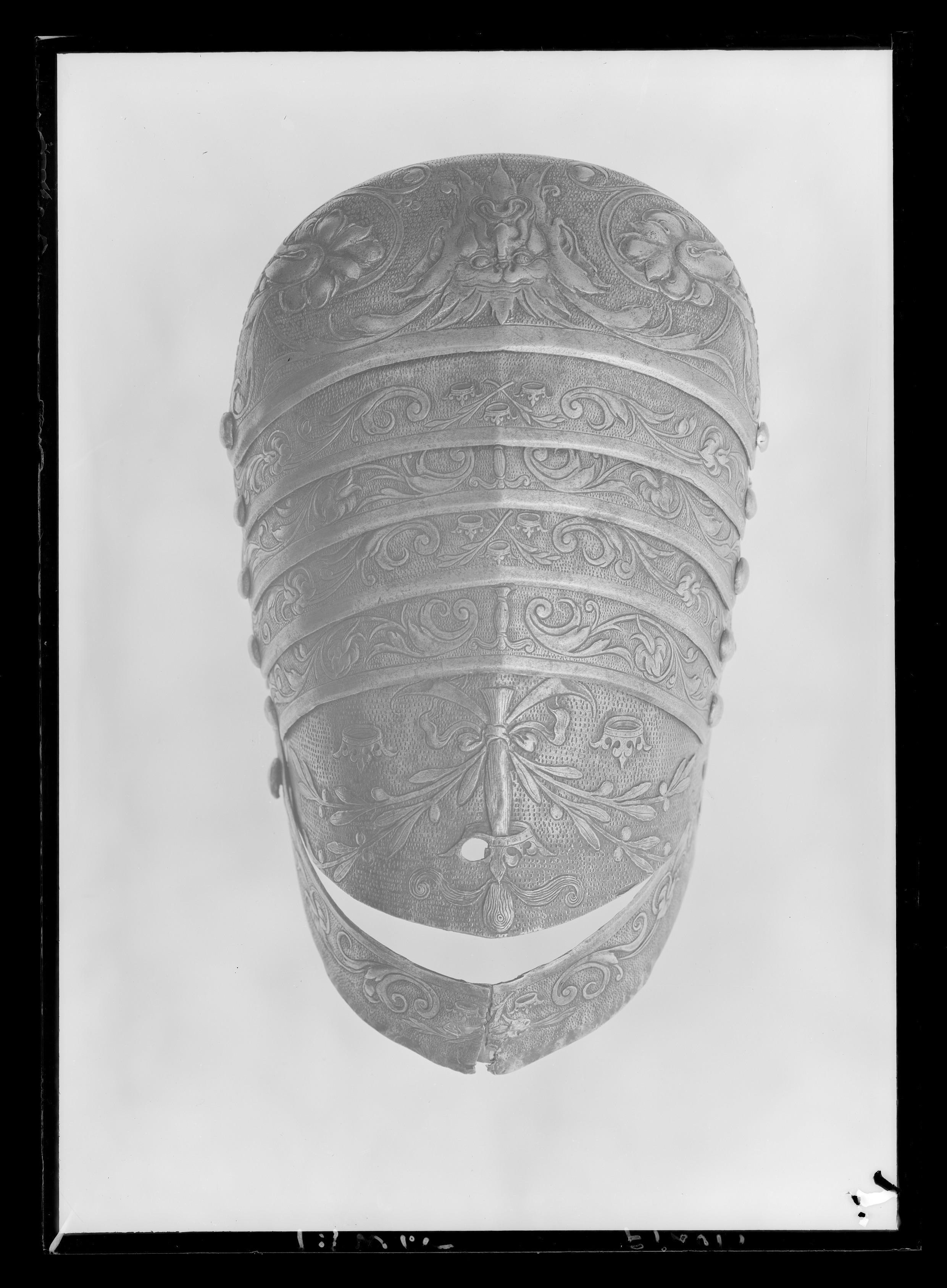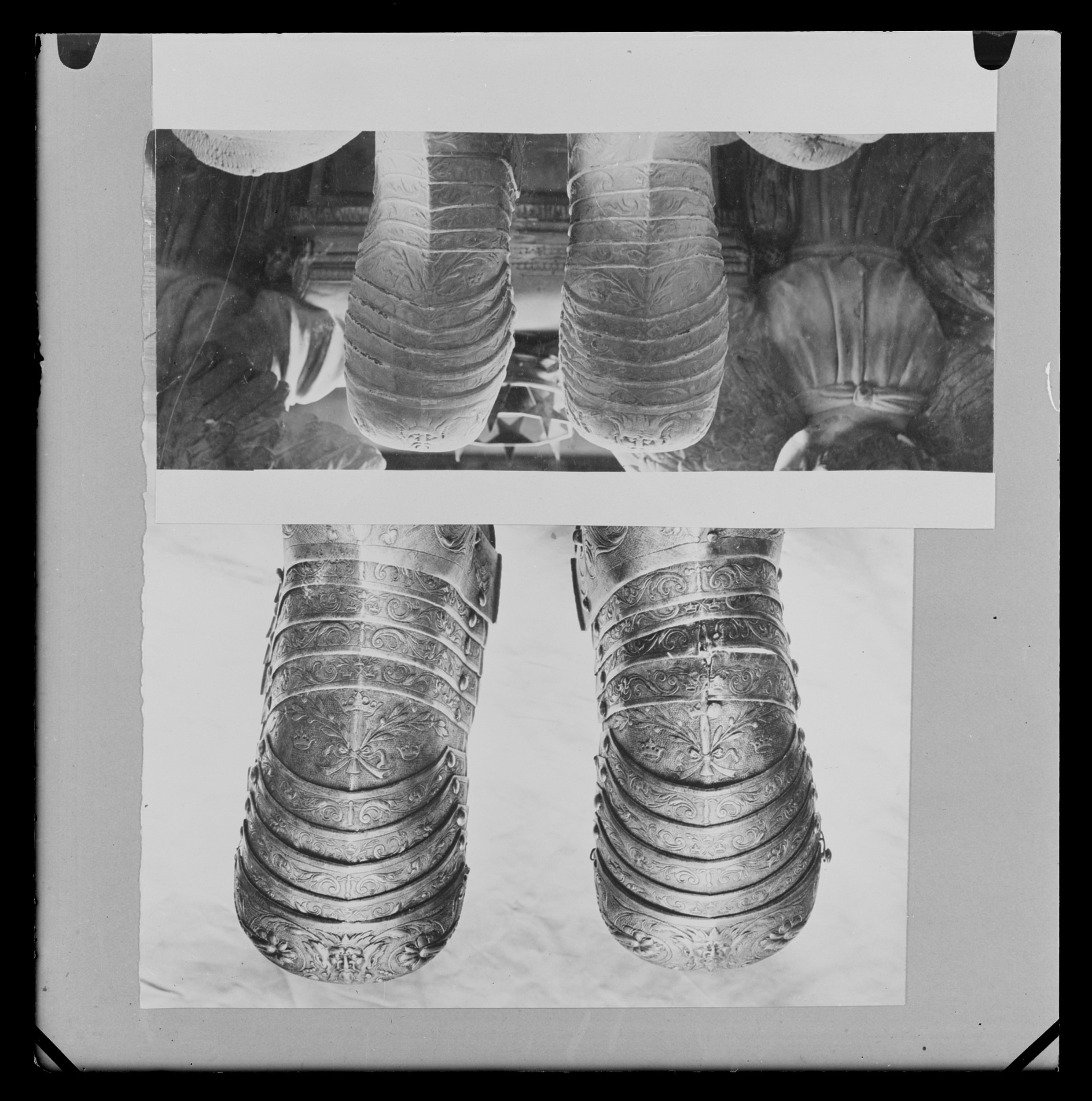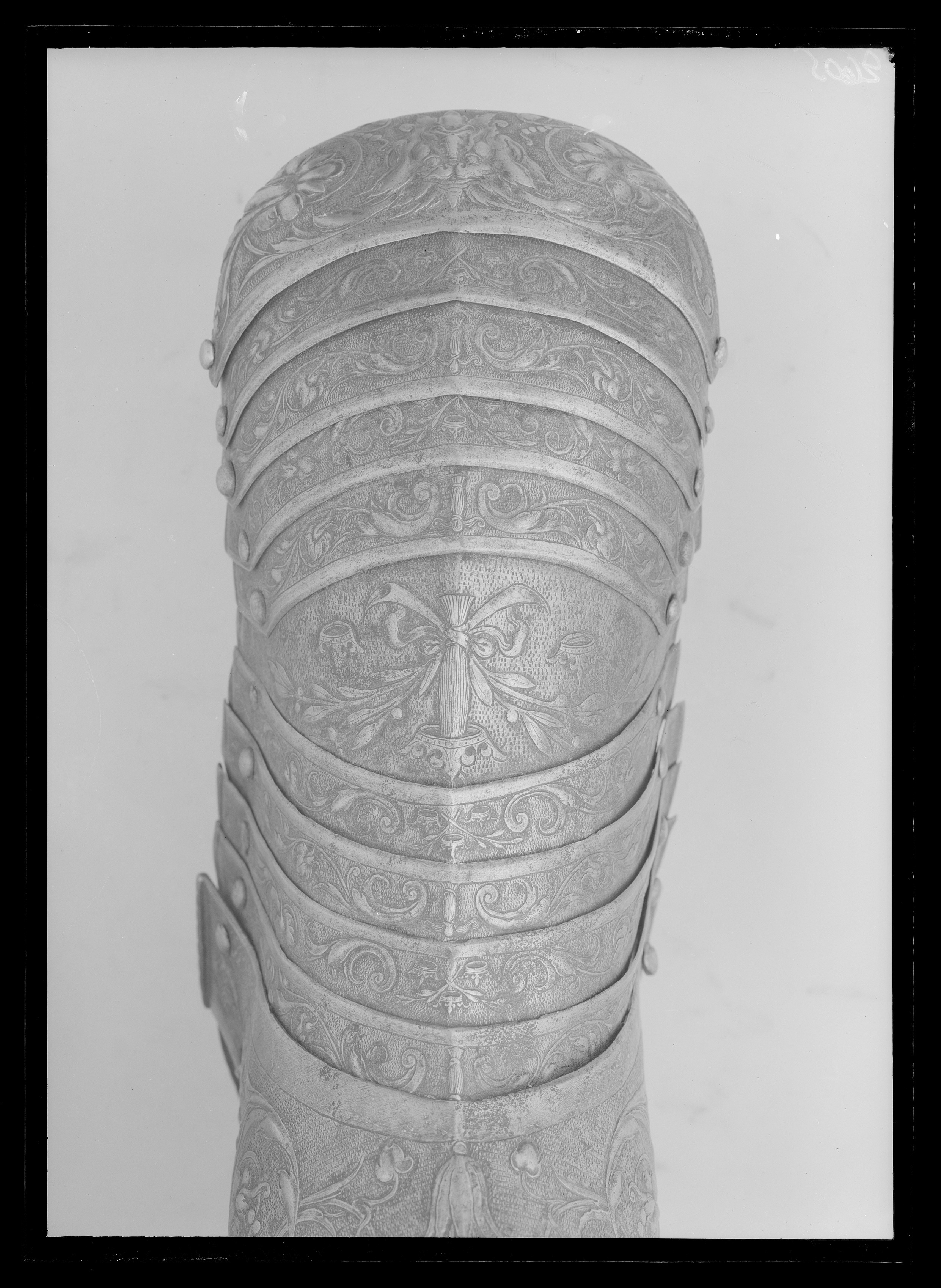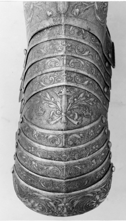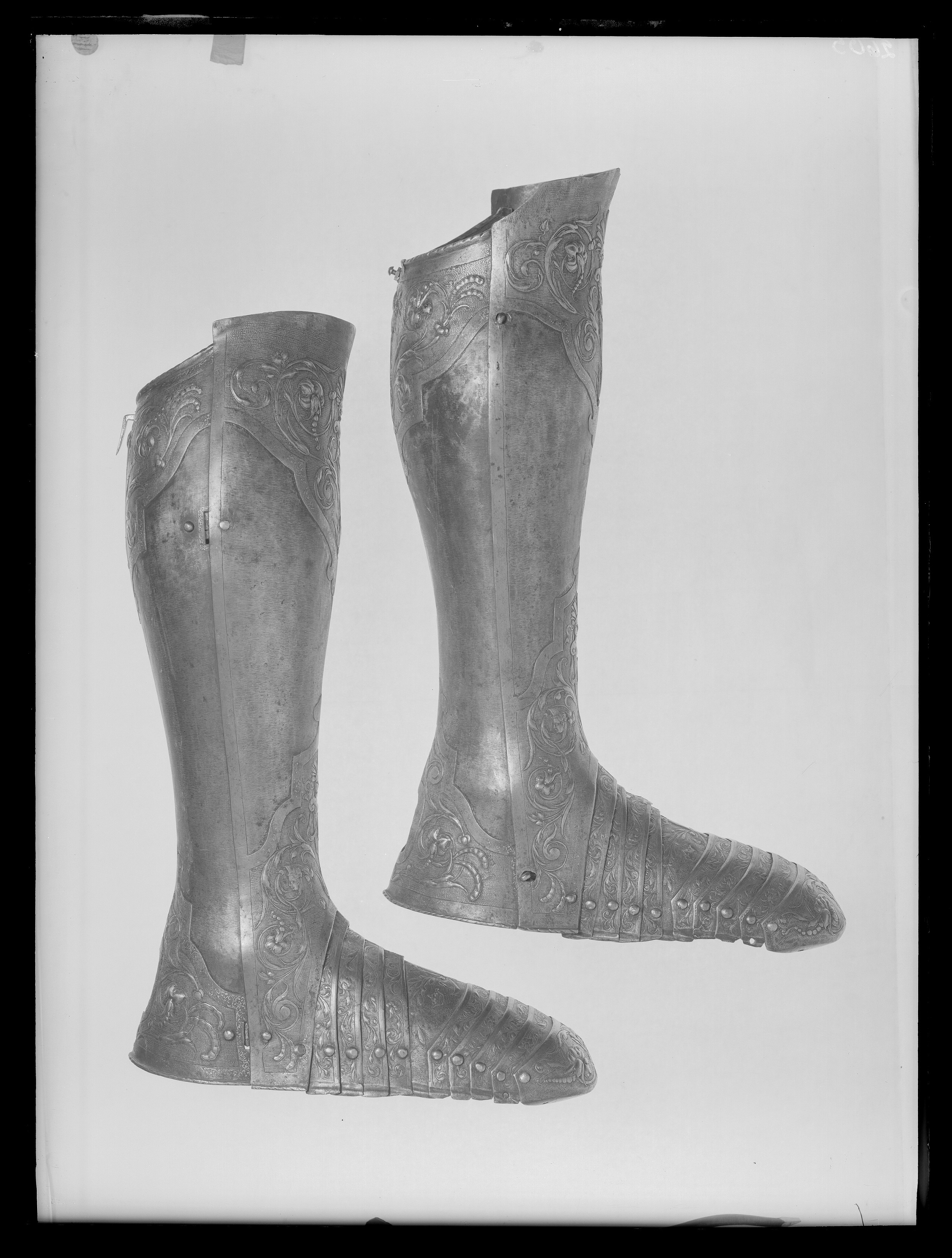 Ben inklusive fot. Smalbenen helt täckta. Gångjärn på utsidan. Fot i tio lameller med helt täckta tår. Smalbenen har stora partier på in och utsidorna som saknar dekor. De enda ytorna utan mönster i hela rustningsgarnityret?
