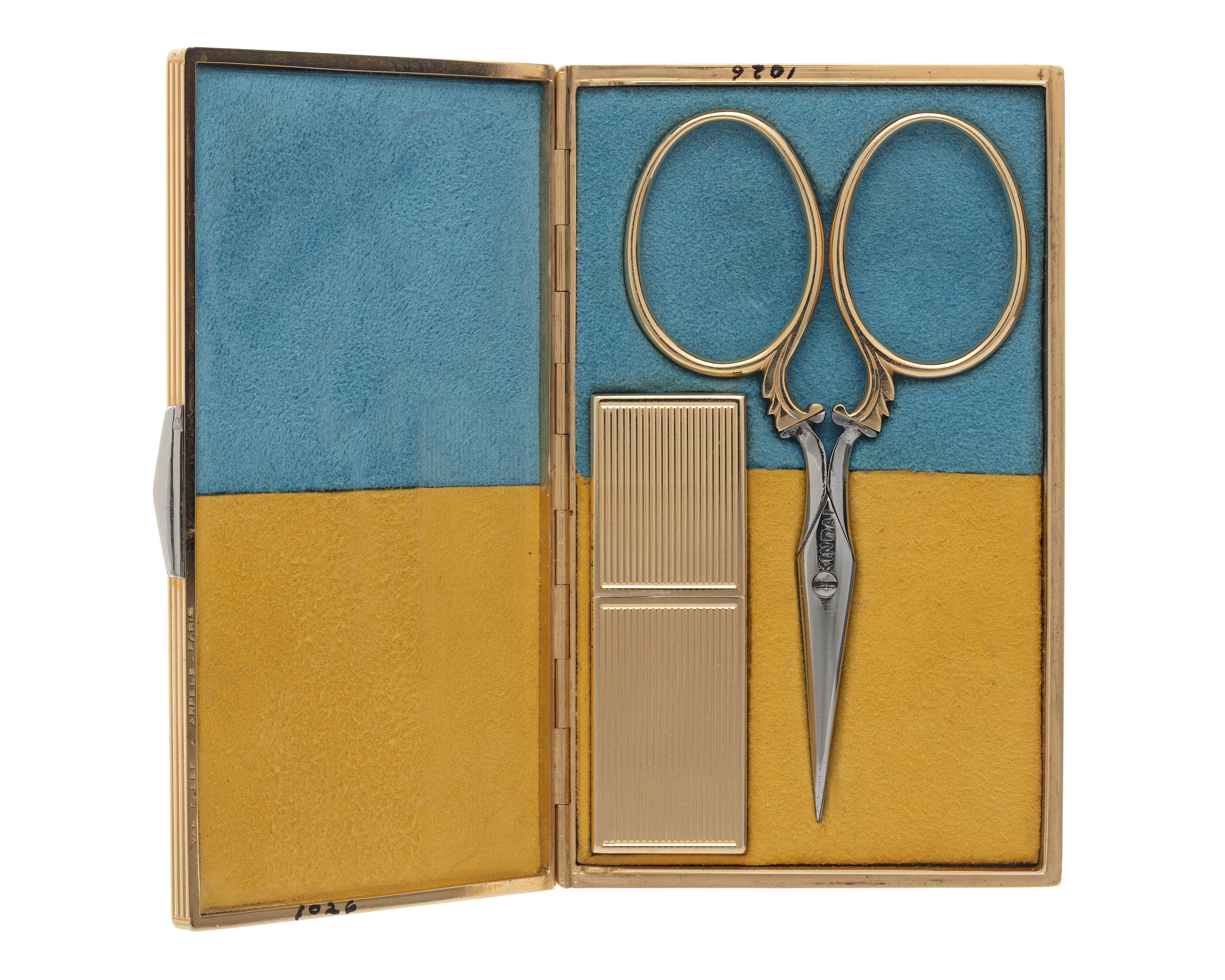 Rektangulärt nålhus av guld med påskjutbart lock och räfflade sidor. På nederdelens släta del under locket finns på ena långsidan en otydlig, rombisk stämpel med 5 eller S samt fågelhuvud. På andra långsidan finns två sexkantiga stämplar med griphuvuden. I etuiet förvaras en nål.