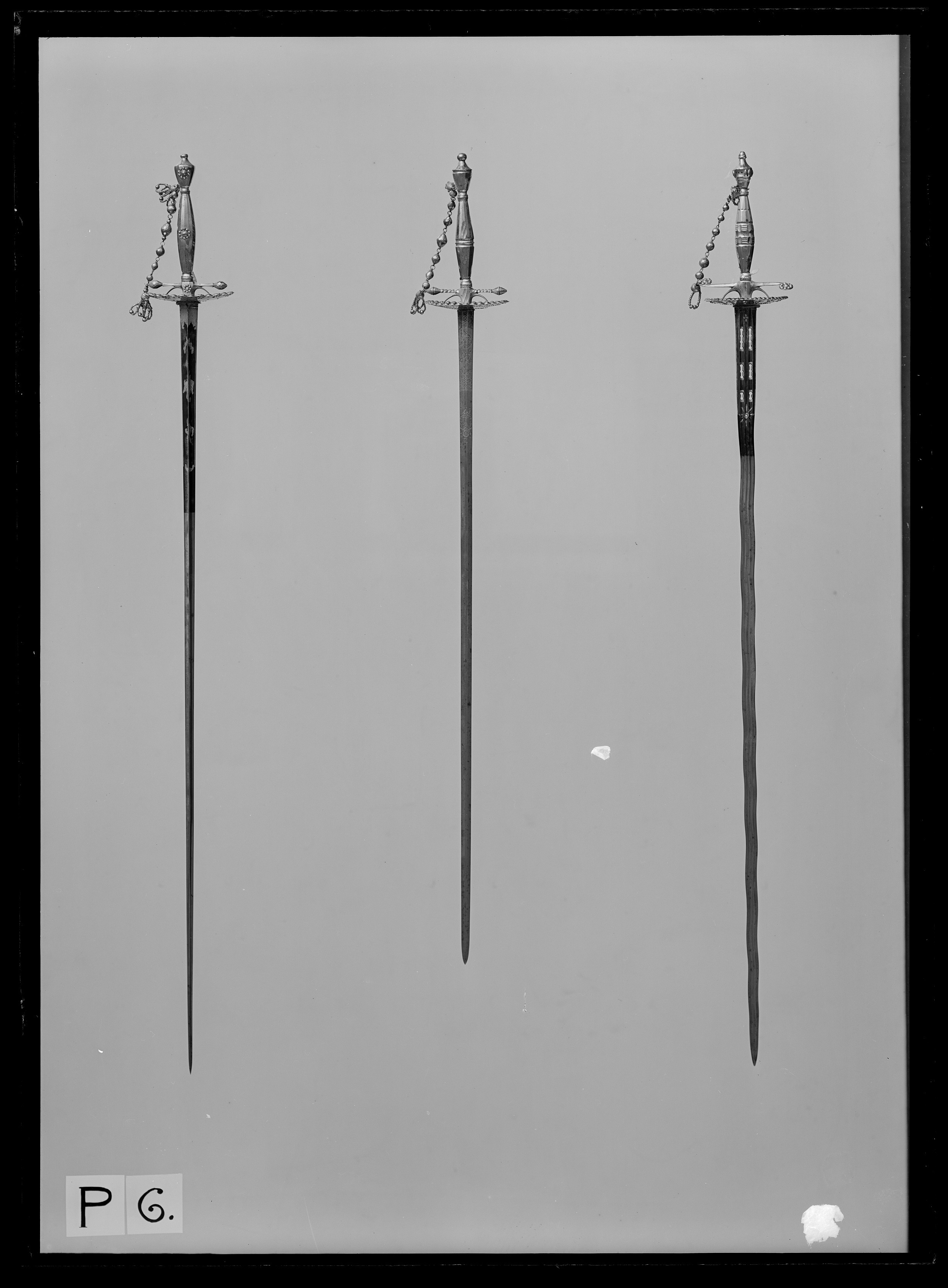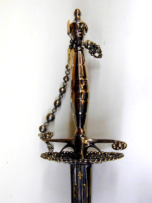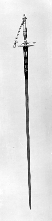 Fäste av högglanspolerat stål. Knapp närmast urnformig med utdragen överdel, nitknapp rundad på profilerad hals. Runt knappens mitt 15 nitar med spetsovala, fasettslipade (s k briljantslipade) huvuden (fem saknas). Parerstänger s-formigt svängda, de nstan platta ändarna utvidgade och runda, den främre inåtböjd, den bakre utåtböjd. De runda ytterändarna ornerade med nitar med fasettslipade huvuden. Parerplåt oval med kant och bred bård av fasettslipade nithuvuden. Mellan knappens nederdel och den främre parerstångsänden en handkedja bestående av åtta fasettslipade stålpärlor, sammanfogade med länkar av stålringar. Vid knappen en tofs av små stålpärlor. Kavel spolformig, slipad med längsgående fasetter, avbrutna av fem tvärgående band, på kavelns mitt ett bredare band, mellan detta och de flankerande banden tre smala tvärgående band på varannan fas, varannan fas skålad. Klinga flammig, tvåeggad med tre längsgående hålkälar. Starka delen från basen intill en längd av 630 mm blånerad och förgylld samt med sex parvis ordnade, långsmala genombrytningar med förgylld ram, ovanför dessa ett runt hål med förgylld kant, omgiven av förgyllda strålar.