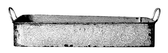 LÅNGPANNA (för ugnsstekning) Av emaljerad stålplåt; emaljen gråspräcklig. Rektangulär, med rundade hörn, rakt uppvikt kant, plan botten samt två handtag; kring brädden en utstående stav; handtag, ett vid vardera änden, något snett uppstående, rundstaviga och bågformiga samt med ändarna platt utsmidda och fästa vardera med två nitar. Höjd: 9,4 cm.; längd: 55 cm.; bredd: 30 cm.