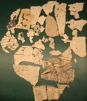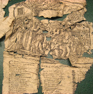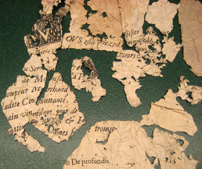 29 ihopskrynklade, isärrivna pappersbitar. Tryckt text, på vissa delar på båda sidor. Några bitar är del av en inbjudan till begravningen av Angelique Verité, den franske brodören Corniques fru, den tredje april 1676, i S:t Eustache, Paris. För hel inbjudan se nnr 33064. En pappersbit har en handskriven signatur: "ME Cossular" ?. Några delar bildar en text i spalter, tryckt på båda sidor samt med en bild (träsnitt) med stadsmotiv, änglar och människor. Bildtext: "/.../ de la Ville de Cologne/.../". Placerade i brunt kuvert med handskriven text i blyerts: "Broderifyllnad anträffad i vapentäcke // Vous estes priez d'assester... // (1676) // jfr LRK 803 // 2".