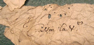Pappersfragment, troligen fyllning till broderi på hästtäcke