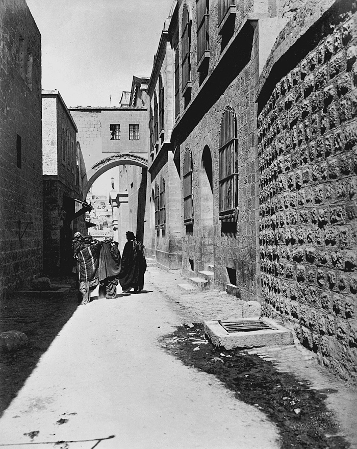 Via Dolorosa i Jerusalem. Text på originalet: "Via Dolorosa/Arc de l'Ecce-Homo". Fotografierna LXVI:N.01.-180. kommer från resan till Palestina och Syrien som Wilhelmina och Walther von Hallwyl gjorde den 30 mars-27 april 1901. De lämnade Sverige den 5 november 1900 för Egypten, där de stannade till den 28 mars 1901, då de fortsatte till Palestina. Med på resan var Wilhelminas sällskapsdam, fröken Ida Uhse. Den 27 april fortsatte de till Turkiet och Mindre Asien. De mindre fotografierna (utom de från Samos) LXVI:N.90.-100. är tagna av Wilhelmina själv, under en resa till häst från Jerusalem till Damaskus 8-20 april 1901. Övriga fotografier är inköpta av Wilhelmina i Jerusalem, Damaskus och Beirut. Alla uppgifter kommer från Ida Uhses reseanteckningar.