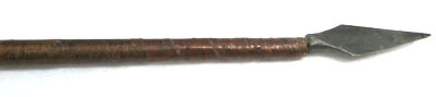 Skaft av obehandlad furu, framåt avsmalnande med cirkulärt tvärsnitt. Framtill spets av mörkt stål, l 41 mm, rombisk, dubbeleggad och med tånge. Inslagen i skaftet med lindning av ljusbrun näver? 90 mm upp på skaftet. Pilens bakre 275 mm målade i sex fält, silver, röd och blå med röda och silverfärgade romber i rader. Rester av vita styrfjädrar. Silverfärgad bredare ände med rödmålad urtagning för strängen.