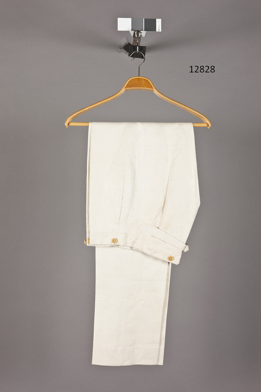 Vita långbyxor av linne. Gylf med tre plana, beige plastknappar, d: 14 mm och med upptill en plan, beige plastknapp, d: 17 mm. Utefter byxornas överkant ytterligare sex sådana knappar. Två sidsömsfickor. Baktill på byxorna kort sprund och spänntampar med förnicklad mässingssölja. Linningen fodrad med vit bomullskypert, liksom fickorna. En upphängningsögla bak.