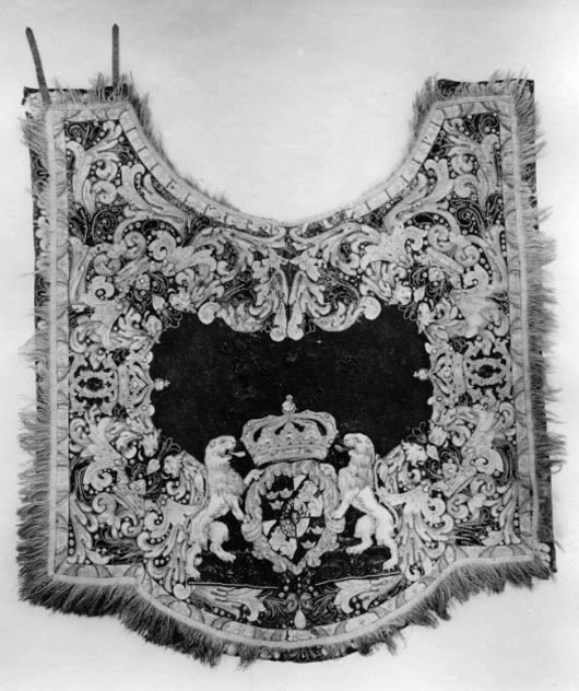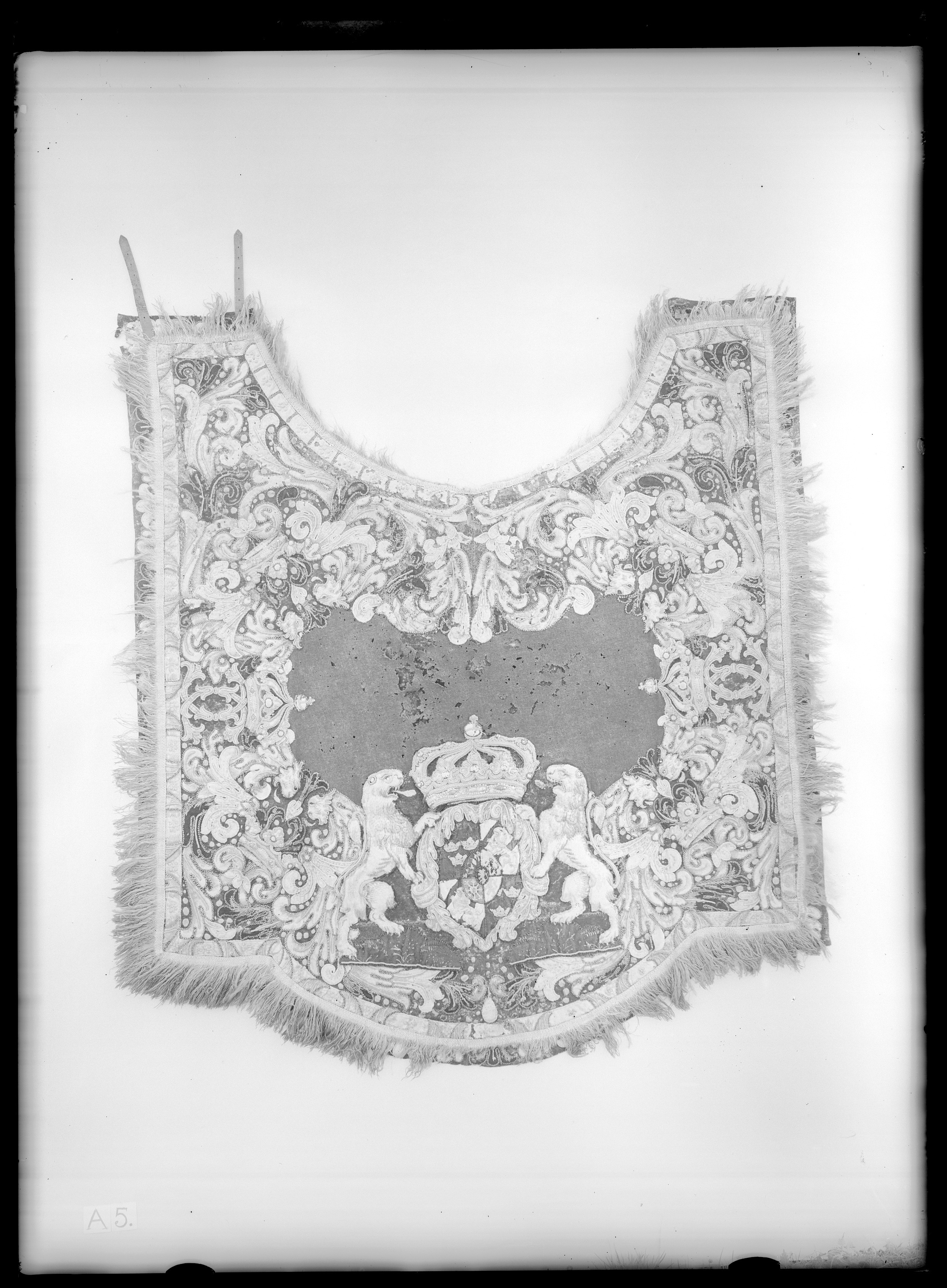 Täcke av blått kläde med applikationer av kläde i flera färger, huvudsakligen gult ochvitt. Samma typ som nr 4061 men skiljer sig från detta i följande avseenden: Bredd framtill: 1520 mm. Riksvapnets mått: 620x520 mm. De sköldhållande lejonen saknarkronor. De gula små lejonen och vapenskölden är sydda av gult ullgarn. Vänstra framstyckethar två remmar, 250x18 mm, av brunt läder, placerade 60 mm nedanför framkanten. På högraframstycket sitter två tränsar av brunt läder, 30x32 mm, med spännen av vitmetall, 28x22mm. Tränsarna sitter 60 mm från framkanten. På baksidan sitter fem tränsar, från sen tid, liksom på nr 4061. Märkt "G.4." med svarttusch 80 mm nedanför inskärningen. Två hällor av brunt läder, 250x35 mm, placerade ungefäri täckets mittparti ca 540 mm från respektive långsida. Svansrem av bruntläder, 550x8 mm,trädd genom fodret 270 mm ovanför bakre kanten.