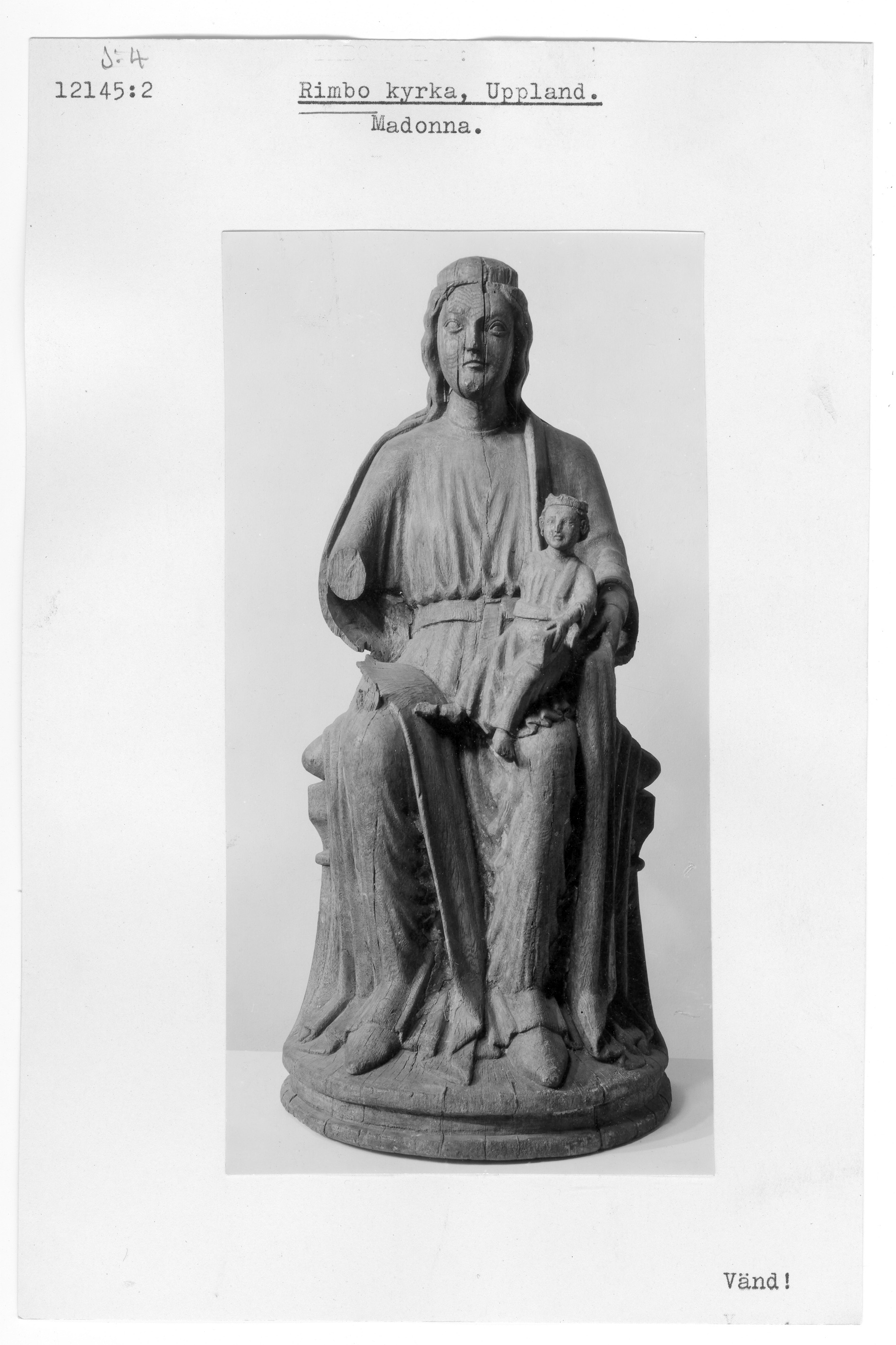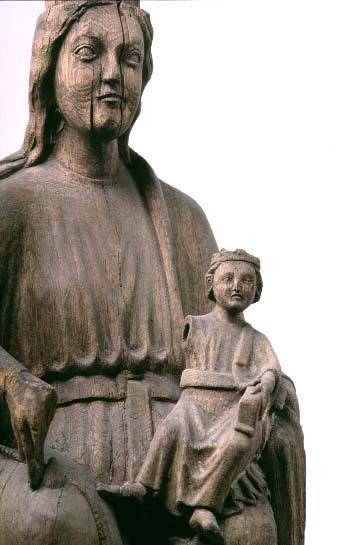 Kondition: barnets högra arm bortbruten, Marias vänstra hand skadad, hennes krona förlorad, ytan något vittrad. Färg: endast obetydliga fragment bevarade.