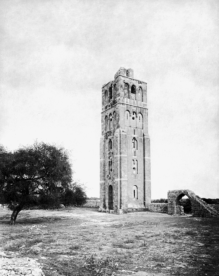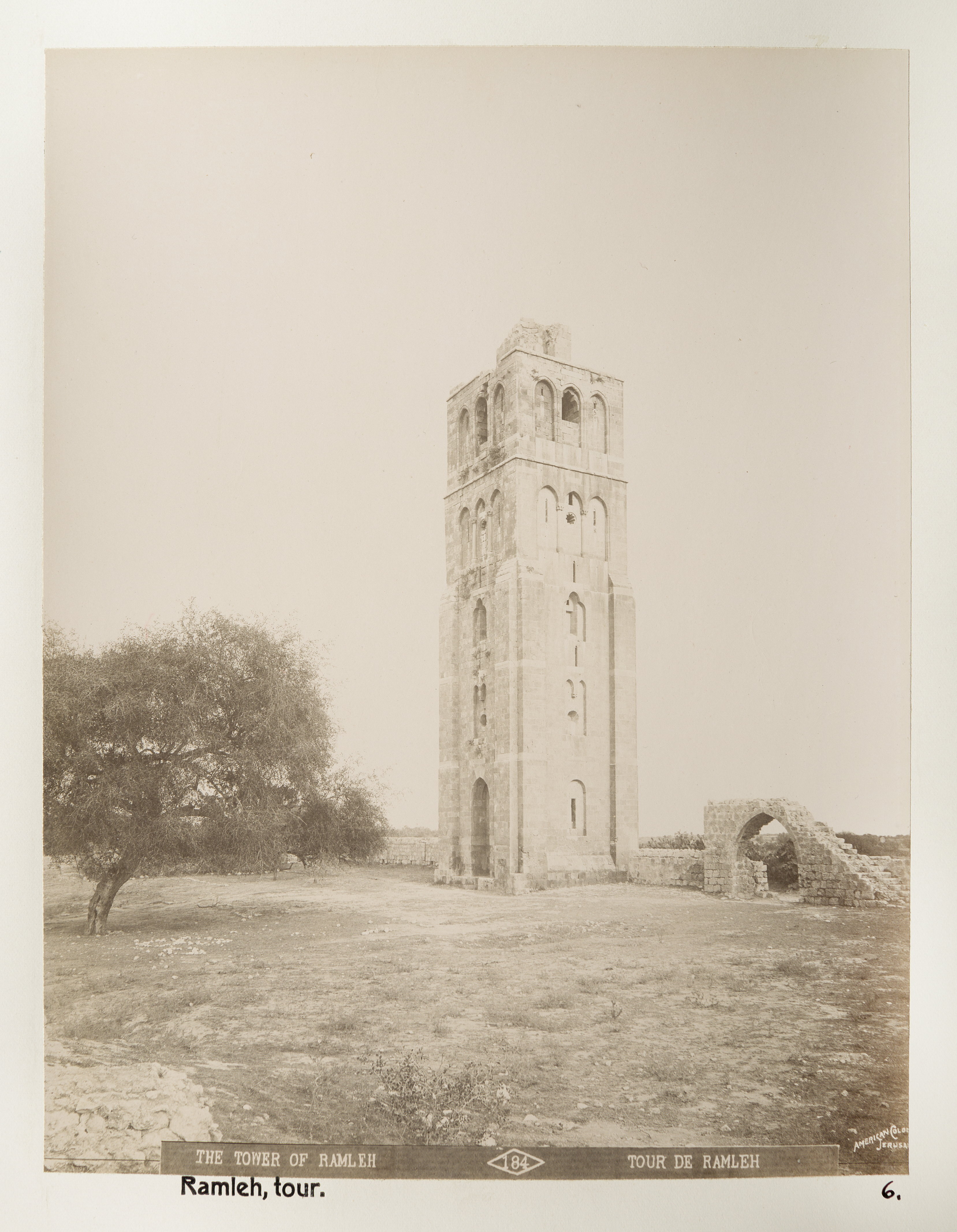 Torn i Ramle. Text på originalet: "The Tower of Ramleh/Tour de Ramleh". Fotografierna LXVI:N.01.-180. kommer från resan till Palestina och Syrien som Wilhelmina och Walther von Hallwyl gjorde den 30 mars-27 april 1901. De lämnade Sverige den 5 november 1900 för Egypten, där de stannade till den 28 mars 1901, då de fortsatte till Palestina. Med på resan var Wilhelminas sällskapsdam, fröken Ida Uhse. Den 27 april fortsatte de till Turkiet och Mindre Asien. De mindre fotografierna (utom de från Samos) LXVI:N.90.-100. är tagna av Wilhelmina själv, under en resa till häst från Jerusalem till Damaskus 8-20 april 1901. Övriga fotografier är inköpta av Wilhelmina i Jerusalem, Damaskus och Beirut. Alla uppgifter kommer från Ida Uhses reseanteckningar.