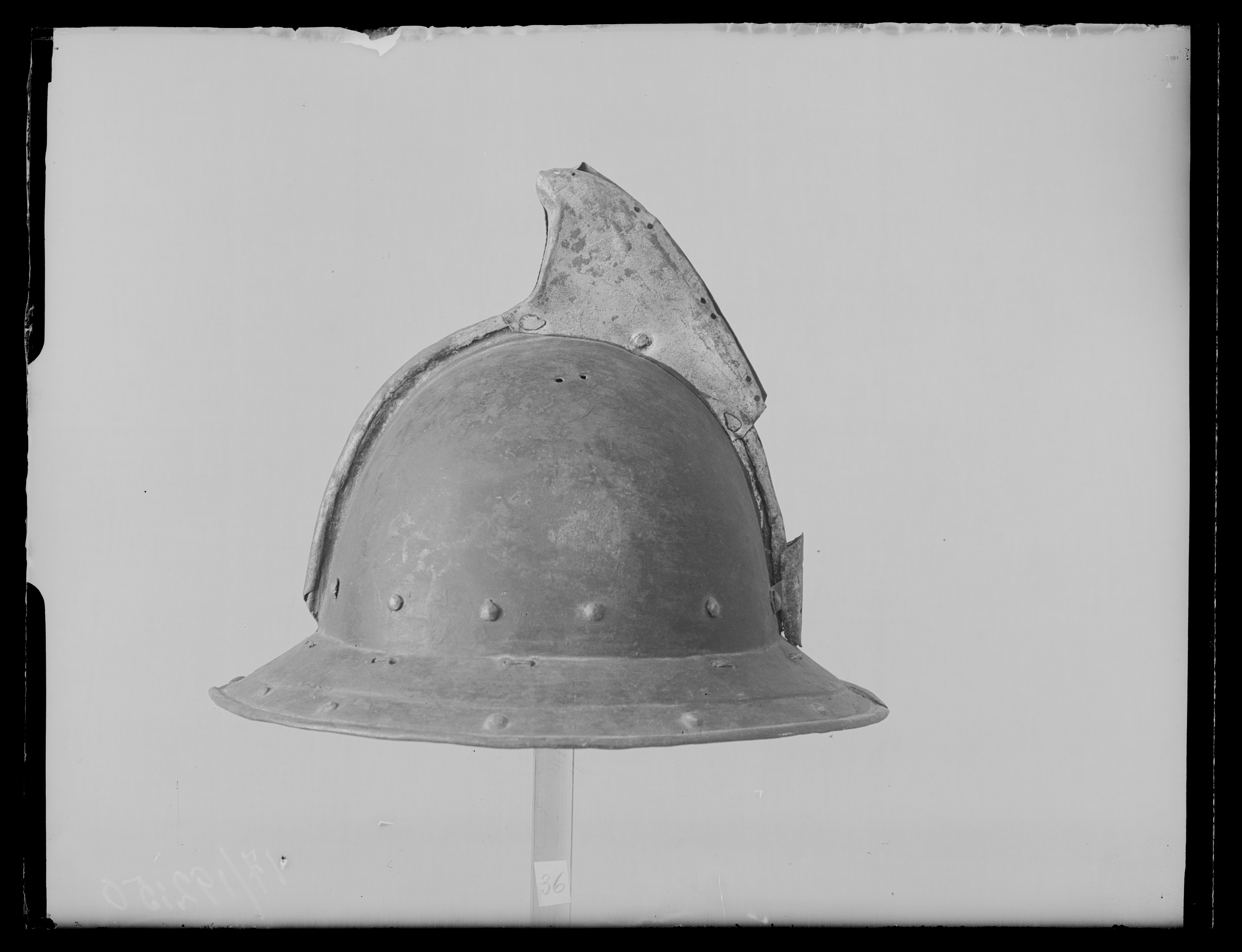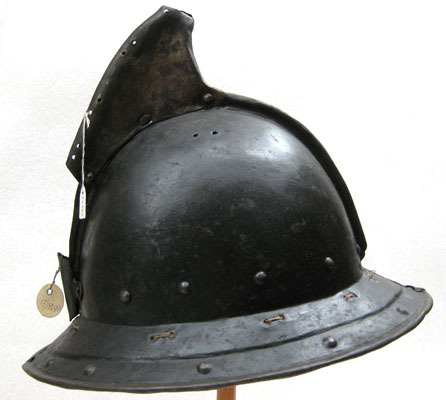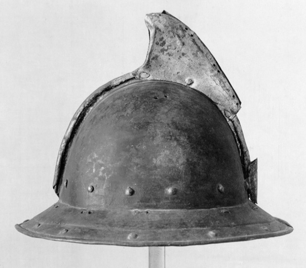Av driven stålplåt. Utsidan målad svart med nederkant, kamkant och vinge ursprungligen guldgula, tydliga filspår. Insidan med slagmärken. Hjälm bestående av två halvor, sammanfogade i en längsmed klockan löpande kam, omvikt och förstärkt. Klockan rundad. Upptill på kammen är en senare (under 1700-talet) nitad dekoration i form av en trekantig något framåtsvängd vinge av bleckplåt, av två halvor fäst i kammen med tre nitar. Nertill övergår klockan i ett brätte, något neddraget med invikt rundsmidd kant och försänkt bård med falska uppdrivna nitar. På klockan baktill en plymhållare, H 54 mm, nedåt avsmalnande med spetsig överkant och två hål, fäst med två nitar. I klockan nertill på var sida nitar i rad. I kanten där brättet möter klockan är en rad av små slagna hålpar hela vägen runtom. I klockan upptill är på var sida om kammen ett hålpar. I brättet baktill ett hål, framtill på högersidan två punsade stämplar, en öppen krona samt symbol. Hjälmfoder av grov lärft, hopsytt av två halvor. Under detta en stoppning av linblånor. Fodret är fastsnört i brättetts hålpar med linnetråd.
