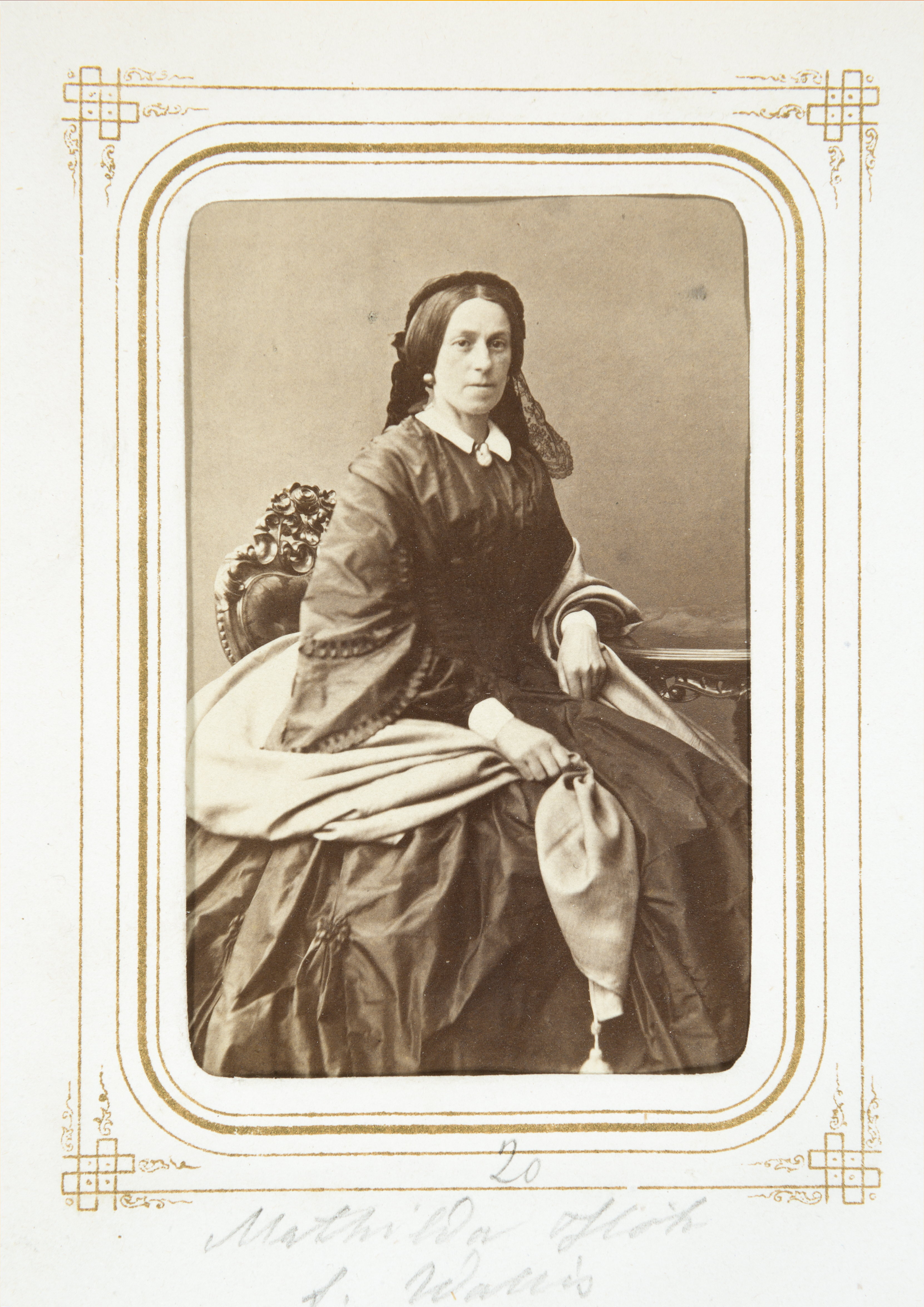 Biografi. Fotografiporträtt. 101 porträtt i album. MATHILDA HÖK, f. WALLIS. Erhållet av Johanna Kempe, f. Wallis på 1860-talet. 26,5x20,7x4 cm.