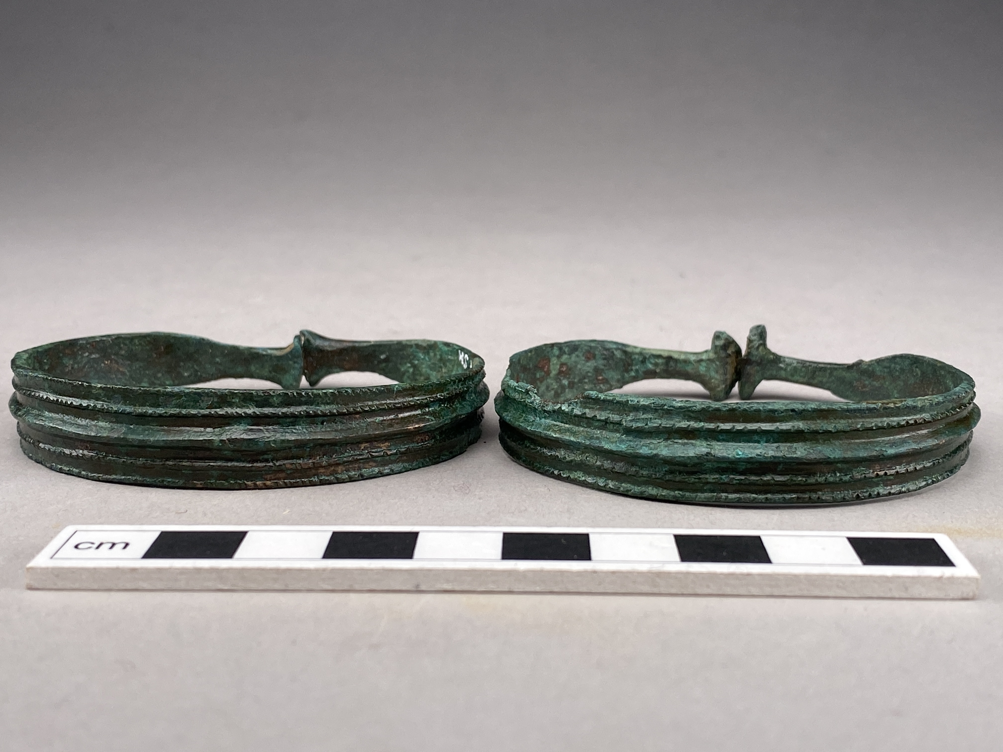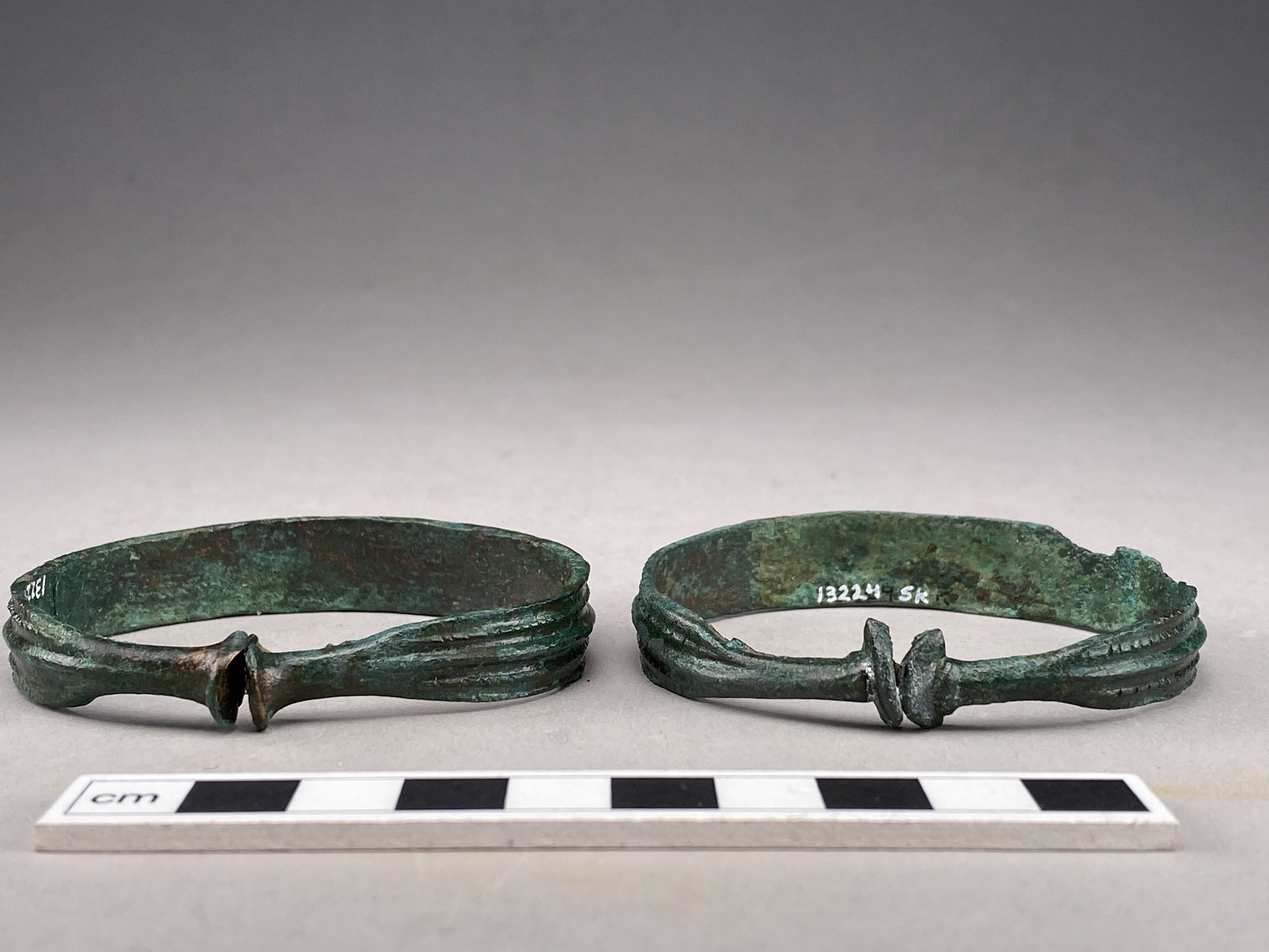 Två armringar av brons. Massiva, flata med längsgående åsar och utplattade halvrunda ändar. Åsarna är fem varav den mellersta är något större samt slät. De fyra övriga åsarna är ornerade med punkter.