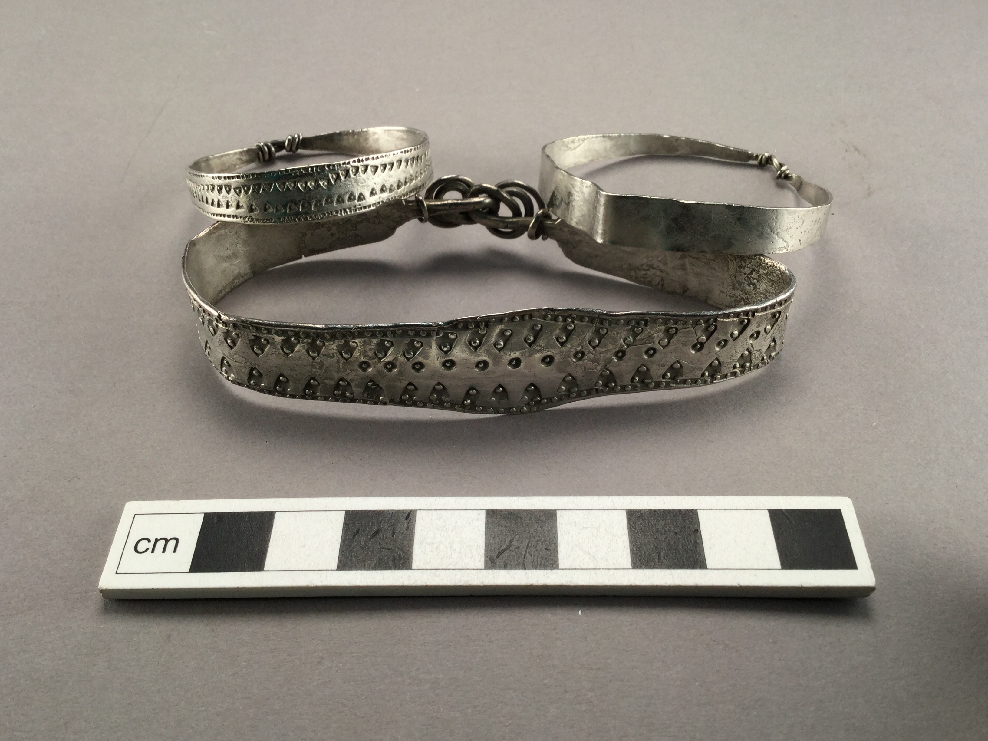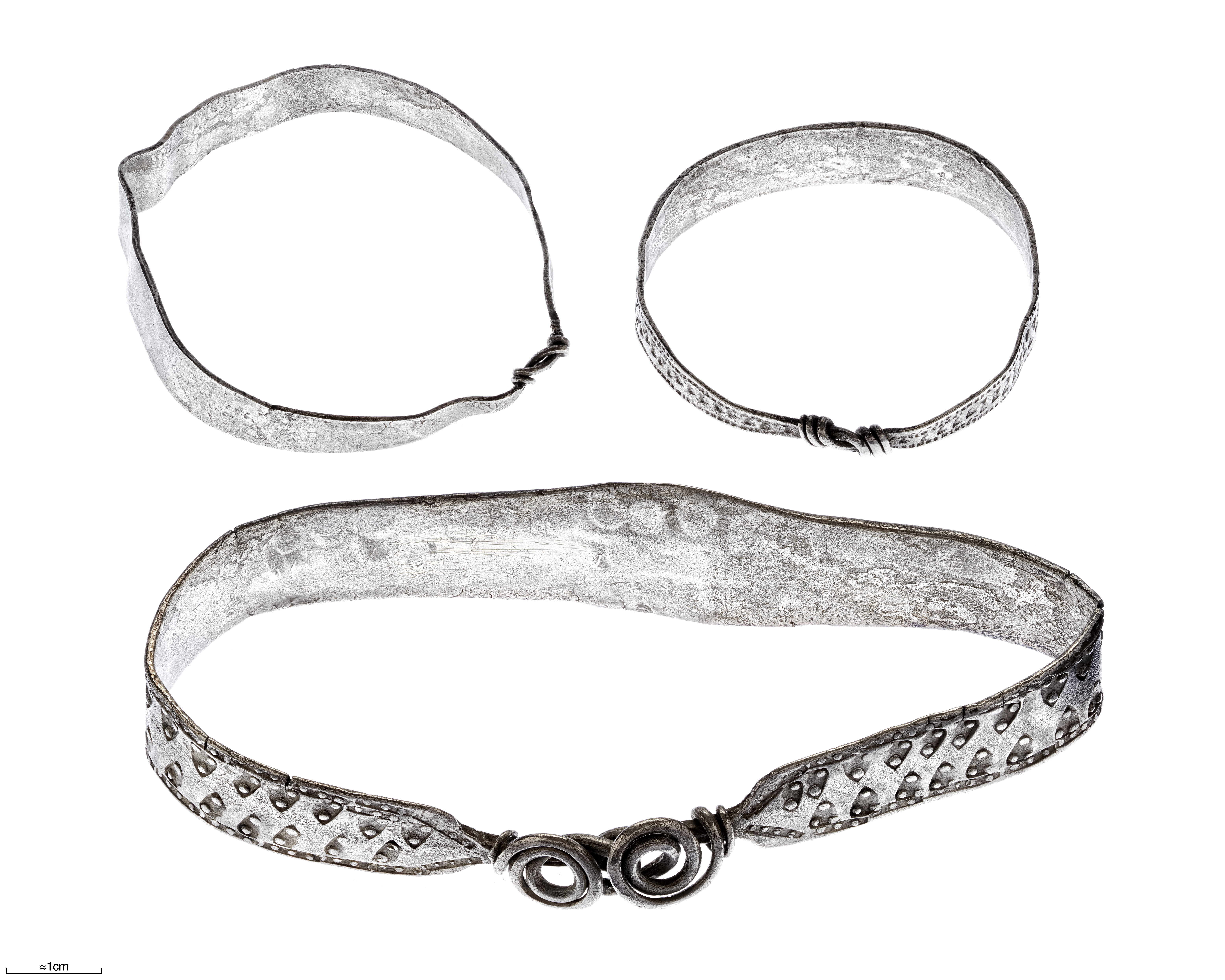 Bandformiga; en större punsornerad omsluten med spiralknut, två mindre omslutna varav den ena punsornerad.