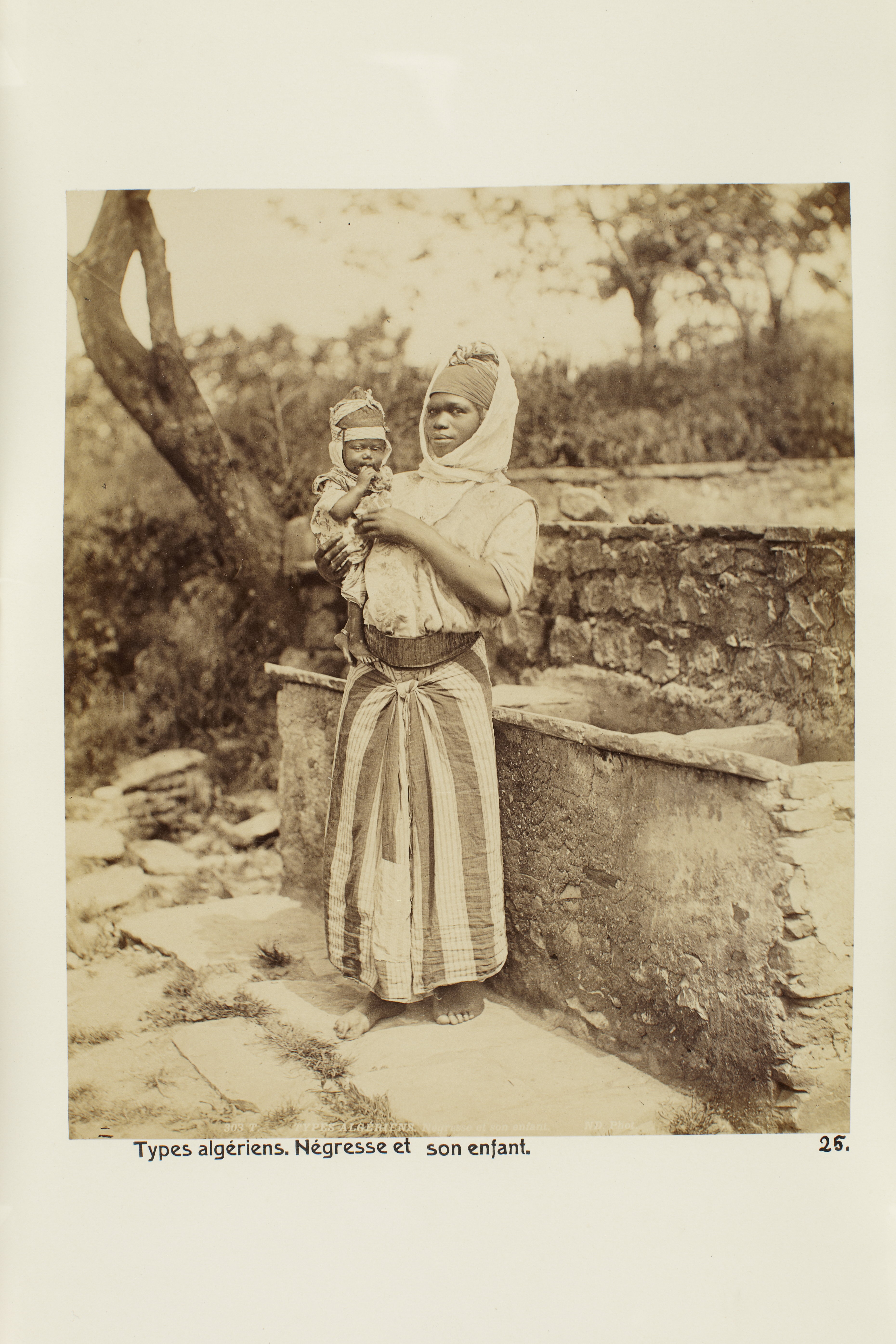 Algeriet. Kvinna med barn. Foto från resa genom Algeriet och Tunisien samt åter över Schweiz, 11 februari - 19 maj 1889. Samtliga foton i gruppen LXVI:F. är inköpta av Wilhelmina von Hallwyl i Alger, Biskra, Tunis, Constantine, Oran och Blidah vid hennes vistelse i nämnda städer tillsammans med sin make, Walther von Hallwyl, sin mor, Johanna Kempe, f. Wallis, dottern Irma samt fröknarna Caroline Pflaum och Ida Uhse. Uppgifterna kommer från fröken Ida Uhses reseanteckningar.