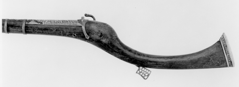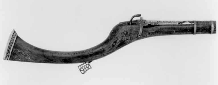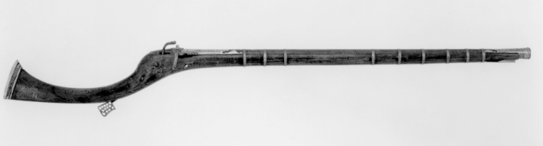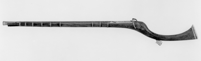 Rund, räfflad pipa av stål med trumf, sju räfflor, falsk damaskering. Svansskruvblad och kammarens ovansida ornerade med påslagen gulddekor i form av växtmönster. Vid mynningen liknande dekor. Mellan de dekorerade partierna går en plan ribba längs pipans rygg. Trumfens yttersta del är förgylld med rankdekor i relief, framänden förgylld. Fängpanna utan lock, fäst vid pipan, påslagen gulddekor. Riktmedel: Sikte i form av skåra i uppstående skiva av stål på pipbasen, påslagen gulddekor. Knoppkorn av koppar. Fästning: Pipan fästvid kolven med nio pipband av försilvrad mässing. Invändigt luntlås av stål. Böjd hane med luntklämma. Påslagen gulddekor. Hävstångsavtryckare av förgyllt stål med genombrutet trycke. Brun helstock av trä. Lång, smal kolv, nedåtsvängd i båge, vidgad bakåt. Bakplåt av ben med graverade linjer omgivande cirklar runt kanten. Kolvens sidor och kolvnacken dekorerade med blommönster inlagt med glittrande silverstoft. Beslag av tenn(?), över kolvnacken genombrutet för siktet och fastnitat på sidorna. Två genomgående hål i framstocken för bäranordning.