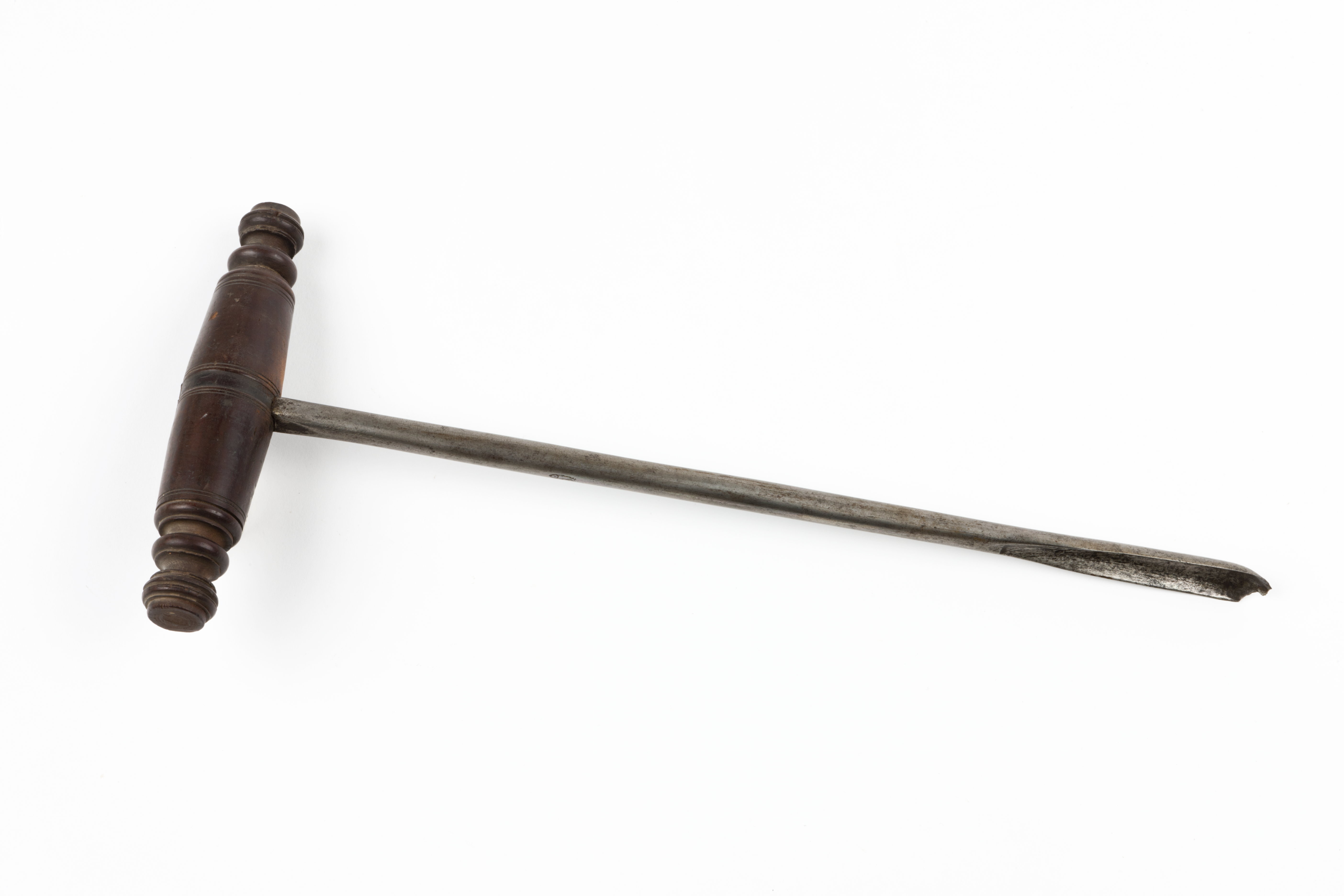 Borren nitad i svarvat, profilerat handtag av mörkbetsat päronträ. Stämpel: fisk.