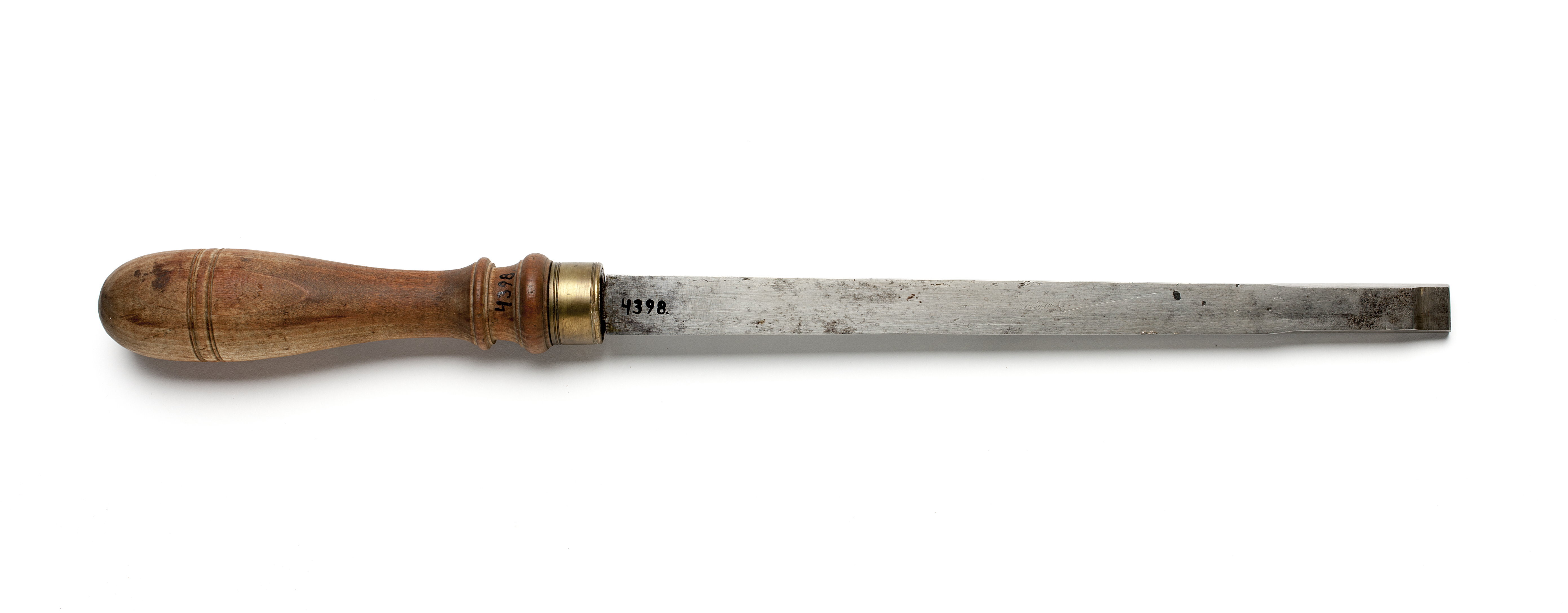 Klinga med rektangulär genomskärning. Stämplat på klingan: "IK" under krona, Johan Kesemaker, Stockholm, samt "P" (proberstämpel). Svarvat skaft av päronträ, med två vulster nedtill ("rydboholmstyp"). Mässingsring. Stämplat på skaftet: "I".