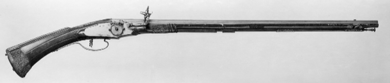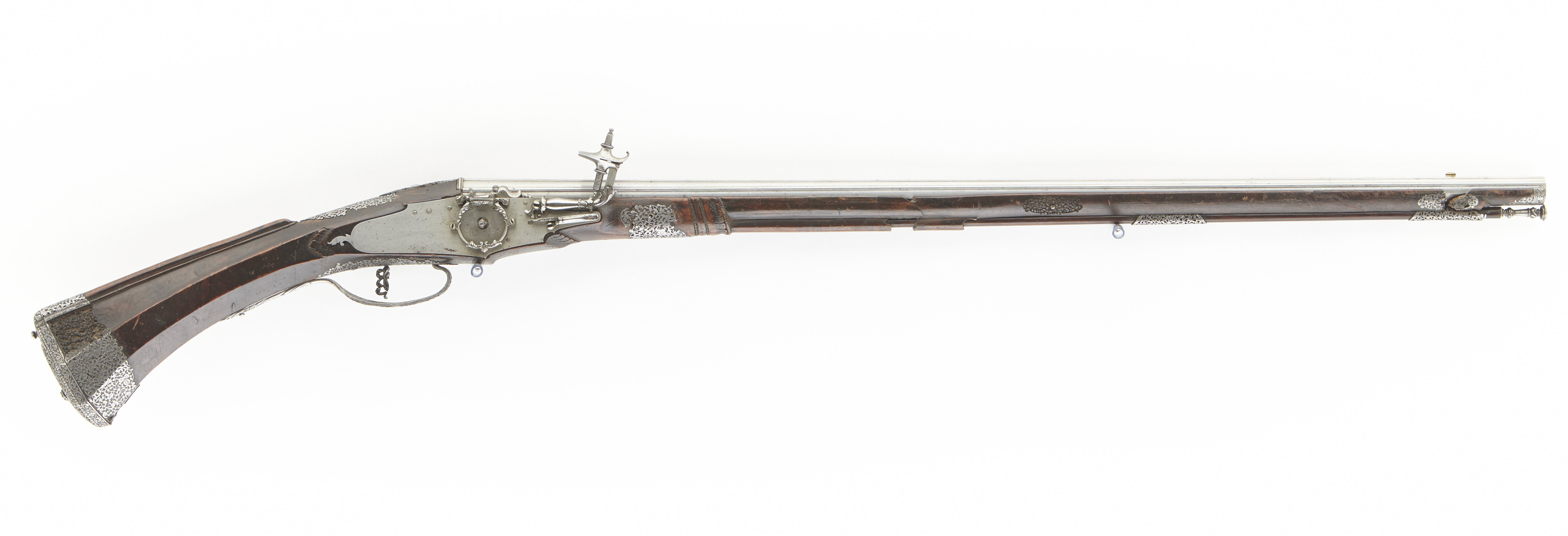 Åttsidig, slätborrad pipa med längsgående åsar på pipans översida. Pipan svagt tornformad, signerad på kammaren: "GIO LAZARINO COMINAZZO", mellan orden samt flankerande stämplar i form av treblad. Riktmedel: Siktskåra, korn av mässing. Fästning: Krysskruv ovanifrån, tre häften, två pipstift av stål (dett bakre saknas). Hjullås med plant låsbleck, hjulring i form av plastiskt formade blad, liknande dekor på hjulaxelns studel, fängpannan, hanen och dess fjäder samt på delar invändigt. På låsbleckets insida stämpel C L och möjligen hand med stjärna. Fästning: Två låsskruvar. Genombruten avtryckare. Helstock av valnöt med kantig kolv och ryggvulst. Skuren dekor vid bakre pipstiftet, bakom och nedanför låset. Beslag av stål med genombruten dekor i stålsnitt (trafori). Kolvkappa med stötkula samt beslag på kolvänden, beslag kring svansskruvbladet, rörkor, pipstiftbeslag, näsband och varbygel. Tillbehör: Laddstock av valnöt med profilerat huvud av stål.