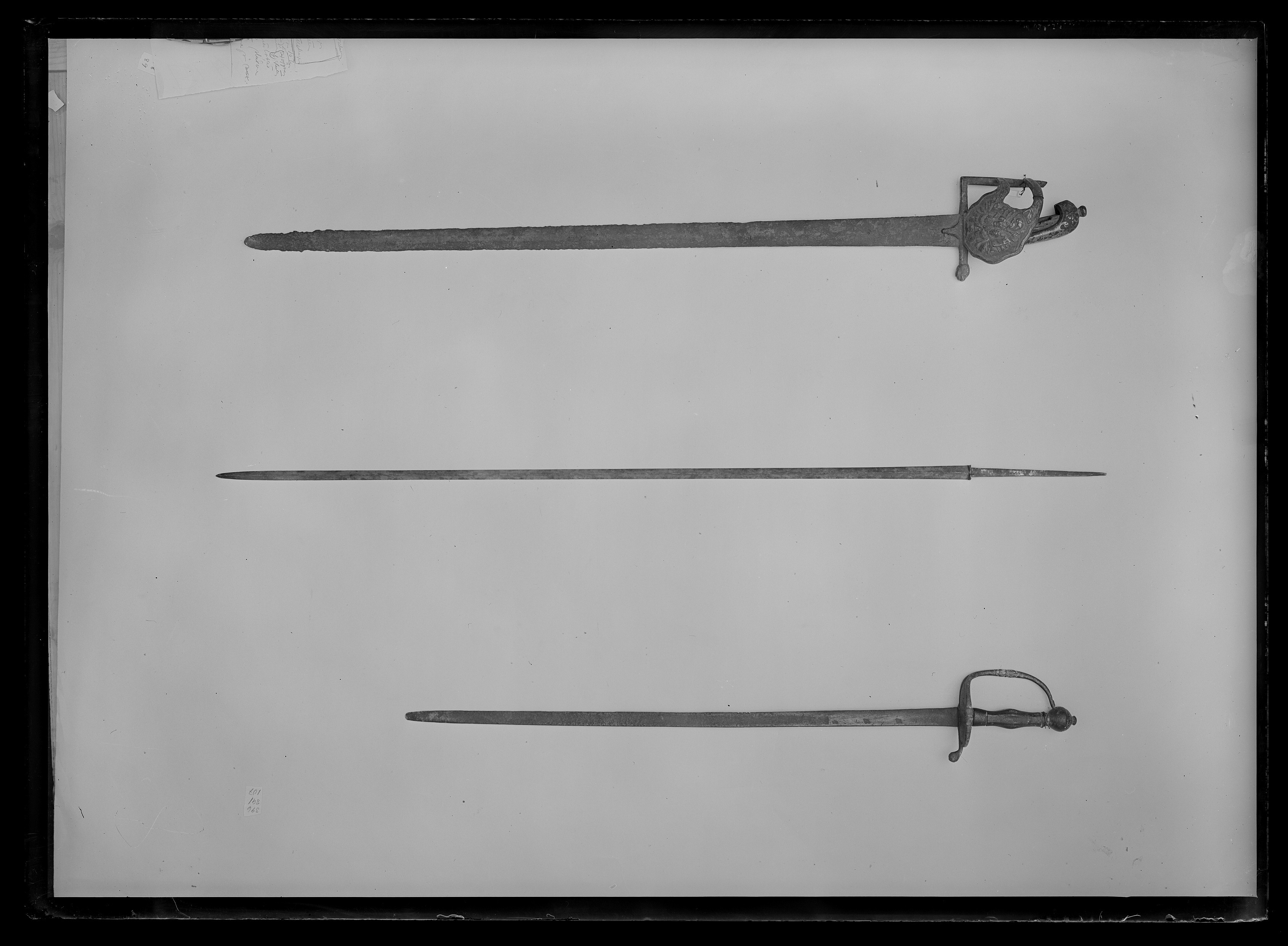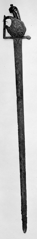 Fäste av förgylld, reliefornerad (gjuten) mässing. Kappa framåtböjd, på båda sidor smyckad med en trofégrupp och baktill övergående i en slät femsidig ryggskena, som nedtill ansluter till bakre parerstången. På utsidan en stor uppåtböjd parerplåt, ornerad med en stor trofégrupp. Från parerplåten utgår två S-formiga, platta sidobyglar till den raka (upptill söndriga) handbygeln. Denna ansluter nedtill rätvinkligt till den raka främre parerstången den bakre kort och likale-des rak, ytteränden formad som ett djurhuvud. På in- och utsidans kryss styrskenor, den övre på insidan sannolikt förlängd och omböjd till en tumbygel (numera avbruten och förkommen). Av kaveln återstår endast fragment av trästommen. Klinga med mörkbrun yta, i sin helhet svårt skadad av gravrost. Rak, tvåeggad. Utmed mitten en hålkäl.