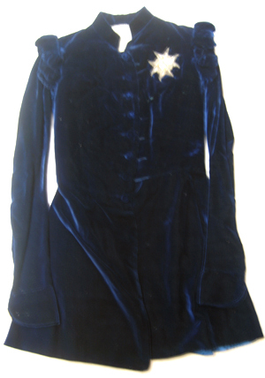 Livrock av mörkblå sammet bestående av två framstycken samt av bakstycke tillskuret av fyra delar och två långa skörtkappor. Rocken har en knäppning mitt fram ned till midjan. Knäppningen består av åtta knappar klädda med blå sammet. Kragen utgörs av en 40 mm hög ståndkrage. Ärmarna är långa med rundade ärmuppslag. Över axelsömmarna sitter vadderade axelkarmar av blå sammet med fem insydda puffar. Skörtkapporna har rak framkant och vidden ökas genom triangulära stycken baktill där djupa ficksprund, l. 200 mm, lämnats med ficksäckar av vitt bomullstyg. Framstyckena är vadderade med ett mjukt material. Livdelen är på insidan fodrad med vit taft medan skörtkapporna är fodrade med blå taft. På bröstet sitter påsytt serafimerordens broderade kraschan av silvertråd och av förgylld tråd i kantilj, förgyllda paljetter samt med en glob av ljusblå sidenrips.