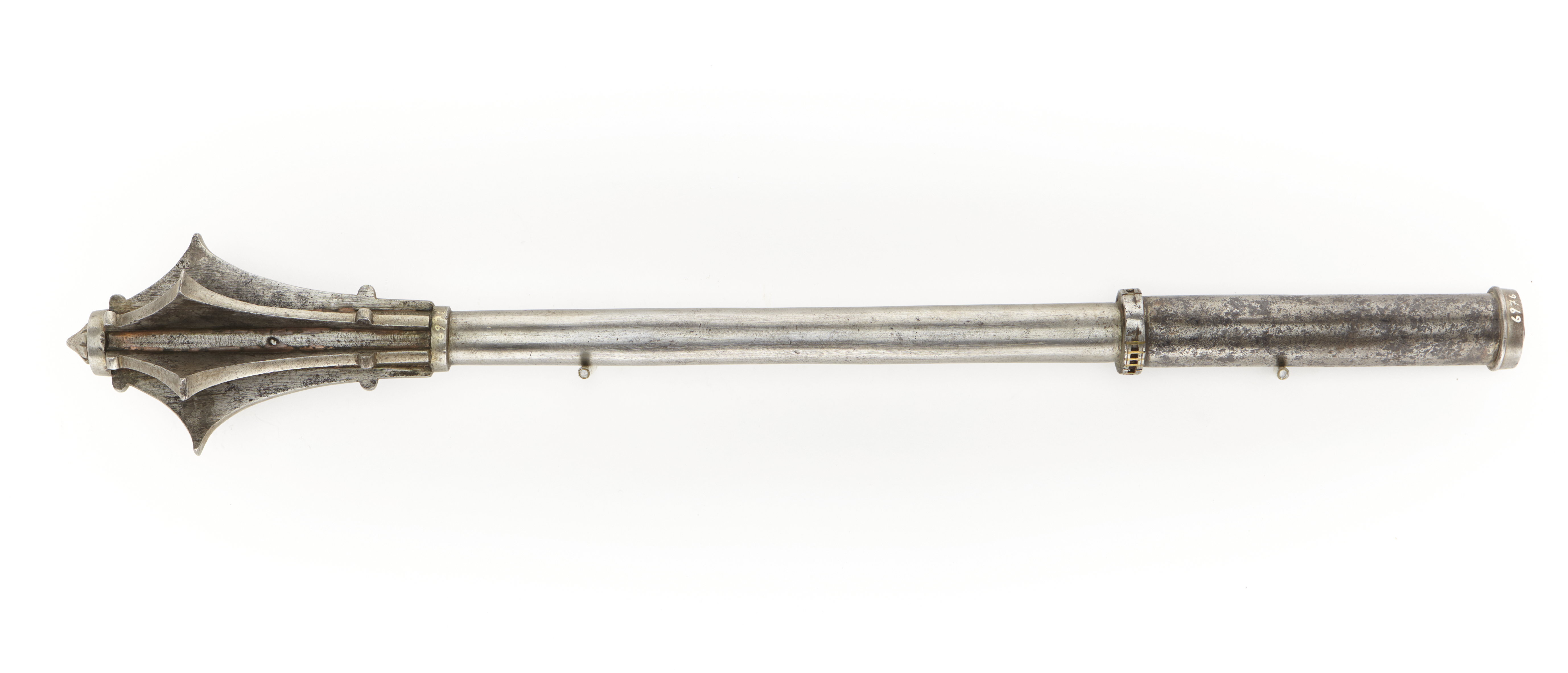 Hjälmkrossare/kyrissbengel helt gjord av stål. Slaghuvudet, 165 mm högt med sex radiellt utstående slagblad, vid överdelen i en spetsig profil. Bladen fastlödda vid en cylindrisk stomme och utan ornering. Nedtill knappformigt utskjutande ornament. Skaft i form av ett cylindriskt, slätt rör. Handgreppet slätt, 170 mm långt, avgränsat upptill och nedtill av en utskjutande krage, den övre ornerad med rektangulära hål. Bottenkåpan förkommen. I skaftet en trästav (synlig i handgreppets nedre öppna ände). Har haft hälthake eller handrem. Enligt 1710 års inventarium p. 77, tillsammans med inv.nr 6975, 6977-6978: "(uthi Rundelen) 4 D:o (Regementz Klubba) af stål med 6 kantige knappar".
