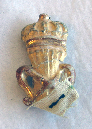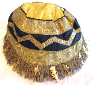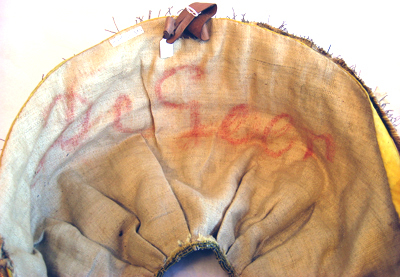 Rund, välvd pistolhölsterkappa av svart sammet och gul sidendamast. Längst upp finns en cirkelrund öppning kantad med en smal guldgalon. Runtom hölsterkappan är påsytt två breda guldgaloner, b. 50 mm, och över den svarta sammeten är påsytt en smalare guldgalon, b. 20 mm, i ett viggmönster. Hölsterkappan kantas nedtill av en guldfrans av tvinnad förgylld metalltråd samt av förgyllda gipsdekorationer i form av vasakärvar samt av sexuddiga stjärnor i par. Hölsterkappan är fodrad med grov linnelärft. Längst ned på fodret sitter påsytt en brun läderrem att fästa kring pistolhölstret.