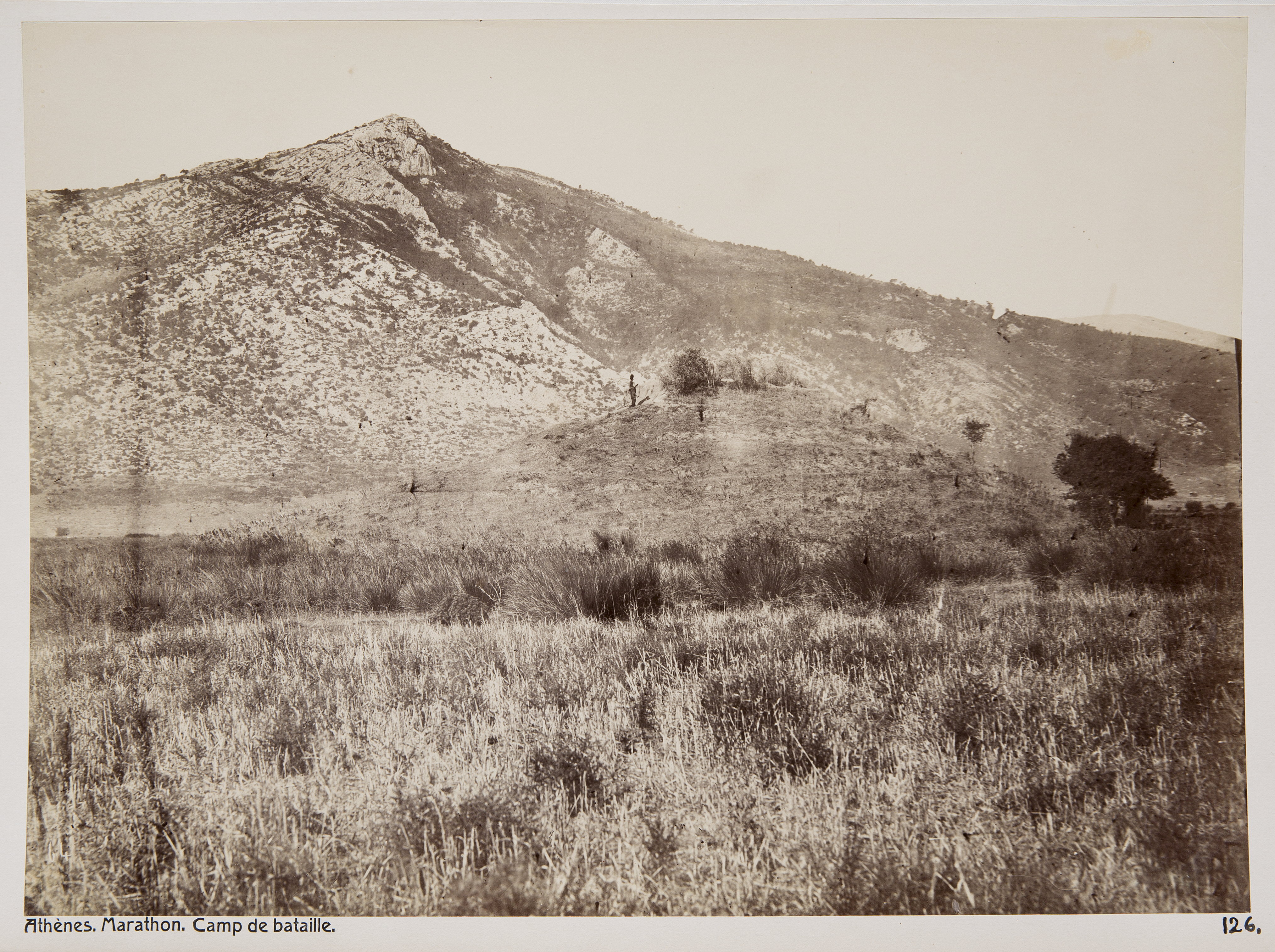 Slagfältet i Marathon, Grekland. Text på originalet: Marathon: Camp de bataille. Foto från resa genom Grekland, Makedonien och Serbien, 15 mars-6 juni 1896. Fotografierna LXVI:K.18.-147. är köpta av Wilhelmina von Hallwyl, f. Kempe på Korfu samt i Patras, Nafplion, Aten, Thessaloniki och Belgrad. Med på resan var maken Walther von Hallwyl och fröken Ida Uhse. Uppgifterna kommer från Ida Uhses reseanteckningar.