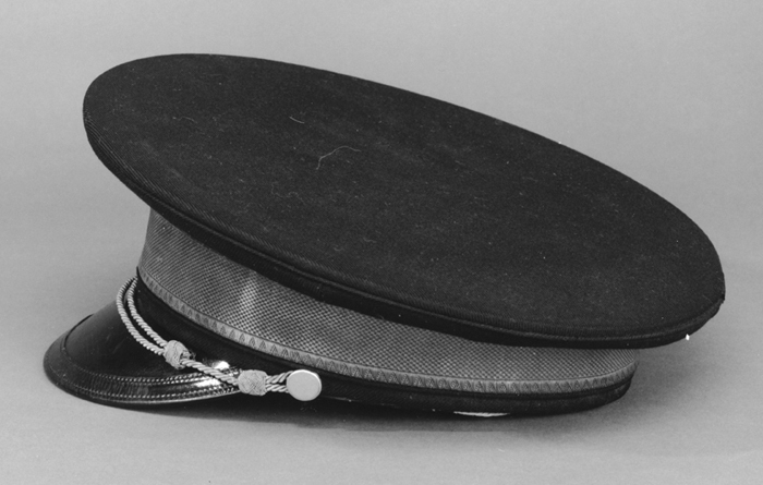 LIVRÉ Bestående av kappa och mössa. Kappa: av svart tjockt ylletyg samt med knappar av förgylld mässing jämte galoner. Dubbelknäppt i fyra rader. På vardera framstycket en ficka med konturerad klaff. Knappar stora, runda, tunna; på utsidan guldskrafferade fält i relief Hallwylska vapnet i nedtill konturerad rektangulär sköld under krona med nio kulor. Mitt bak sprund med fem små svarta klädda knappar. I ryggen slejf med två knappar. Runt krage samt ärmar tunna galoner i svart och guld. Satinfodrad. Längd ca. 132 cm. från kragen mitt bak. Mössa: Av svart ylle med läderskärm. Rundkullig med flat kulle och brett huvudband. Kring huvudbandet guldfärgad galon. På var sida om skärmen ett runt, förgyllt beslag, fungerande som fäste för ett snörmakeri i guldfärgad silketråd. Skärmens undersida i grönt. Svettrem av brunt skinn. Svart satinfoder. På kullens insida tryckt firmamärke i guld (M.E.A). Ovanpå detta en romboid plastbit fastsydd. Vidd 54 cm. Livrét använt av Karl (Johan Rikard) Råström (f. 21/2 1900) uppsyningsman på Hallwylska Museet, pensionerad 1970. (enligt uppgift av Eva Helena Cassel-Pihl)