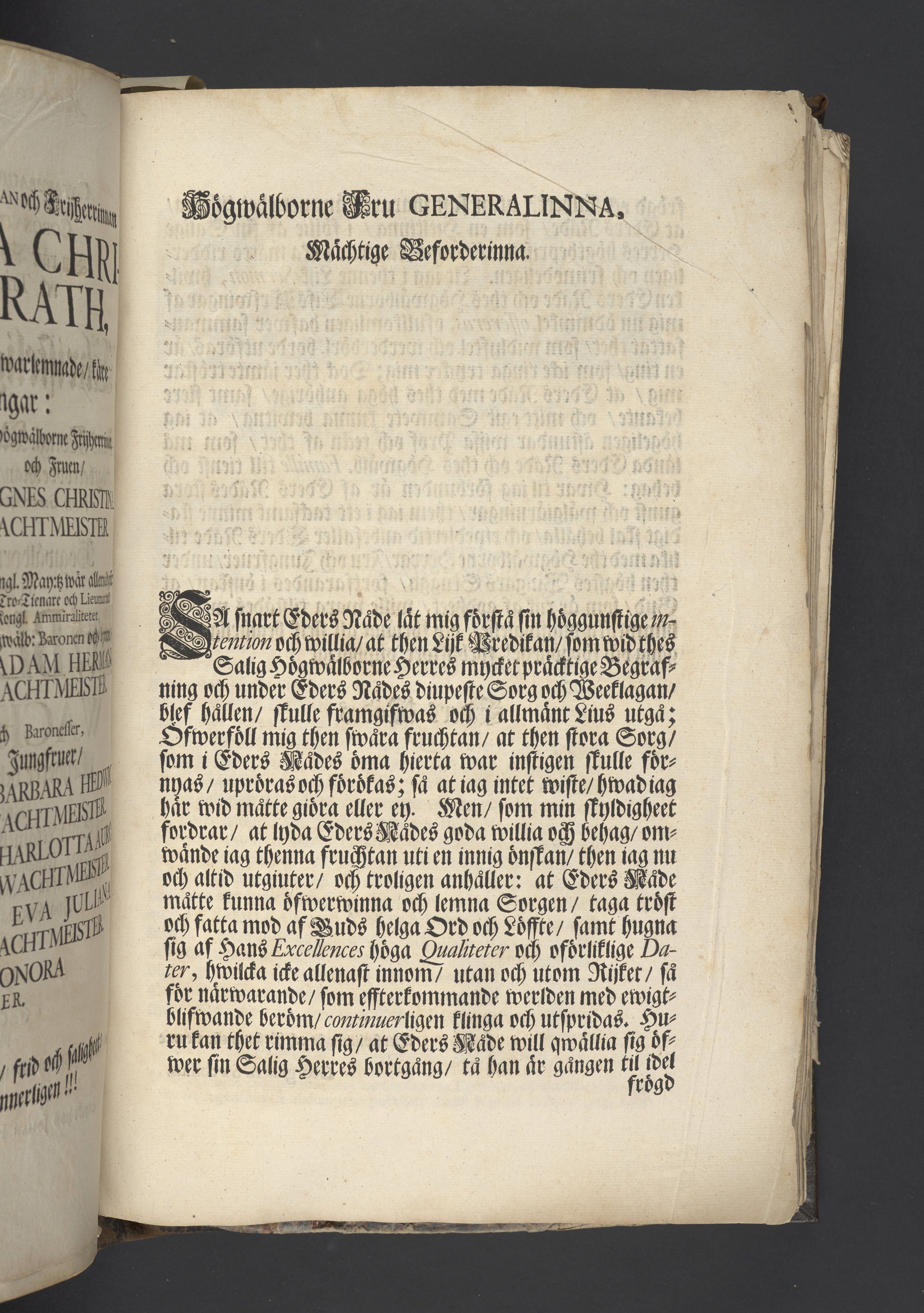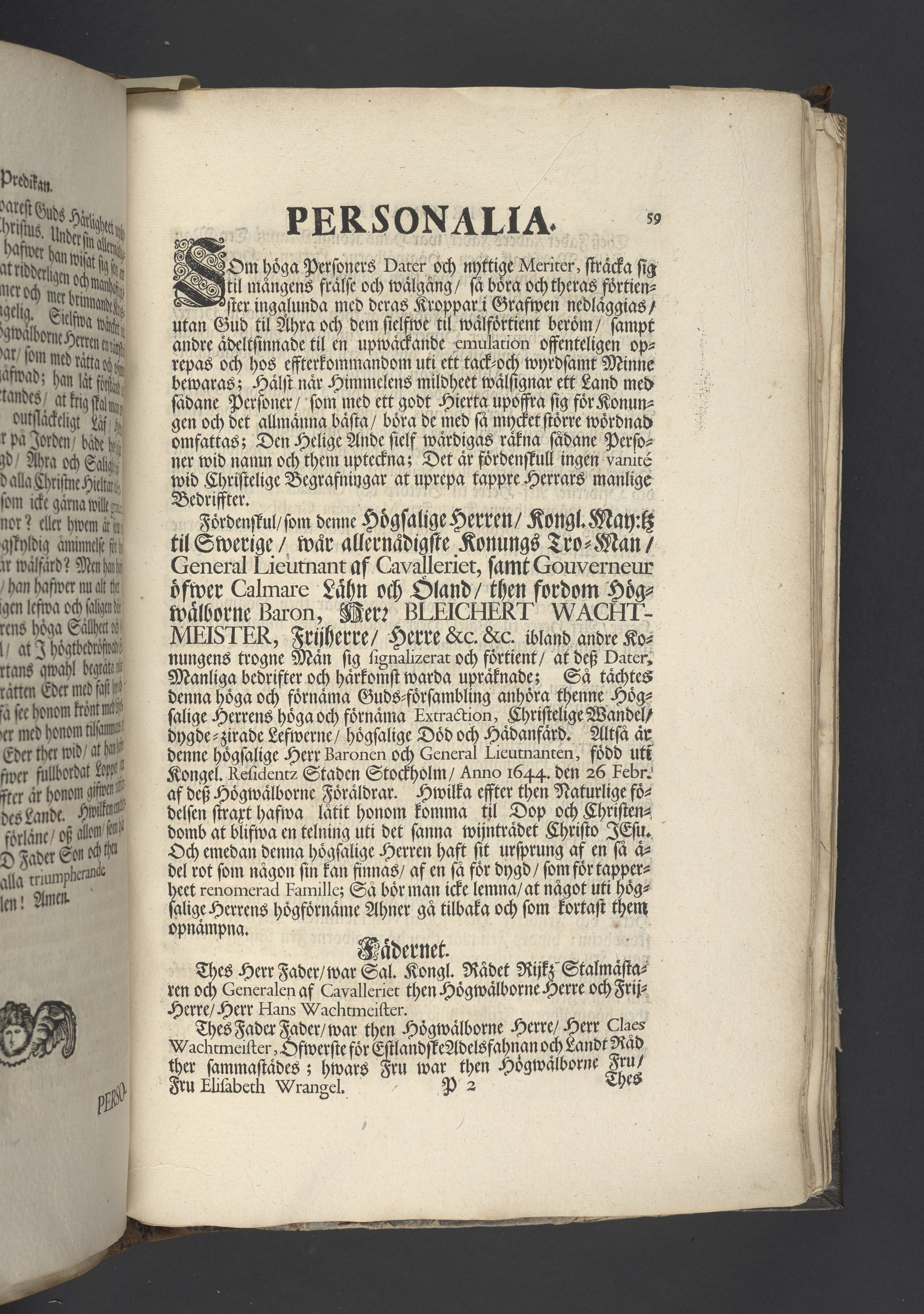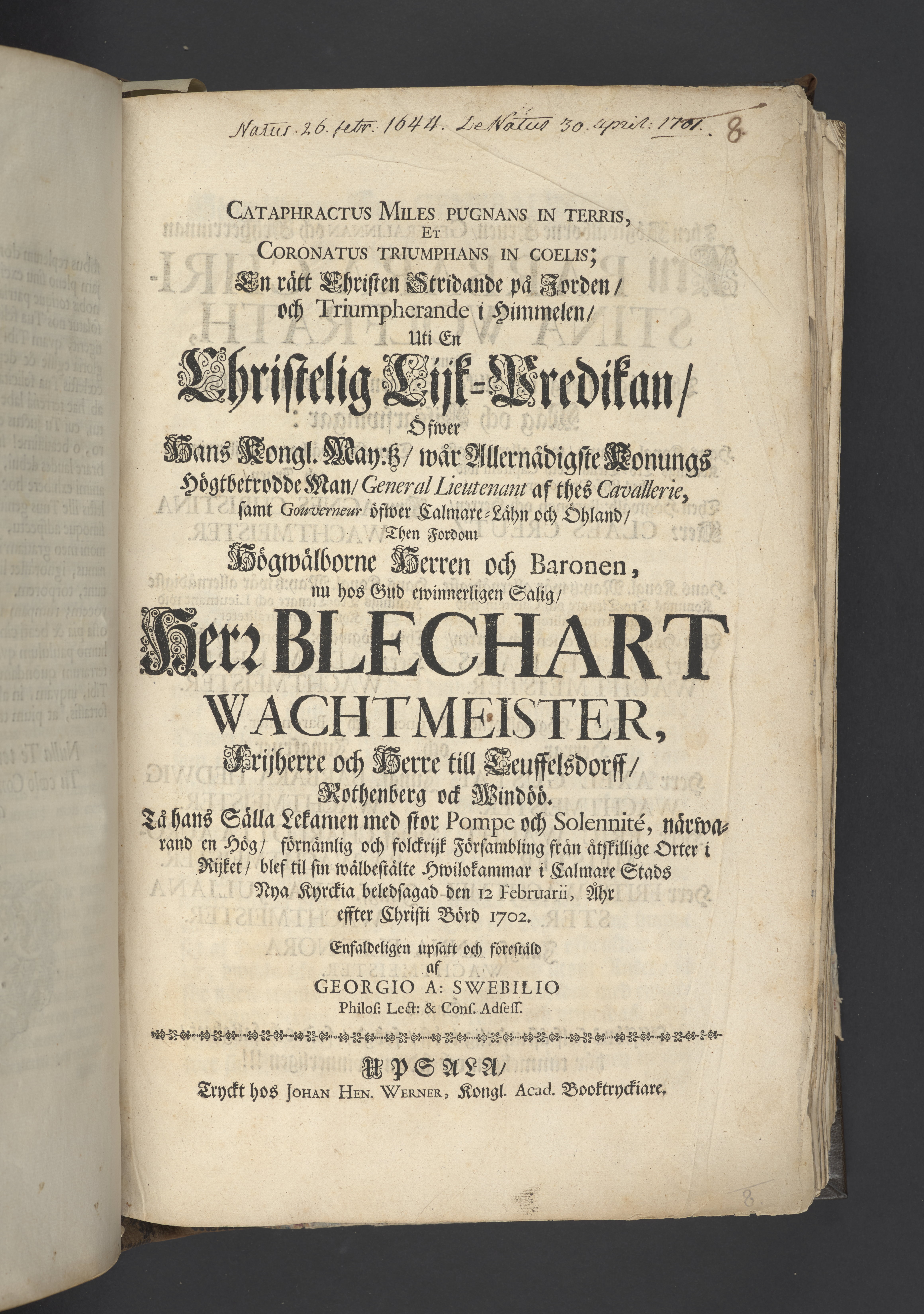 Cataphractus miles pugnans in terris, et coronatus triumphans in coelis; en rätt christen stridande på jorden, och triumpherande i himmelen, uti en christelig lijk-predikan, öfwer hans kongl. may:tz, wår allernådigste konungs högtbetrodde man, general lieutenant af thes cavallerie, samt gouverneur öfwer Calmare-lähn och Öhland ... nu hos Gud ewinnerligen salig, herr Blechart Wachtmeister ... Tå hans sälla lekamen med stor pompe och solennité, närwarand en hög, förnämlig och folckrijk försambling från åtskillige orter i rijket, blef til sin wälbestälte hwilokammar i Calmare stads nya kyrckia beledsagad den 12 februarii, åhr effter Christi börd 1702. Enfaldeligen upsatt och förestäld af Georgio Swebilio ... Upsala, tryckt hos Johan Hen. Werner, kongl. acad. booktryckiare.