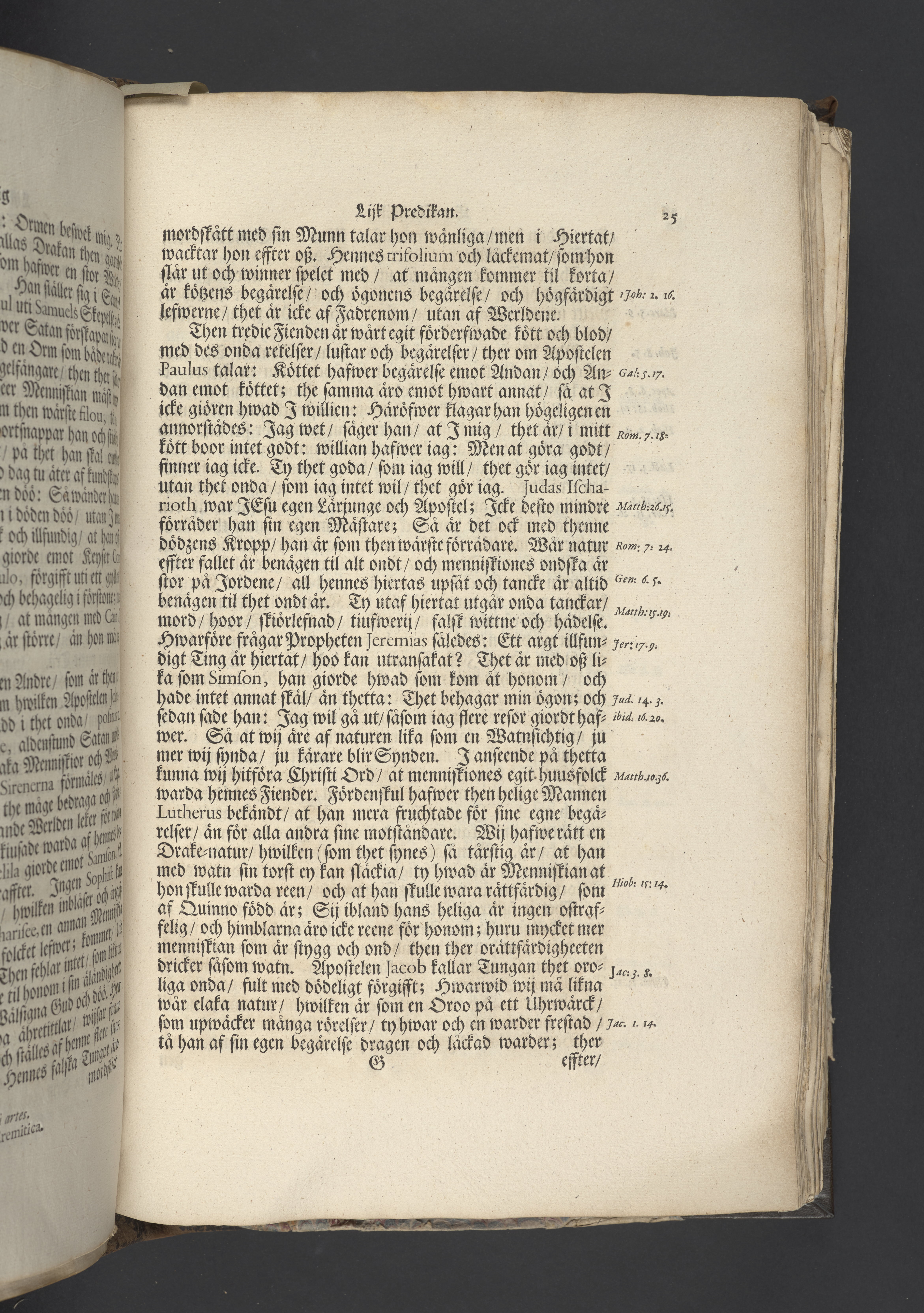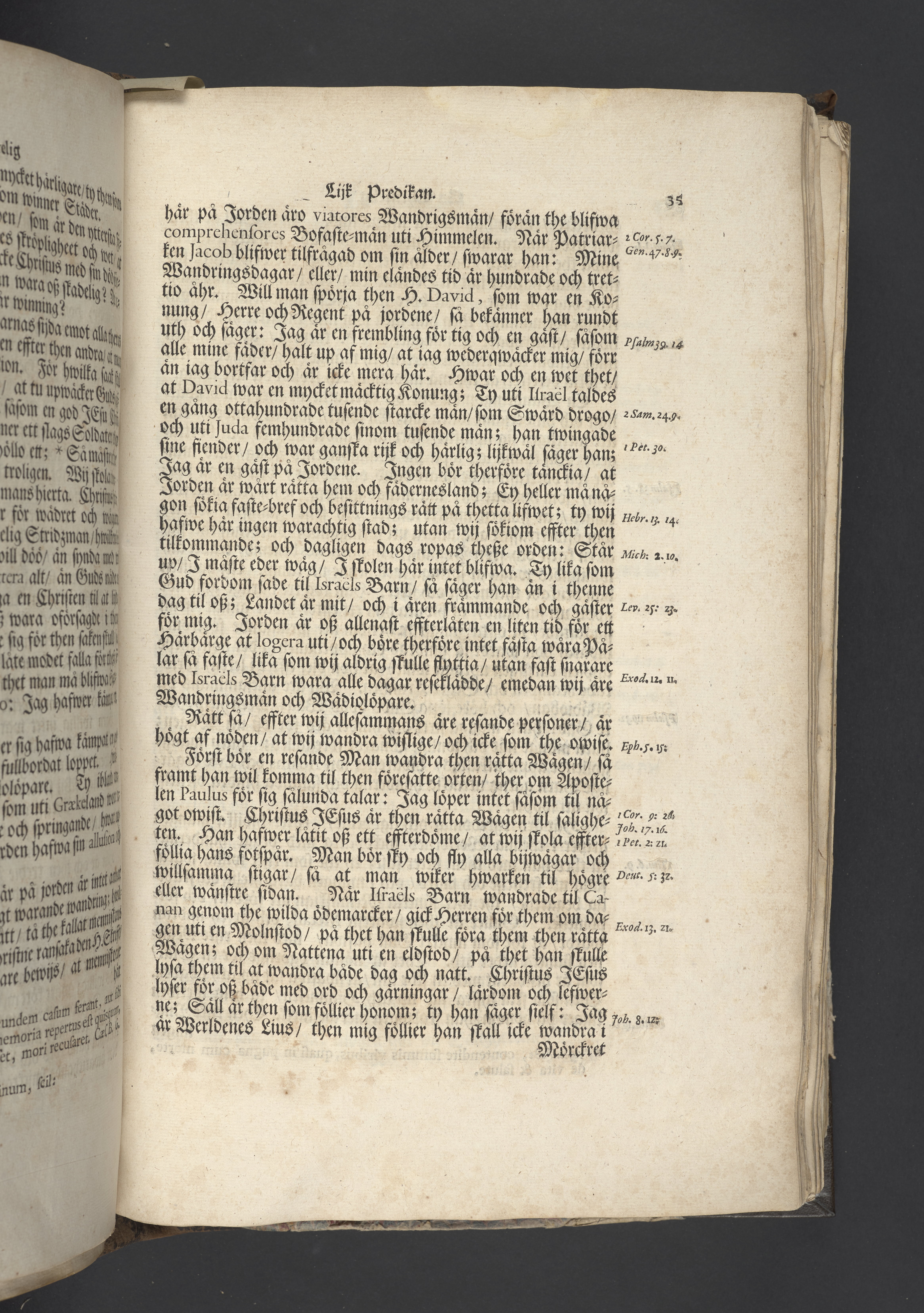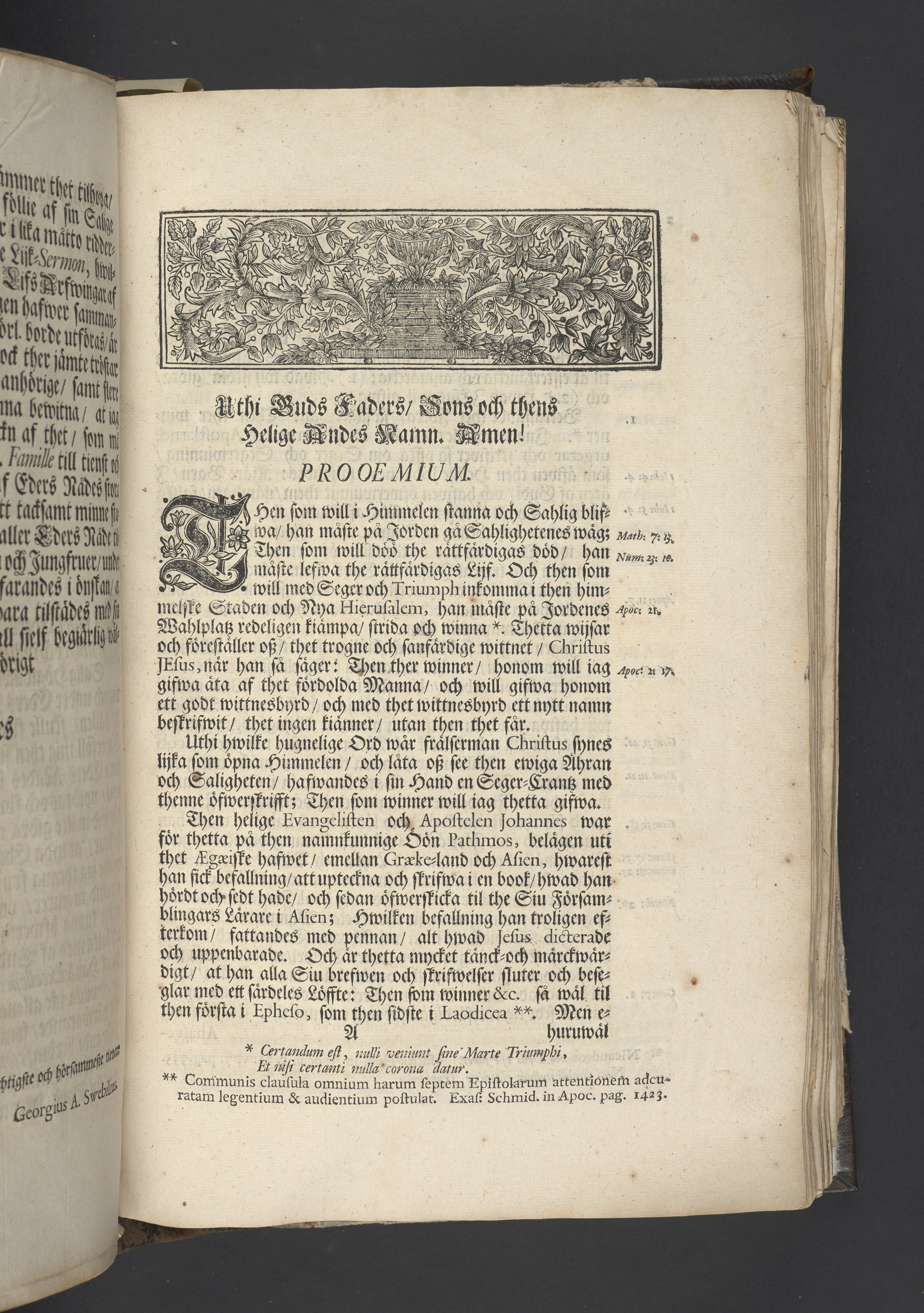 Band m. pärmar av marmorerat papper, rygg och hörn av pergament. Pärmfyllnad: trä.
