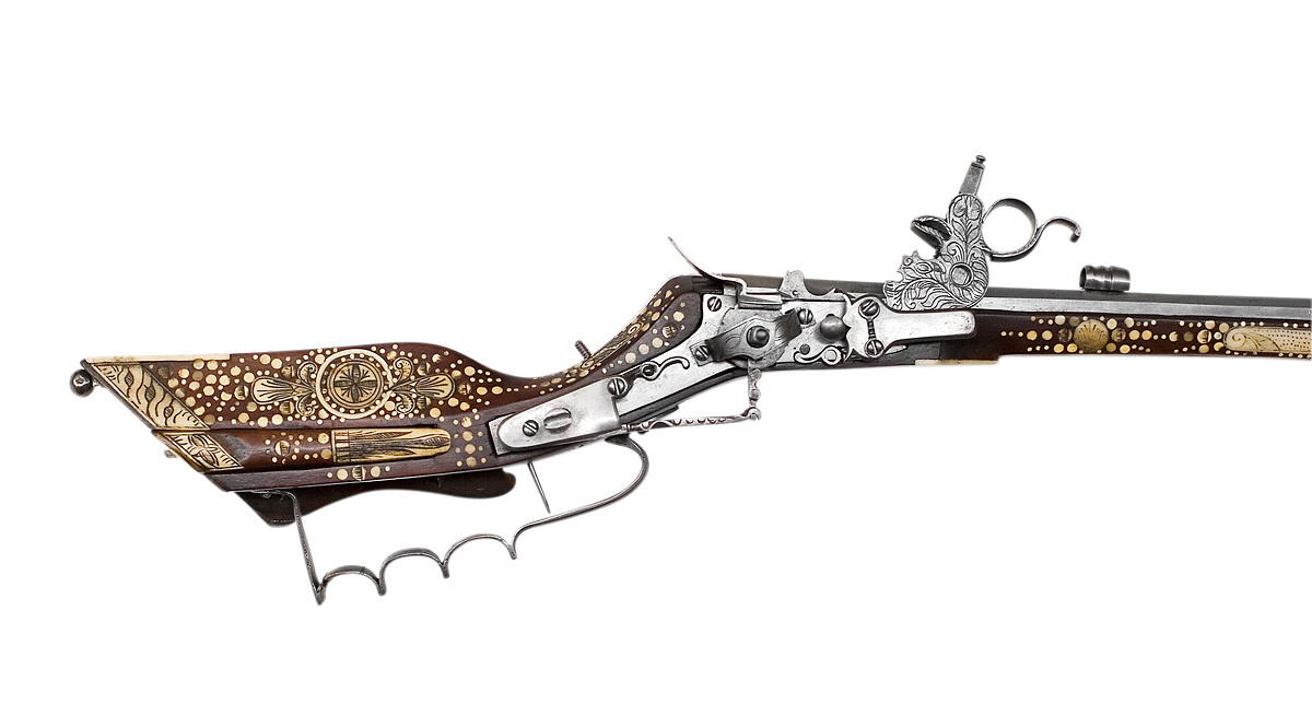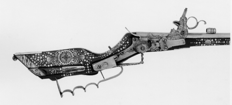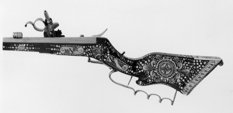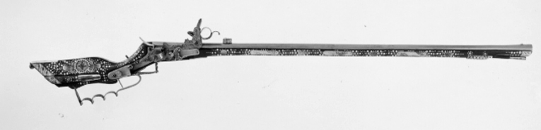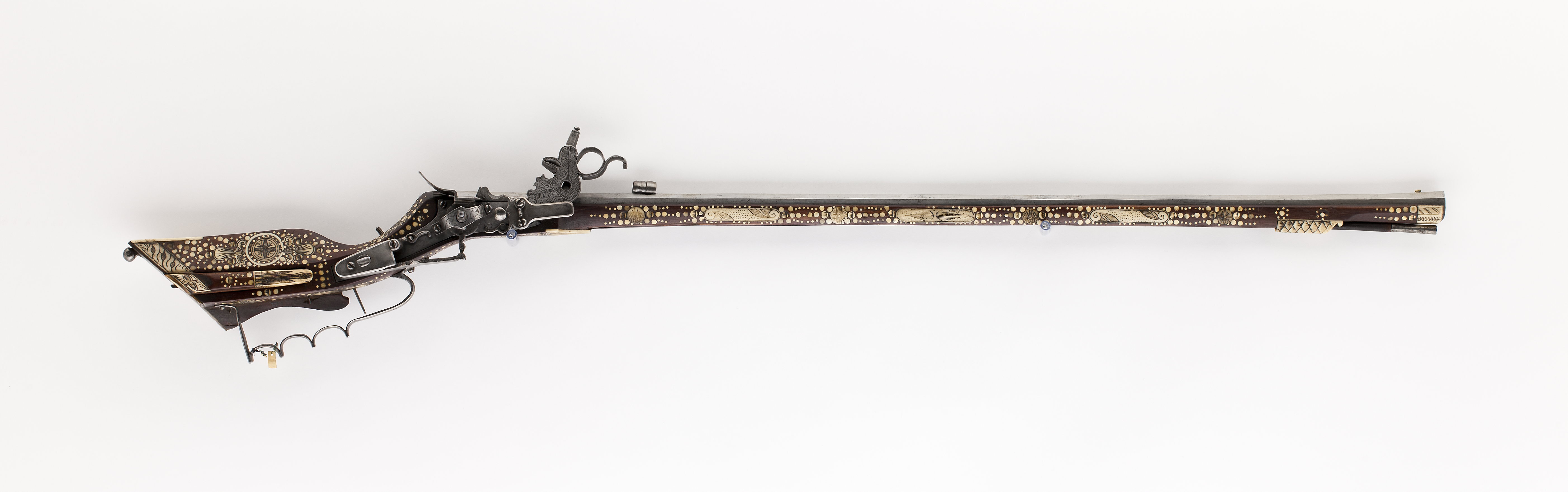 Åttsidig, slätborrad pipa, förstärkt vid mynningen. Riktmedel: Rörsikte, solsikte av stål, från sidan inlaxat stolpkorn av mässing. Fästning: Pipan fäst med krysskruv underifrån (främre varbygelskruven) samt tre pipstift av ben. Hjullås av Teschitz-typ, slätt låsbleck av stål, l: 185 mm, utanpåliggande hjul och slagfjäder. Hjulbrygga av stål med enkel, graverad slingdekor. Hane med lös överkäke, stor, profilerad, genombruten skärm mellan kropp och underkäke, mindre skärm på överkäken, över hela ytan blom- och slingdekor. Ringformigt fingergrepp med något nedåtböjd främre arm. Fängpannelock med rörlig arm, graverad dekor. Triangulär, s-formigt bakåtböjd eldskärm. Över slagfjäder och hanfjäder släta stålbleck med fasade kanter, hanfjäderblecket med profilerad kant. Två tryckknappar, den ena med runt, välvt, den andra med ovalt huvud med skålning tvärs över. Fästning: Två låsskruvar. Rak, smal avtryckare. Avtryckarbleck av graverat ben. Helstock av valnöt, Teschitz-typ. Inläggningar och beslag av graverat ben i form av blommor och punkter. Bakplåt av horn, kolvknapp av stål. Kolvlådelock av stockens trä (ursprungligt?), två beslag och punkter av ben. Två låsskruvbleck, två rörkor samt näsband av graverat ben. På insidan av kindstödet två småbyglar av stål. Varbygel av stål med tre fingerlägen. Tillbehör: Svärtad laddstock av trä, l: 900 mm, i framänden en stålskoning.