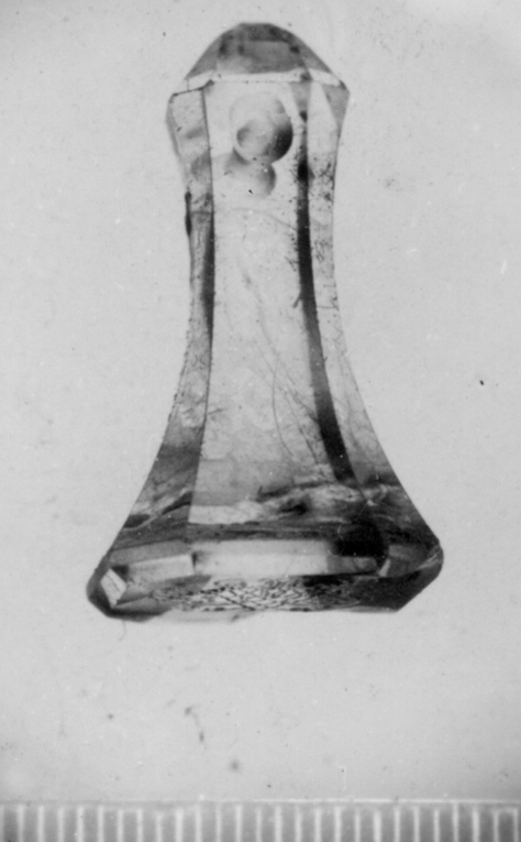 Rektangulär platta med fasade kanter och avtagna hörn, däri graverat namnchiffer, spegelmonogram under furstehatt. Fyrsidigt, pyramidformigt, uppåt något breddat skaft med fasade kanter. Tvärgående hål.