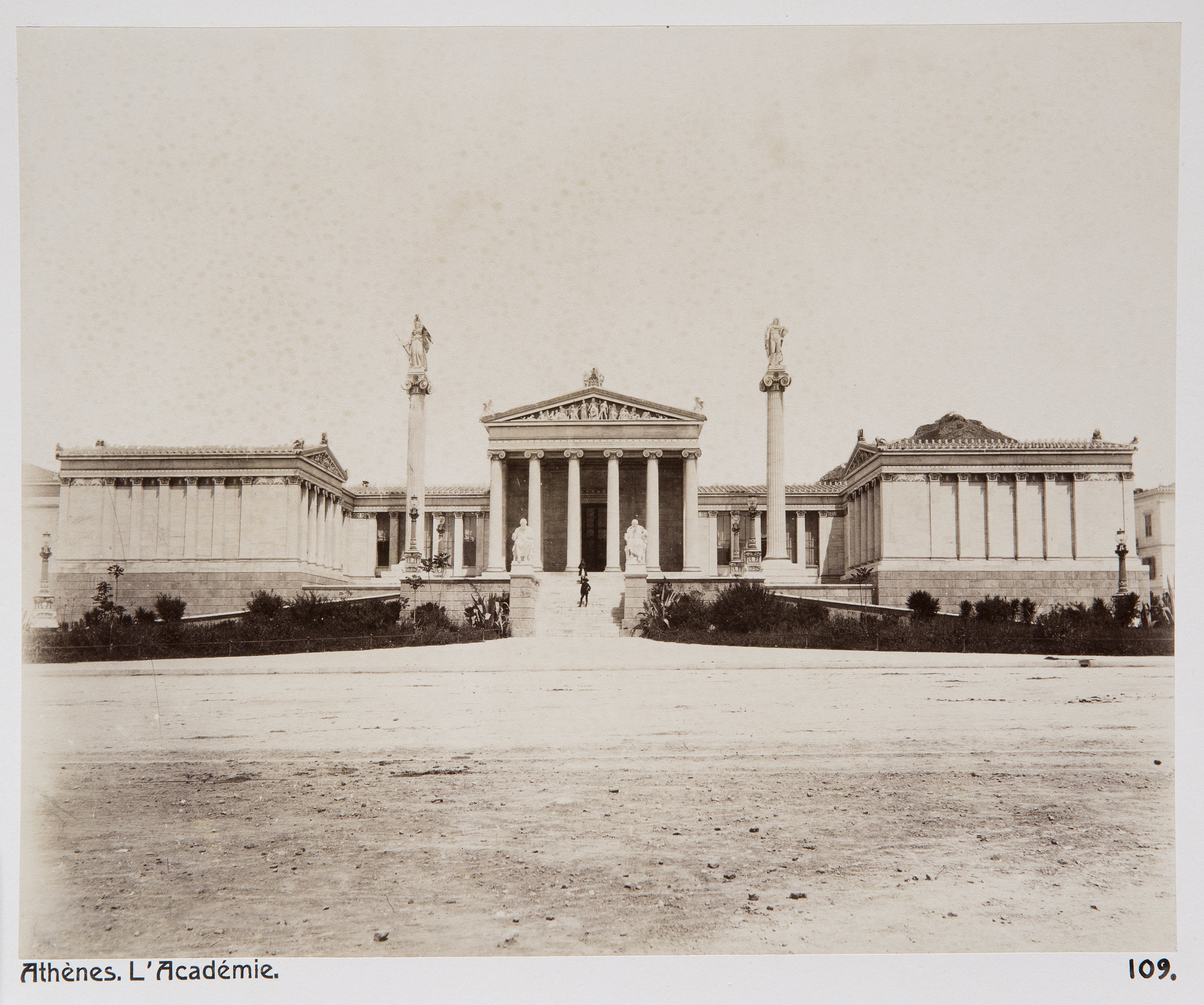 Akademien i Aten, Grekland. Text på originalet: Athènes. L´Académie. Foto från resa genom Grekland, Makedonien och Serbien, 15 mars-6 juni 1896. Fotografierna LXVI:K.18.-147. är köpta av Wilhelmina von Hallwyl, f. Kempe på Korfu samt i Patras, Nafplion, Aten, Thessaloniki och Belgrad. Med på resan var maken Walther von Hallwyl och fröken Ida Uhse. Uppgifterna kommer från Ida Uhses reseanteckningar.
