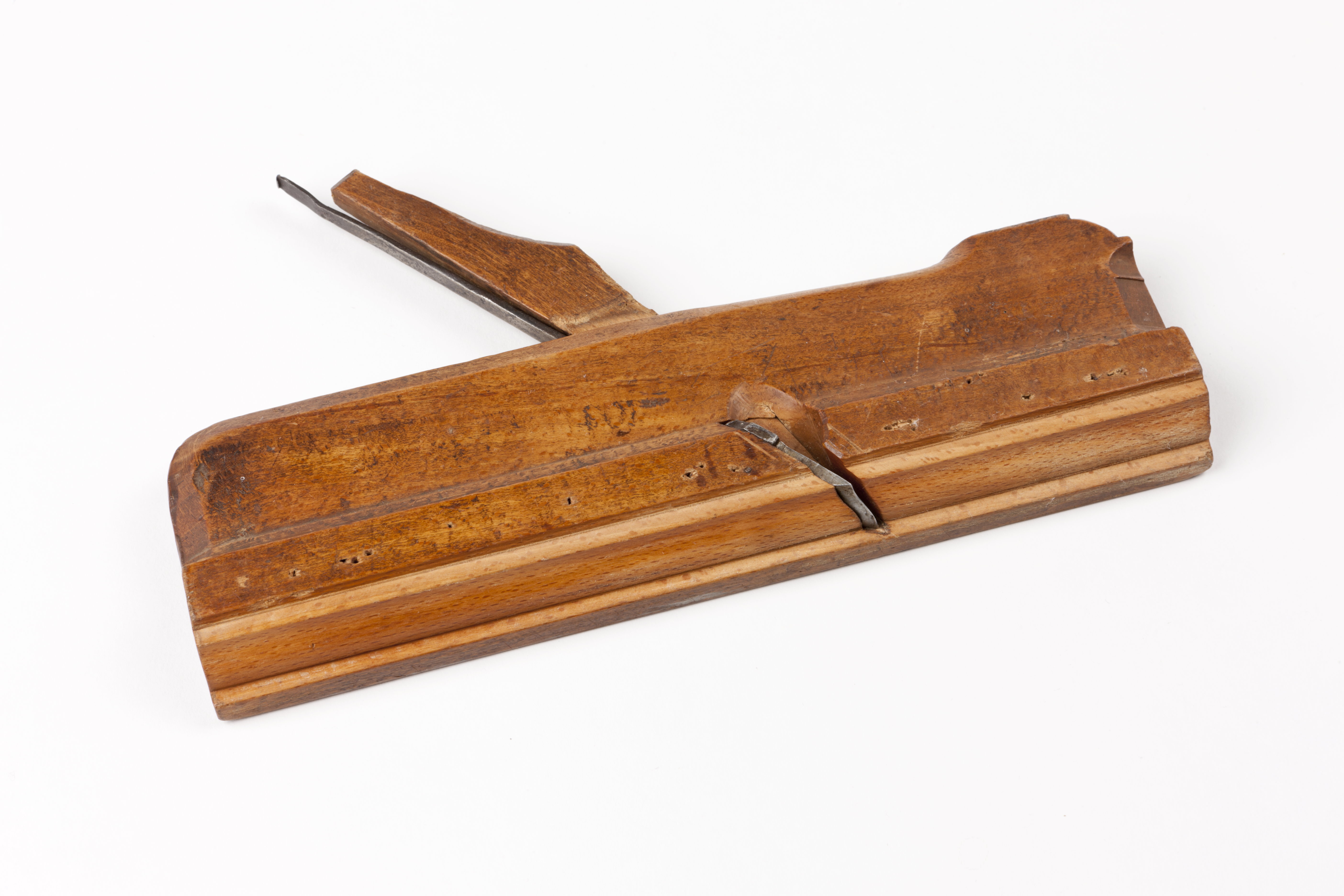Holländsk standardhyvel. På översidan grunt tumgrepp. Kanisformad profil. Eggens bredd: 19,3 mm. Järnet stämplat ofullständigt slaget "H", möjligen "T" , stocken: "I:A". På stockens framsida skrivet "917" (?) med blyerts.