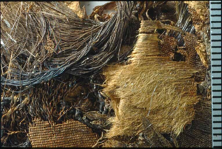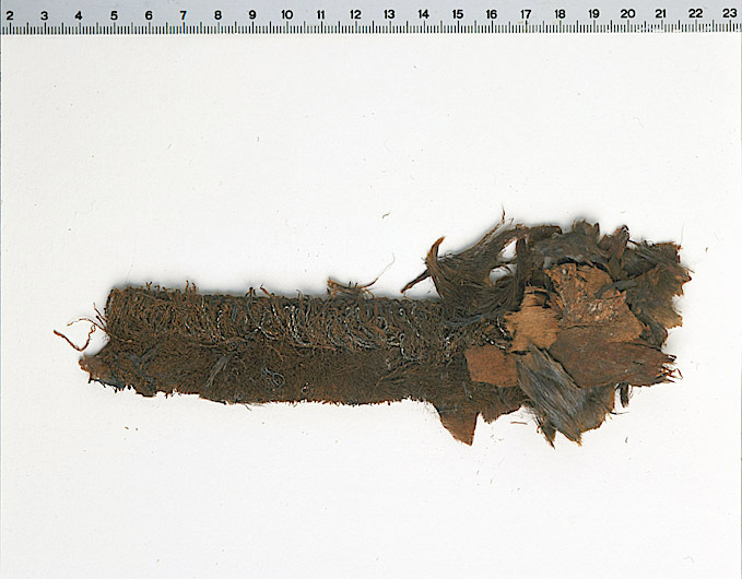 Fragment av fransband och hermelin från manteln. Påträffat vid fotänden av kistan. De ursprungliga färgerna delvis förändrade, fragmentet numera i brunt. Fragmentet ingår i en samling fragment tagna som prov ur drottning Kristinas kista vid gravöppningen den 13-14 december 1965. Manteln: Varp: Eventuellt har varptrådarna svag s-snodd. Trådtäthet: 72 trådar/cm. Inslag: Parallellt liggande fibrer, saknar snodd. Trådtäthet: 26 trådar/cm. Material: Silke. Teknik: Varprips, fr. gros de Tours. Kommentar: Taften sitter på fransens baksida. Förmodligen samma som fragment nr 32976, 32978, 32988. Nuvarande färg är brun. Frans: Varp: 2-trådigt silke i z-snodd. Trådtäthet: Ca 40 trådar/cm men det är mycket svårt att säga då väven är mycket tät. Inslag: Många (okänt antal) trådar av 2-trådigt silke i s-snodd. Trådtäthet: 3 trådar/cm samt 2 stycken metalltrådar som ligger på både avig- och rätsidan, metalltråden bildar en ögla i fransen. Material: Silke och metalltråd. Inga metallanalyser är gjorda. Teknik: Bandet i fransens överkant är vävt i varprips. Metalltråden är bunden på 3 punkter. Kommentar: Densamma som 32976 och 32978. Fransen är fastsydd mot ovanstående taft med förstygn av silke. Fransen sitter inte fast med pälsfragmenten. Nuvarande färg är brun Päls och manteln: Rester av päls, både ljus och mörk, förmodligen hermelin sitter mot taftrester. Varp: 2 -trådigt silke med svag s-snodd. Trådtäthet: 66 trådar/cm. Inslag: Parallellt liggande fibrer, d vs ingen snodd. Trådtäthet: 30 trådar/cm. Material: Silke. Teknik: Varprips, fr. gros de Tours. Kommentar: Sitter ej ihop med fransen utan ligger löst ovanpå.