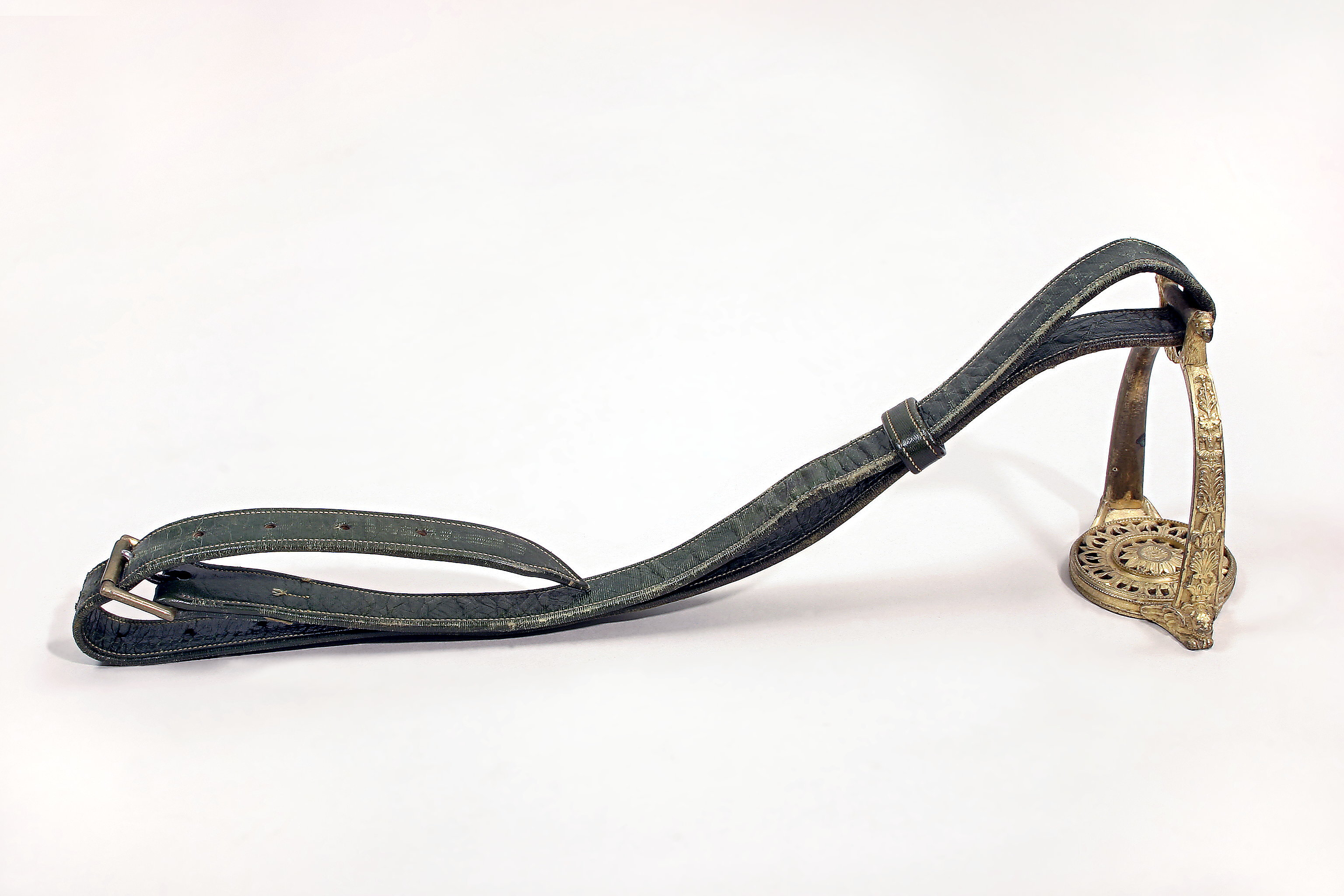 Stigläder av grönt läder med rektangulär sölja av förgylld mässing, med löphylsa.